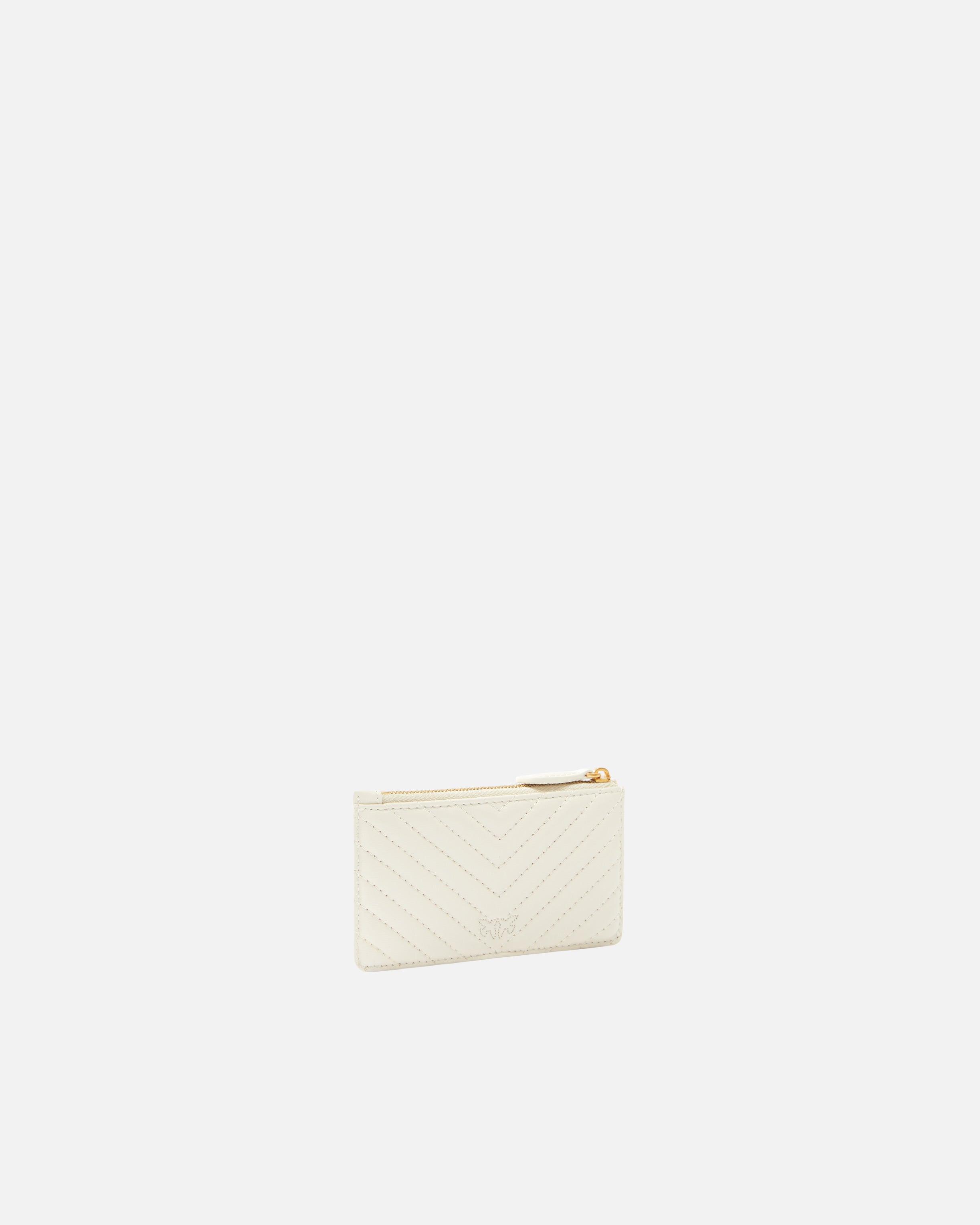 Quilted nappa leather card holder with chevron pattern. Customised with metal Love Birds Diamond Cut logo plaque. Polycotton-lined interior. Zip fastening.