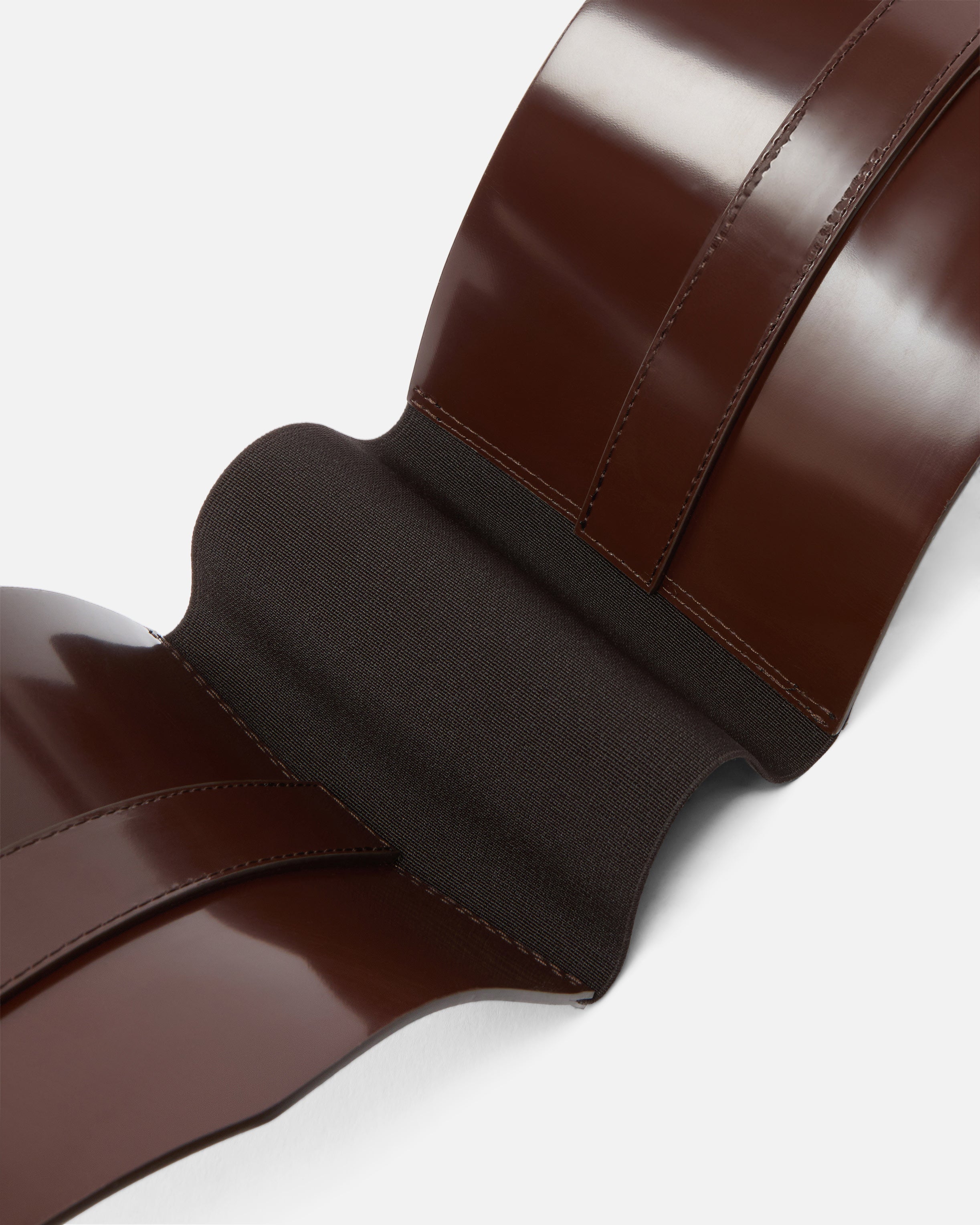 13-cm belt in soft polished leather, with a stretch insert on the back for a more comfortable and customisable fit. This accessory, which resembles the design of a corset, features a simple but striking buckle. Bold and modern, this accessory is the missing piece from your evening looks.