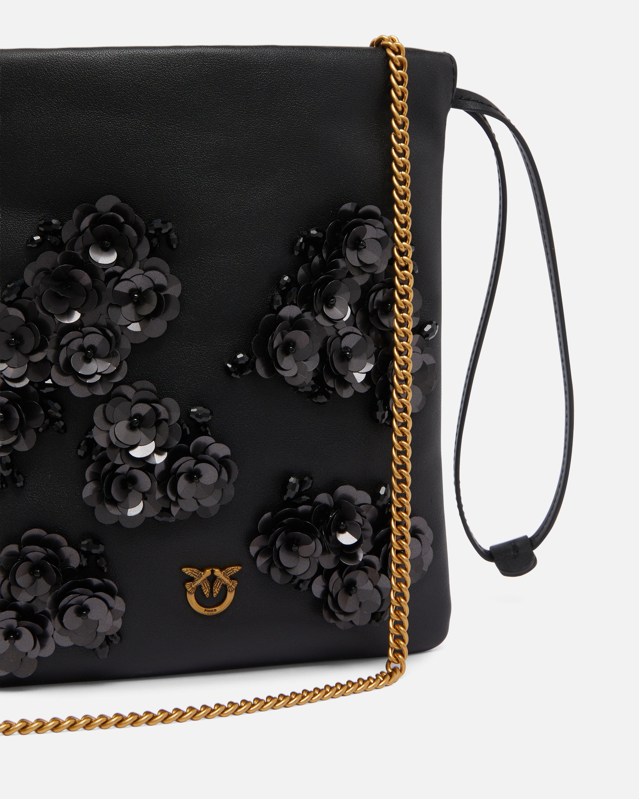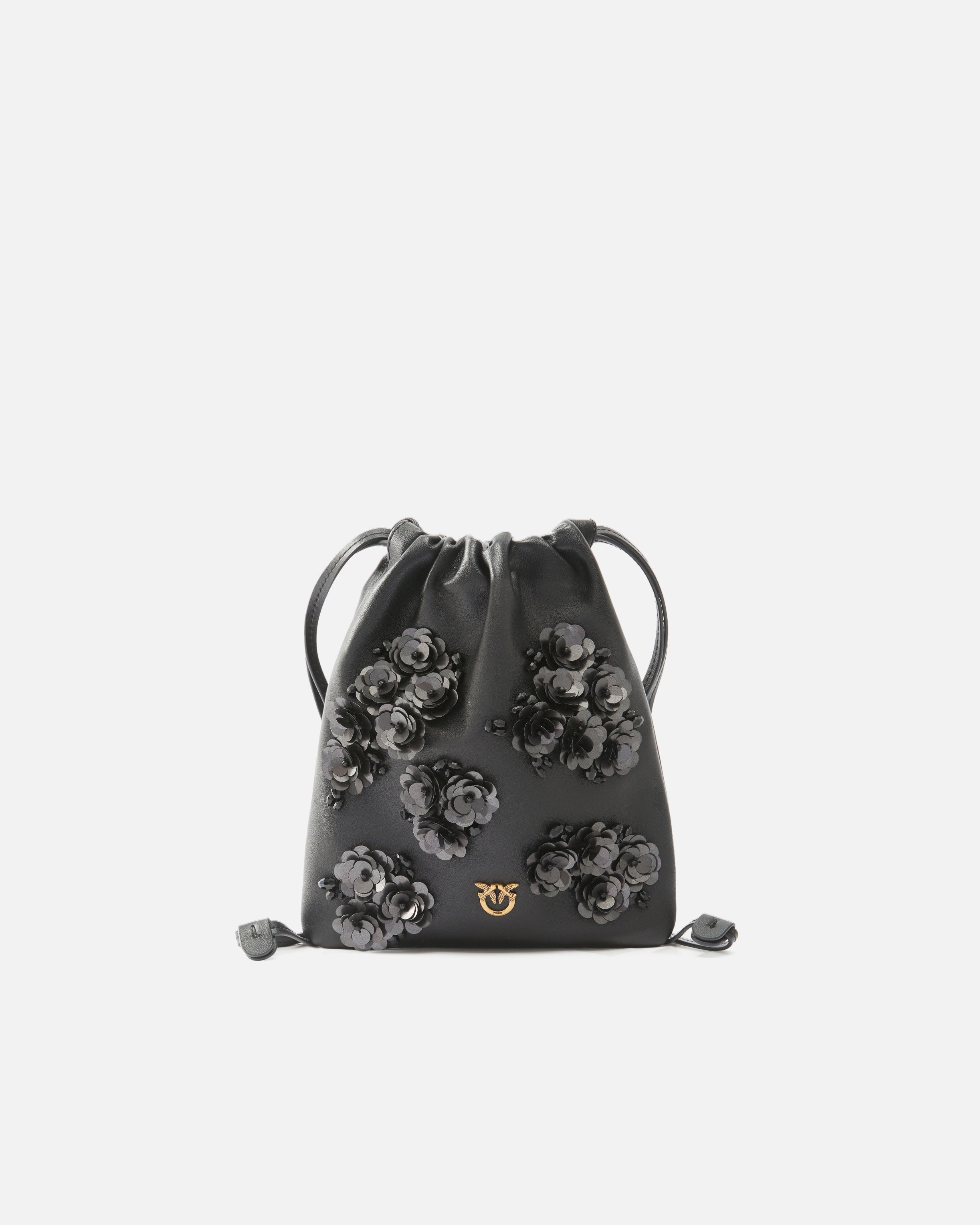 Small Slouchy Bag in leather with drawstring fastening to keep your essentials safe. Featuring a fixed chain shoulder strap shoulder or crossbody wear, this bag is highly refined and perfect for special occasions. The true star of this evening piece, however, is the original sequin flower jewel embroidery, accompanied by a small Love Birds logo plaque symbolising the brand's singular style. The accessory features a cotton drill-lined interior and a zipped slip pocket. Activate your PINKO accessory: verify the authenticity of your product and access a personalised experience by scanning the Love Birds embroidery on the back with your smartphone!