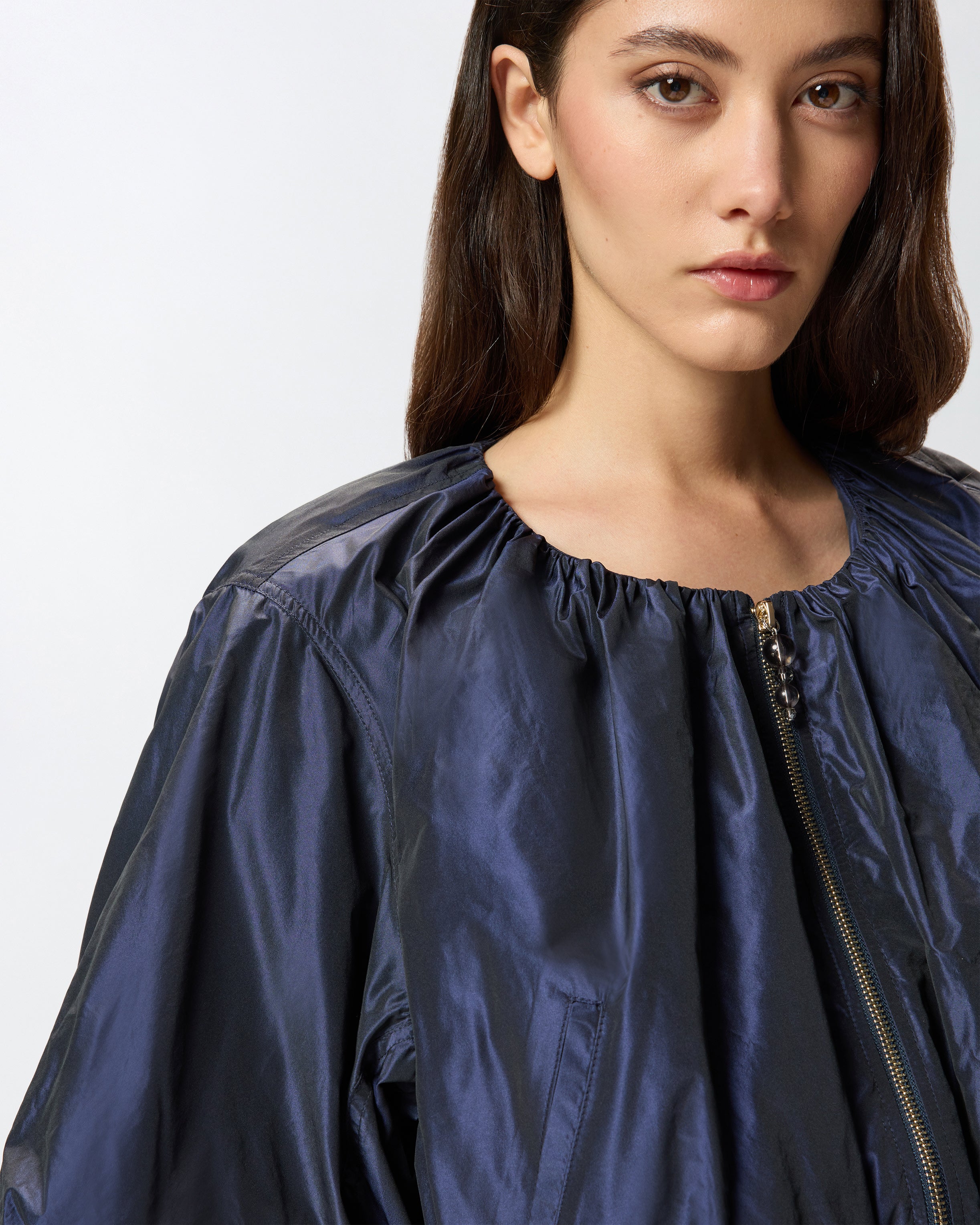 Bomber-style cropped jacket with a regular fit in taffeta, equipped with zip, short balloon sleeves to be extended up to three-quarters and elastic at the bottom. The fabric, light and shiny, creates iridescent reflections and blends perfectly with the soft and dynamic volume that distinguishes the garment. The studied cuts and contemporary lines of this elegant outerwear are enriched by distinctive details, such as the gathers on the crew neck.
