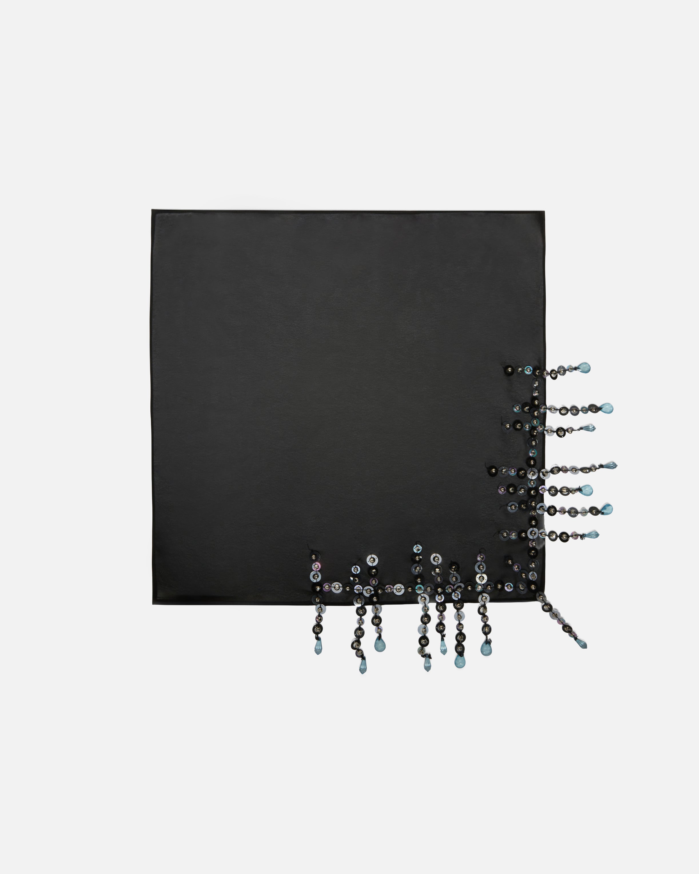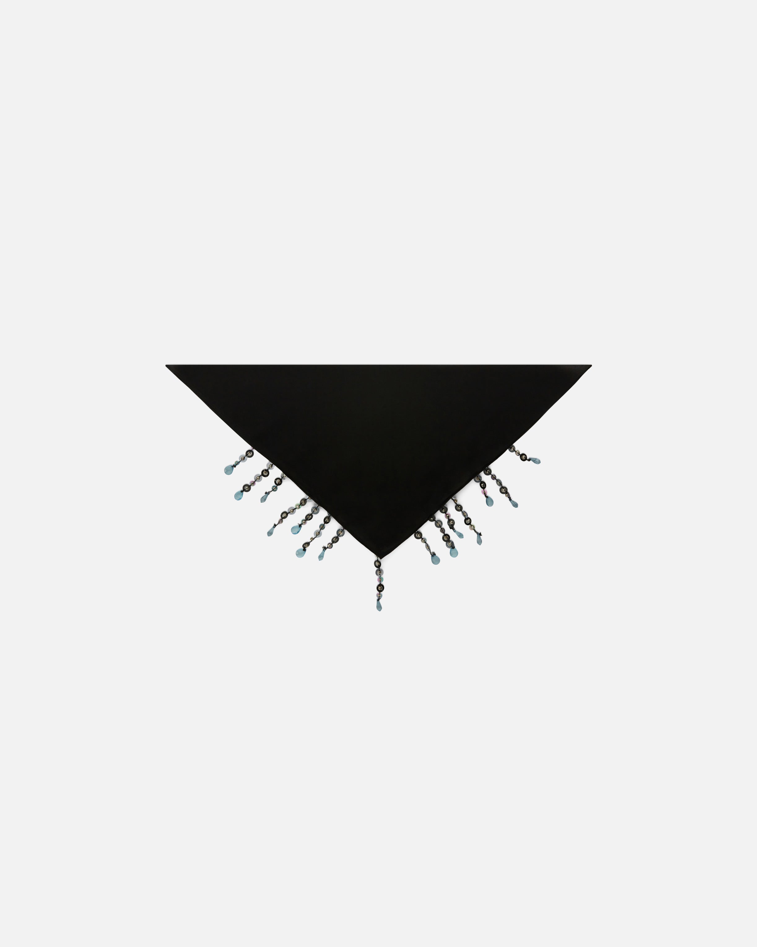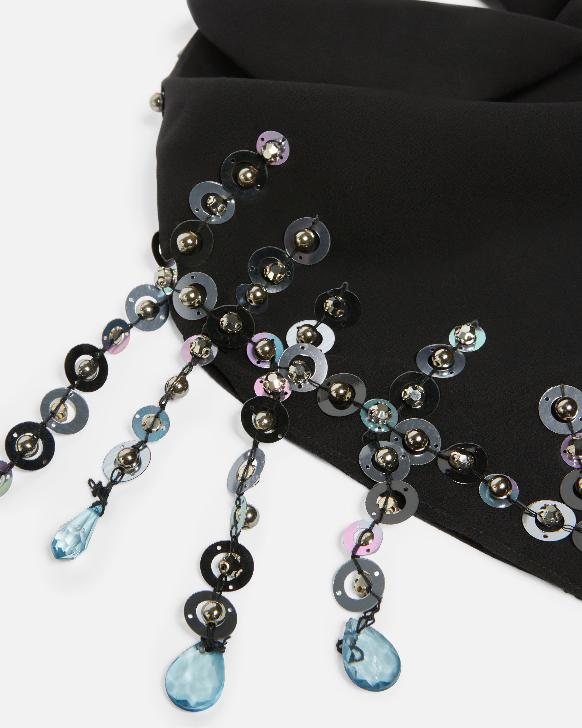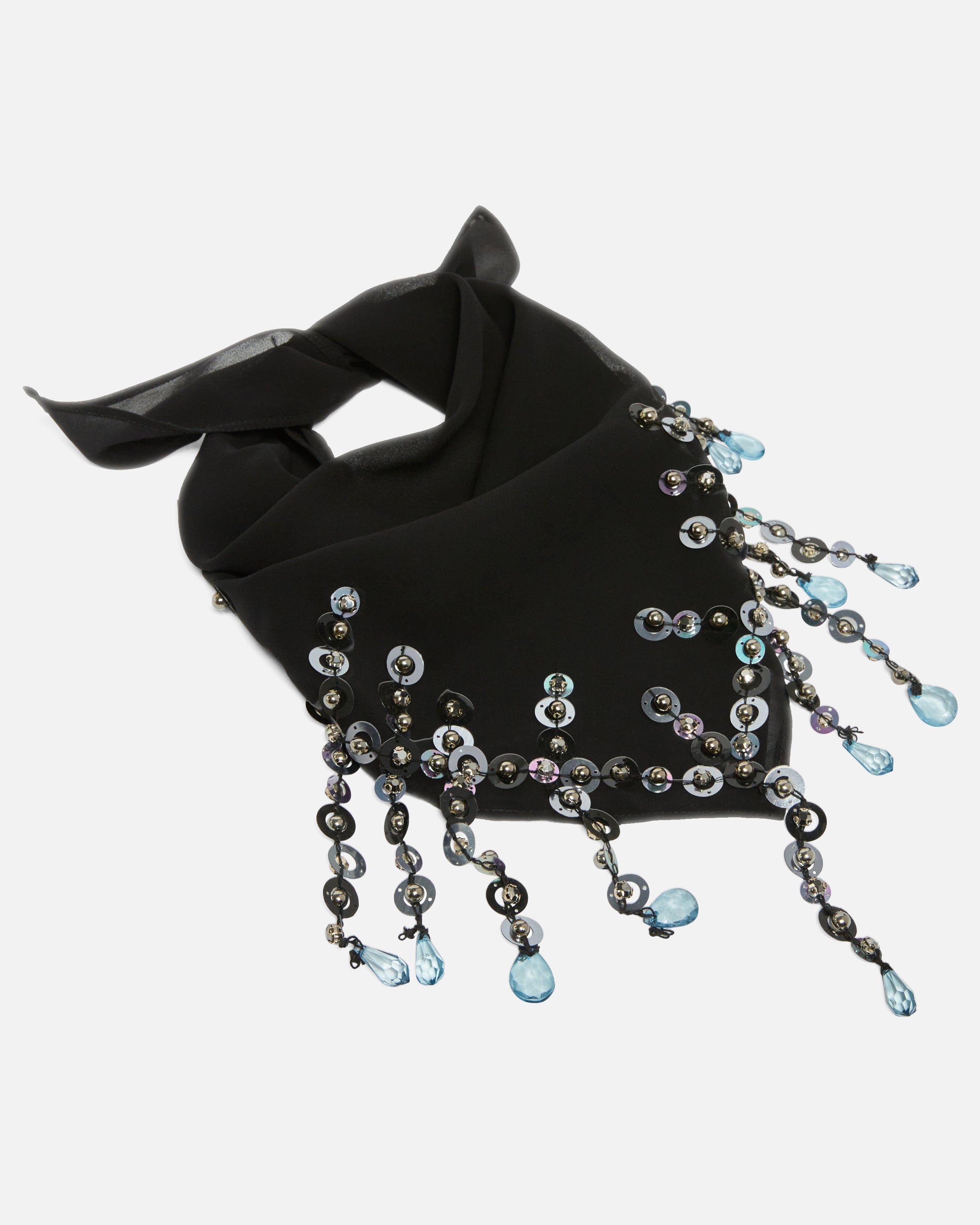 Light georgette bandanna embellished with round sequin embroidery with glass crystals and small metal spheres inside that create shiny shimmer in black and blue tones. The sequins, arranged along the edge of two sides, fall lightly and add a dynamic edge and movement in pure PINKO style. An accessory that exudes carefree elegance, perfect for brightening up your face and adding an original touch to your outfits.