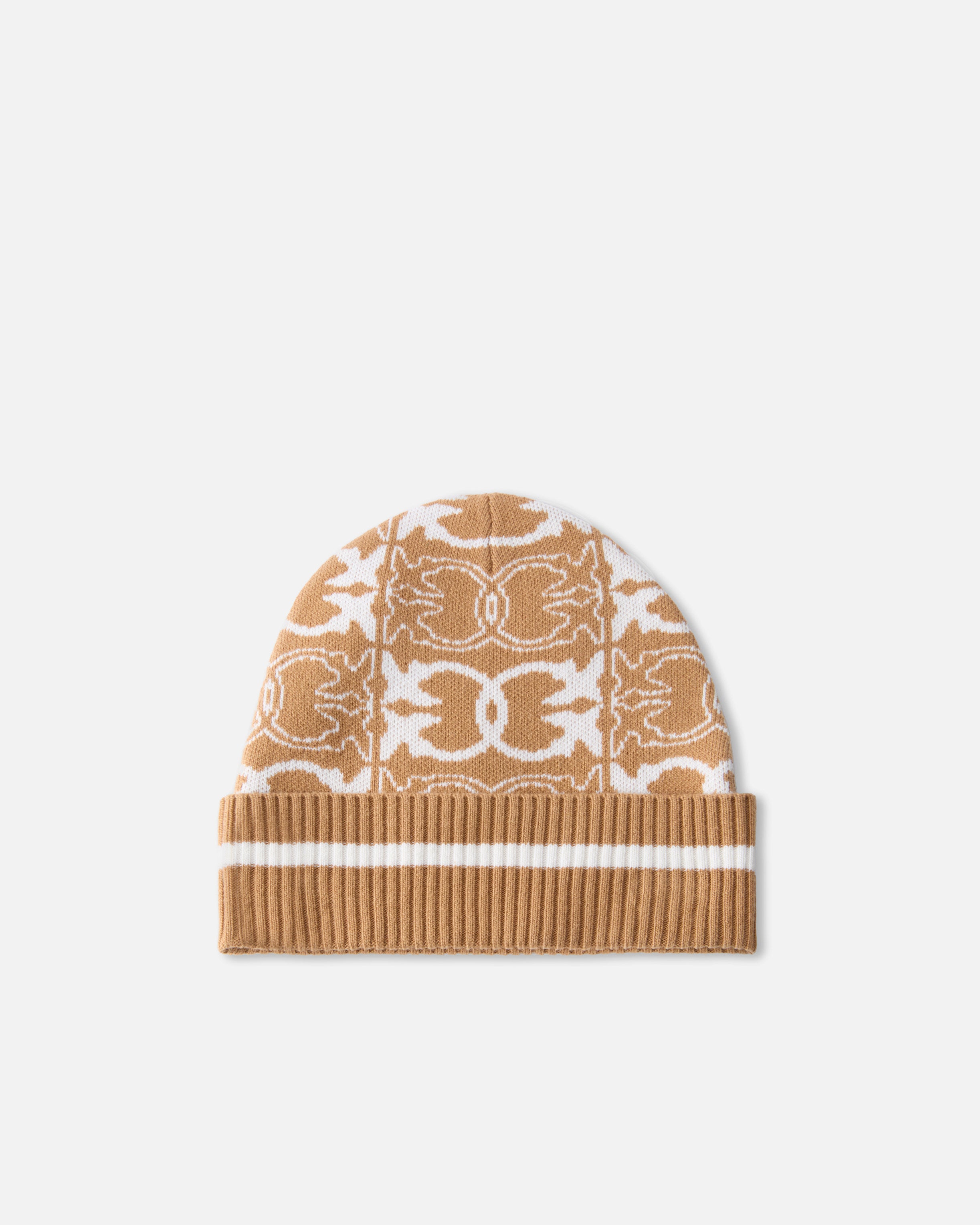 Beanie in knit viscose-blend fabric with ribbed cuff and contrasting all-over jacquard logo motif that symbolises PINKO's signature style. Protect yourself from the cold in style with this understated yet classy accessory, which gives any casual look the perfect finishing touch.