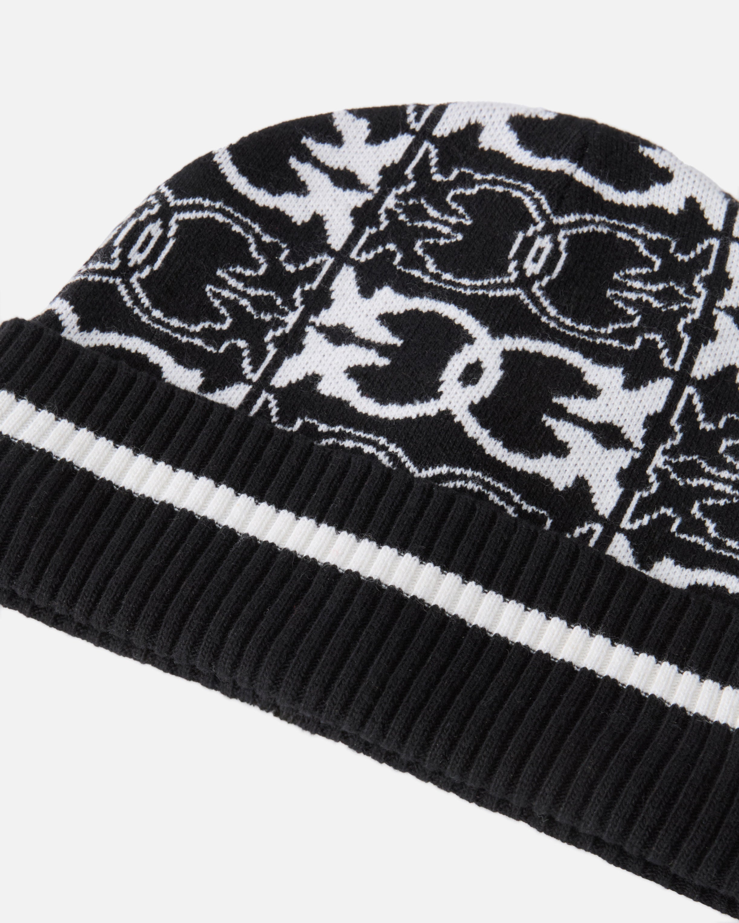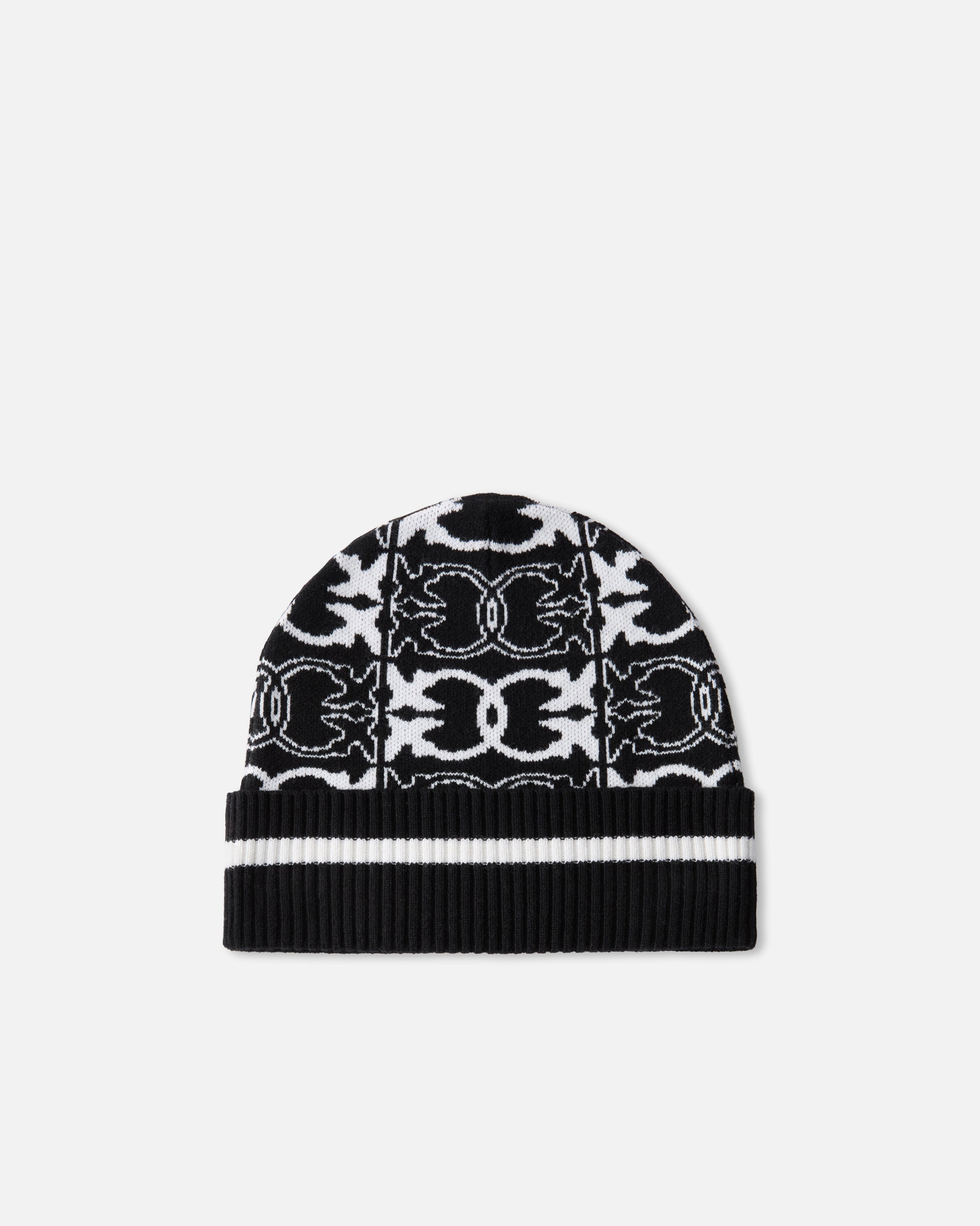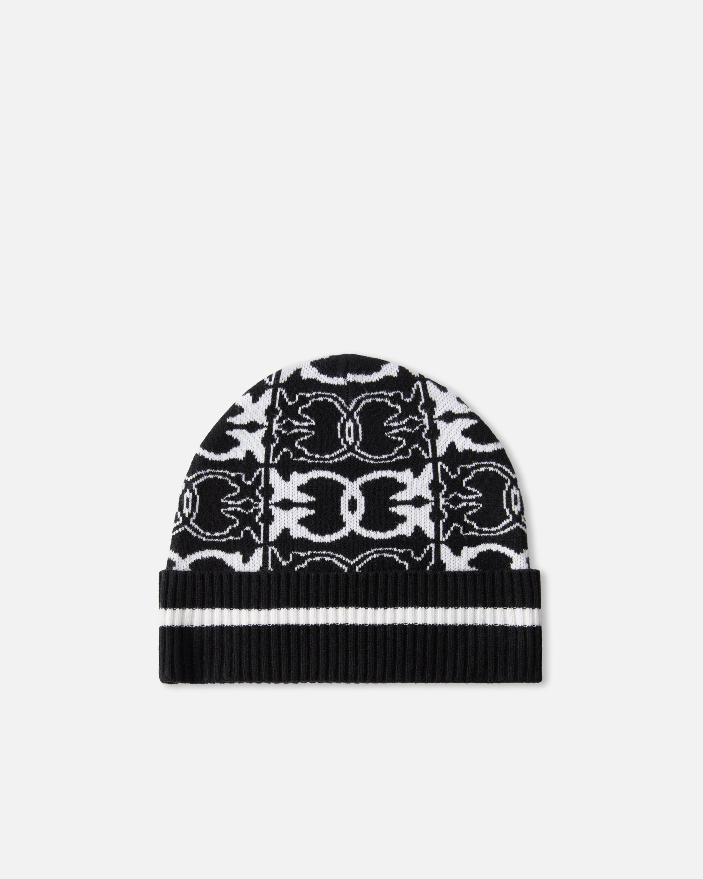Beanie in knit viscose-blend fabric with ribbed cuff and contrasting all-over jacquard logo motif that symbolises PINKO's signature style. Protect yourself from the cold in style with this understated yet classy accessory, which gives any casual look the perfect finishing touch.