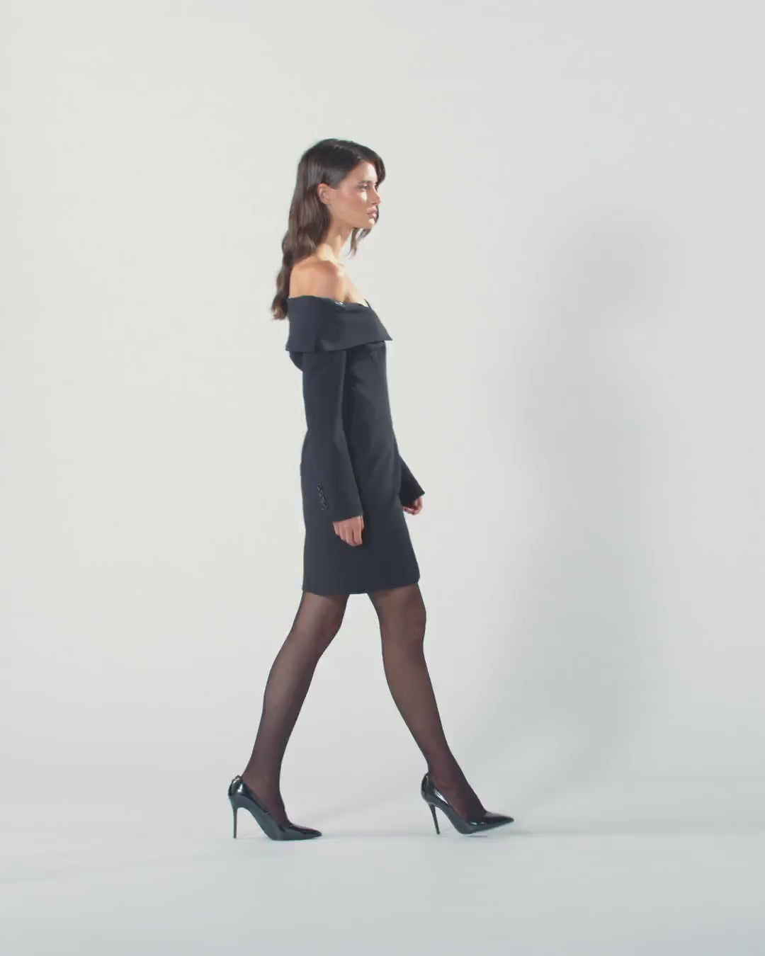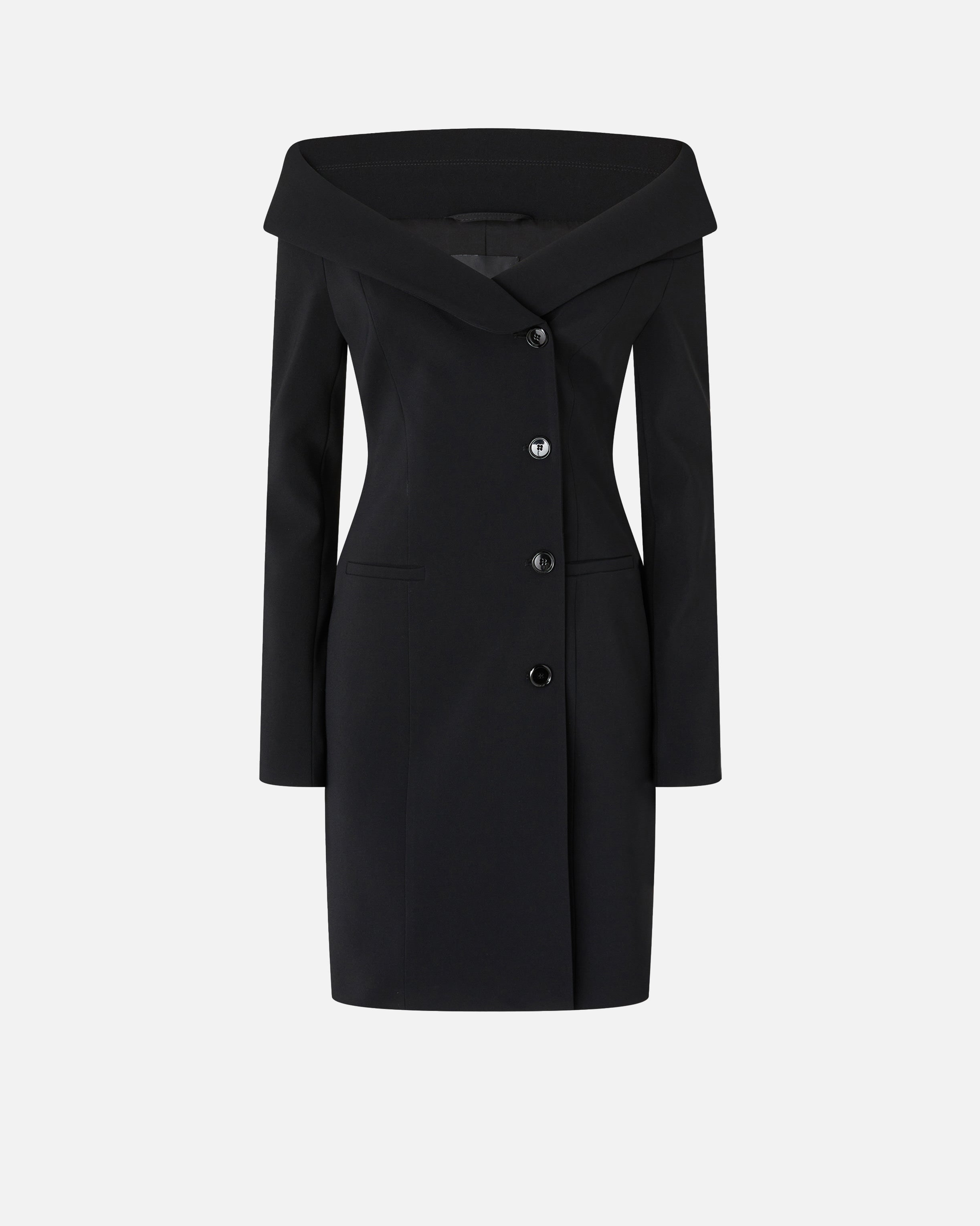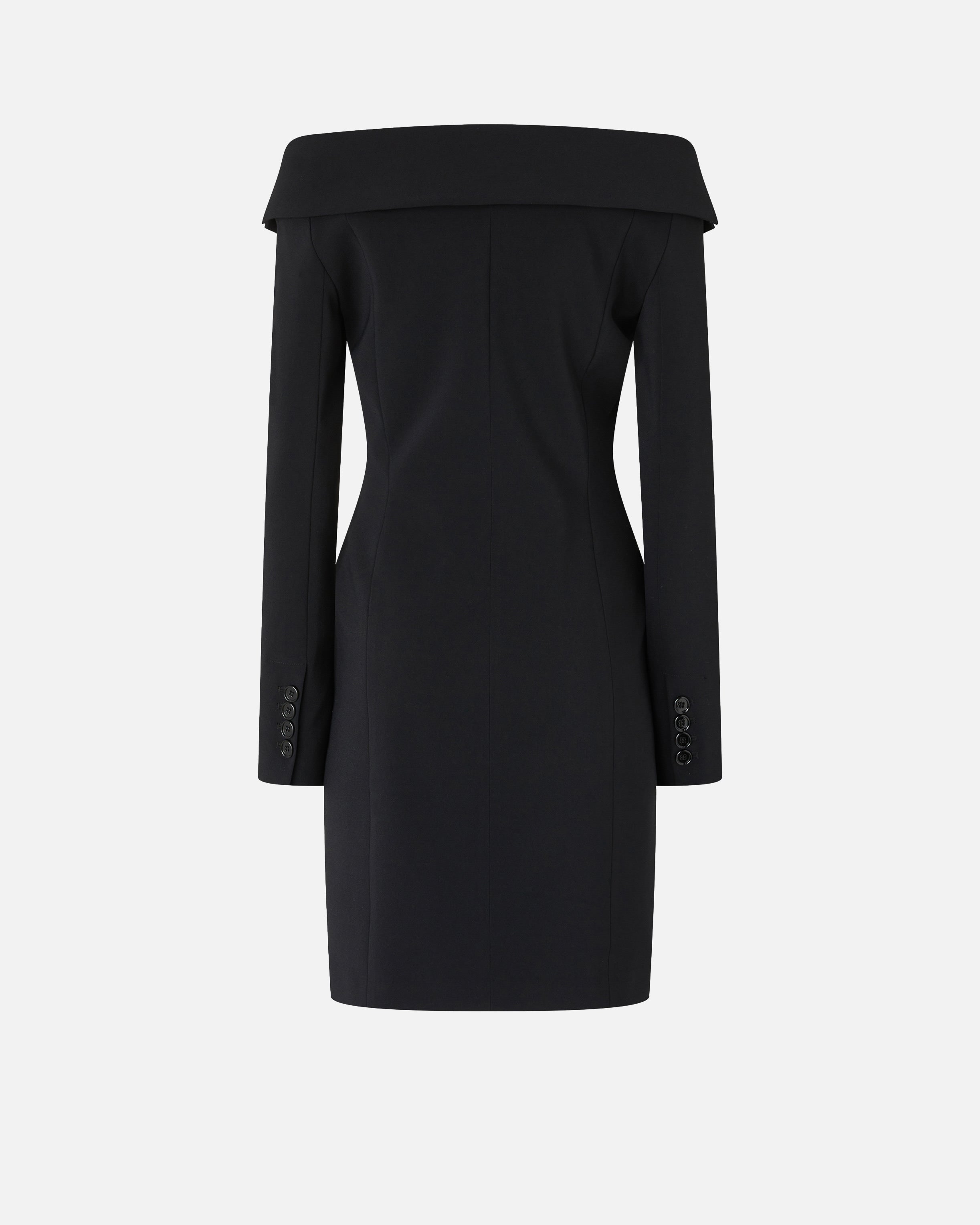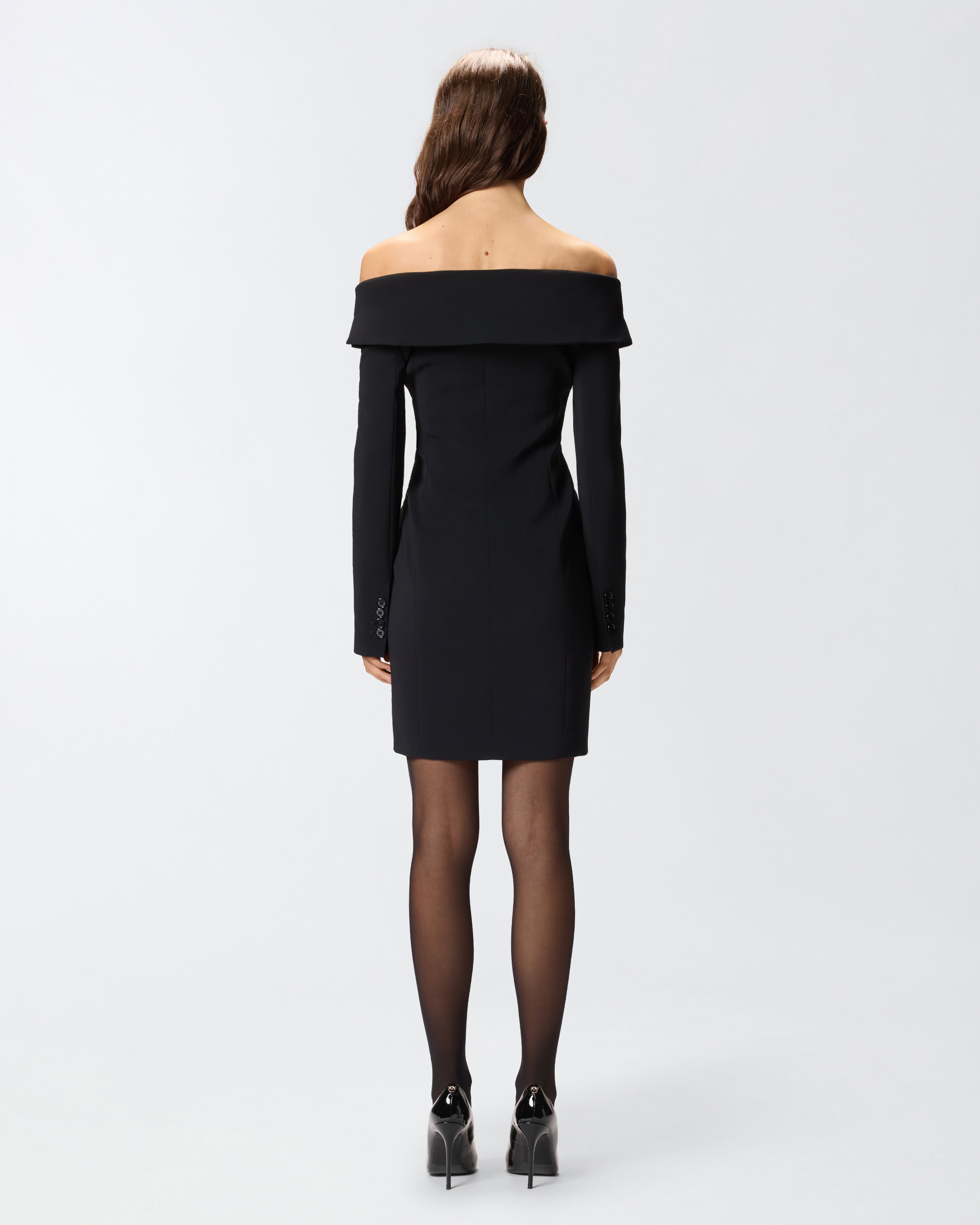 Slim-fitting, long-sleeved mini dress in figure-flattering stretch crepe fabric. The off-centre button placket, buttoned cuffs and side welt pockets are a clear nod to the classic blazer's design, while the wide neckline that leaves the shoulders uncovered gives the item a decidedly feminine touch: the end result is structured yet classy in style, like only PINKO knows how.
