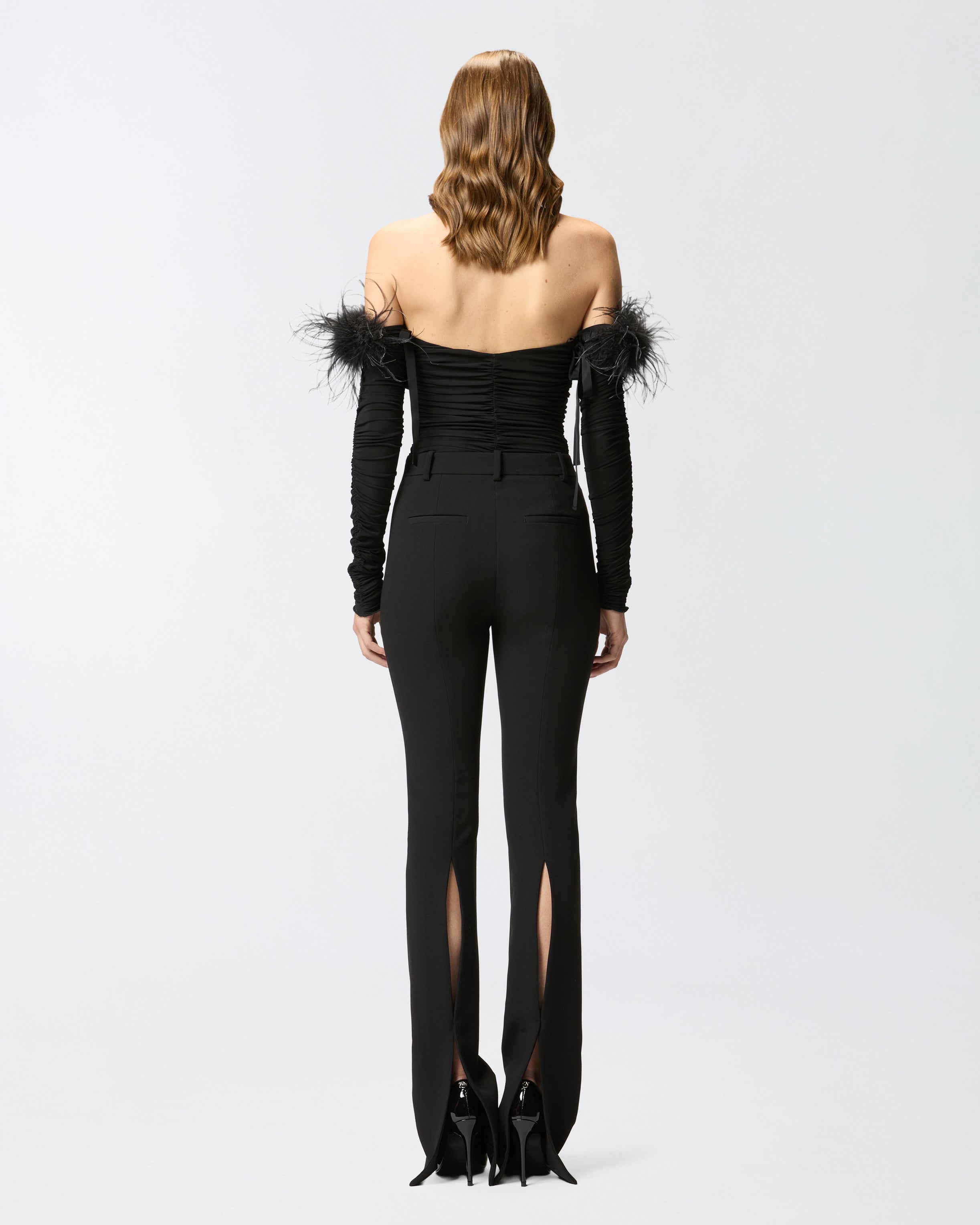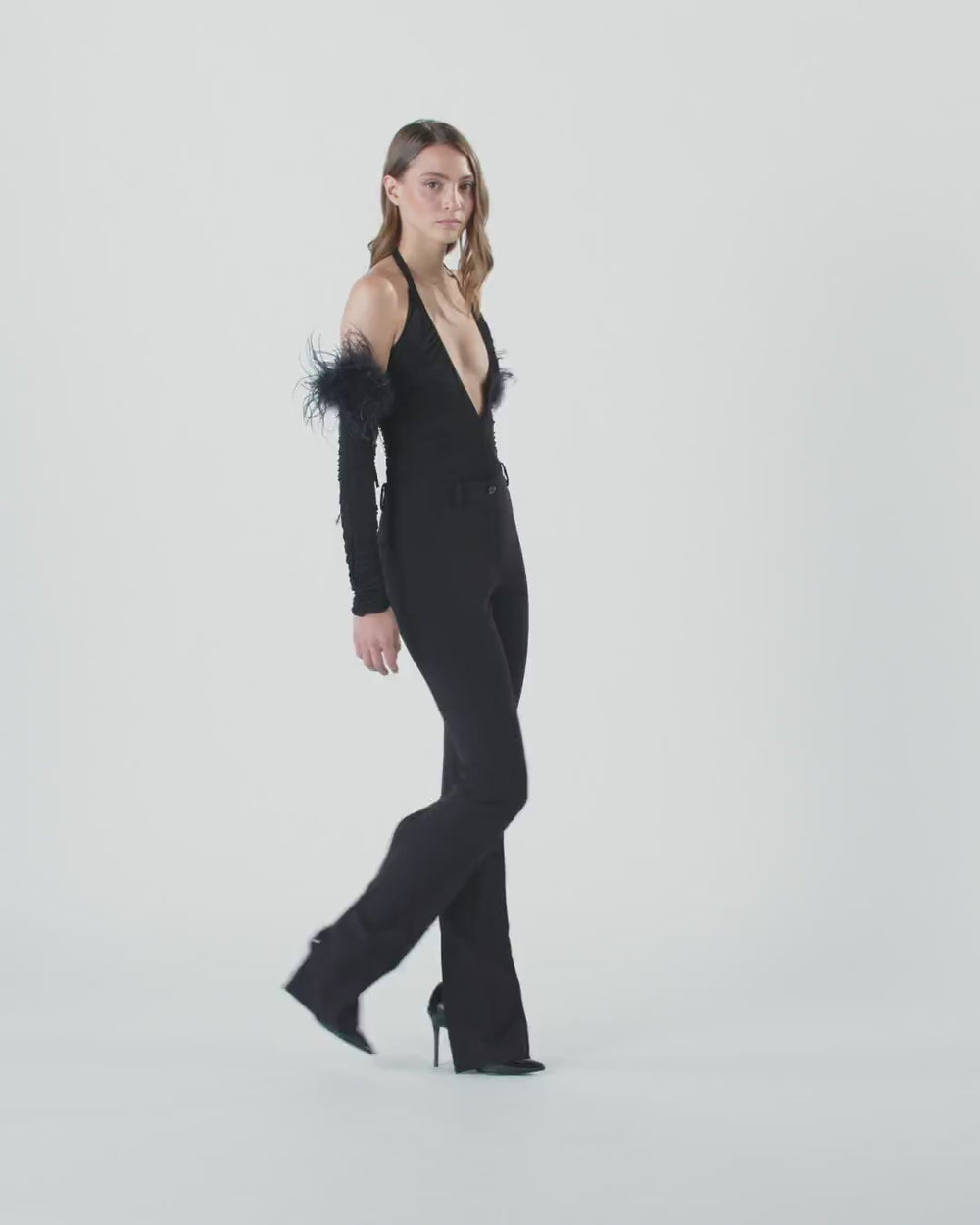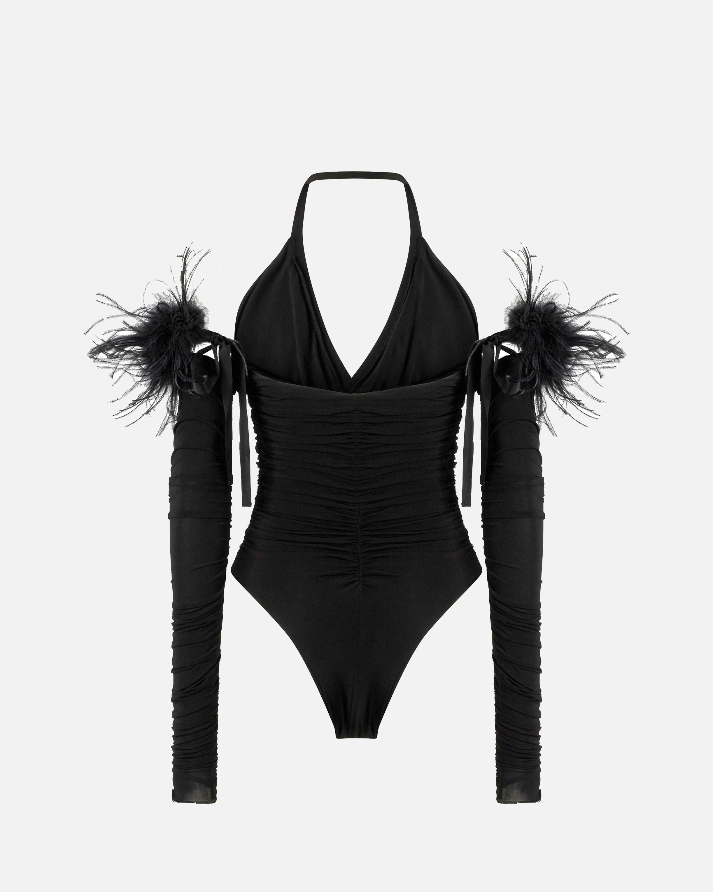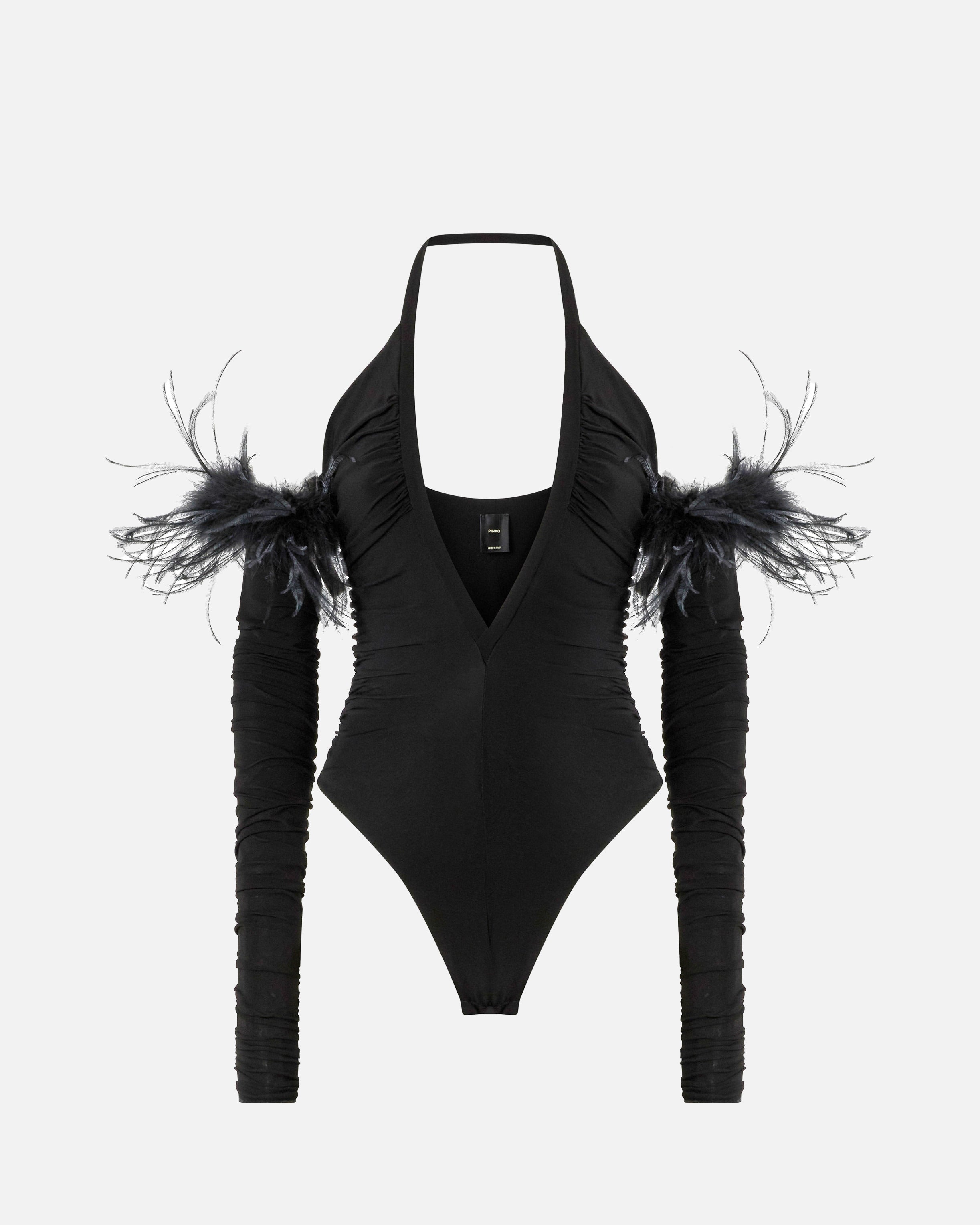 Lightweight jersey bodysuit with detachable shoulders and sleeves by means of a button, which offers different wear options. The lightness of the material allows you to create draping and gathering for an extremely feminine and refined silhouette. The distinctive detail of the piece is provided by the plunging neckline and the feather appliqué mounted on a detachable grosgrain ribbon, which in addition to adding a touch of style, also become a real gem to wear around the neck. This design is destined to become the ace up your sleeve when the dress code is of a high standard.