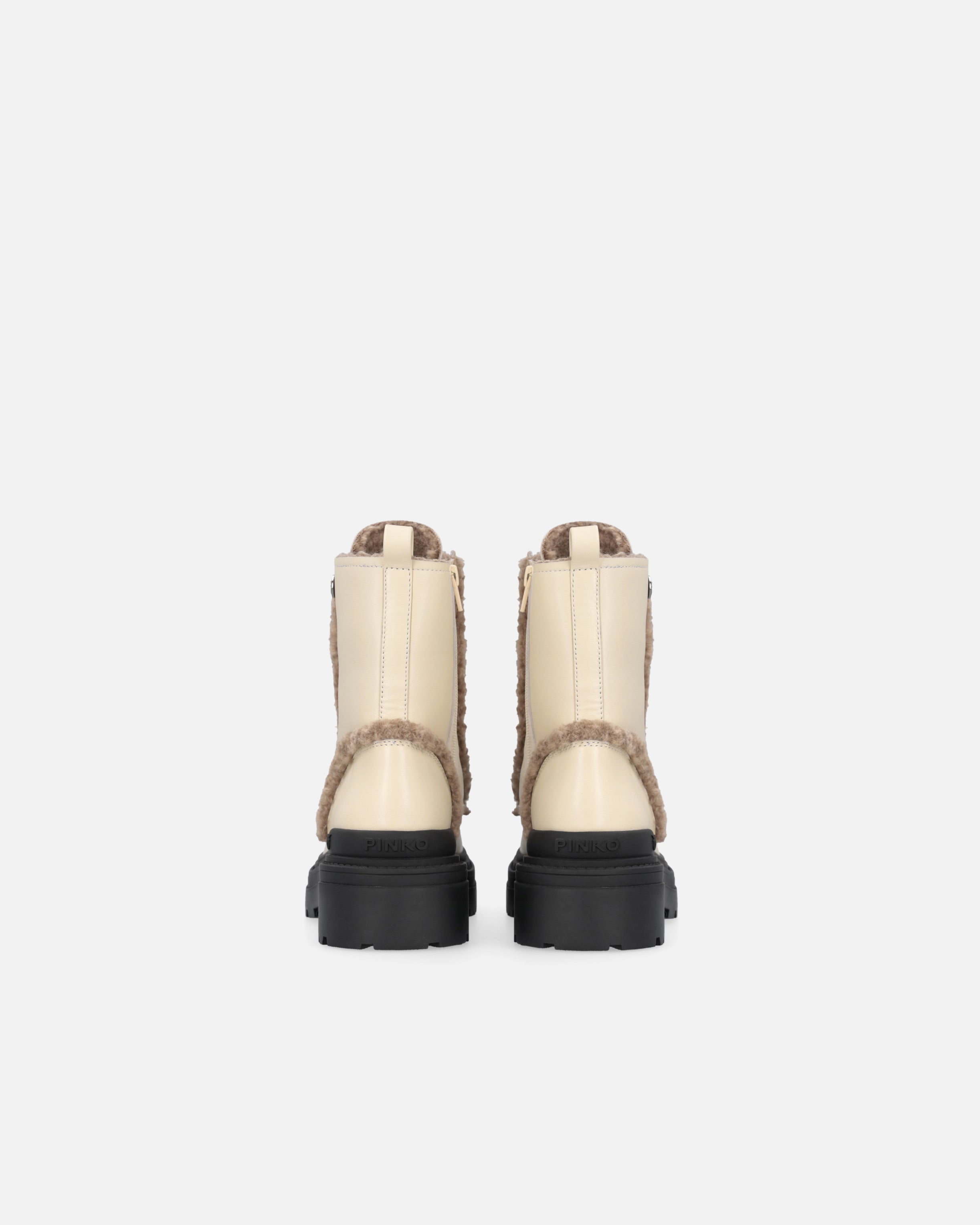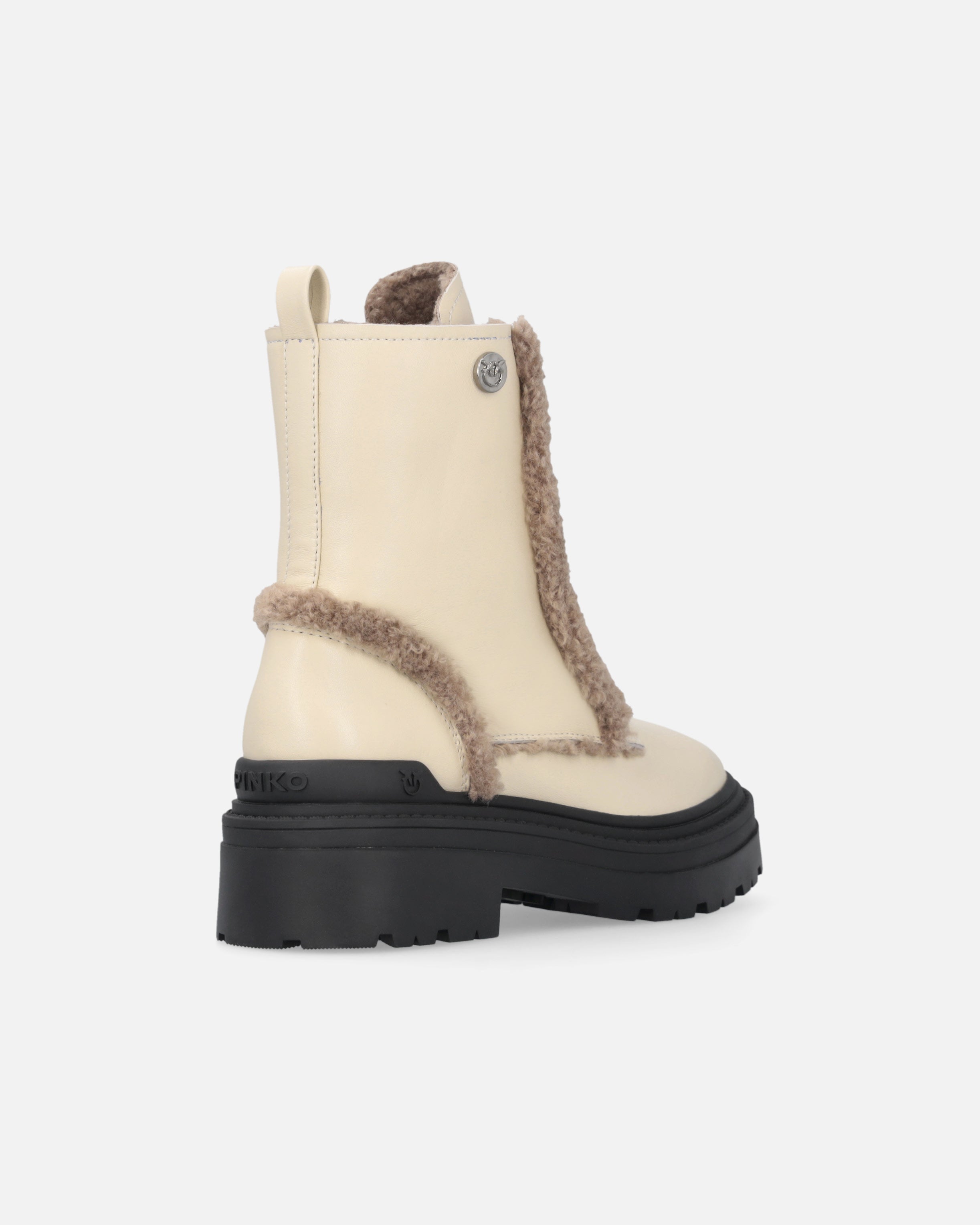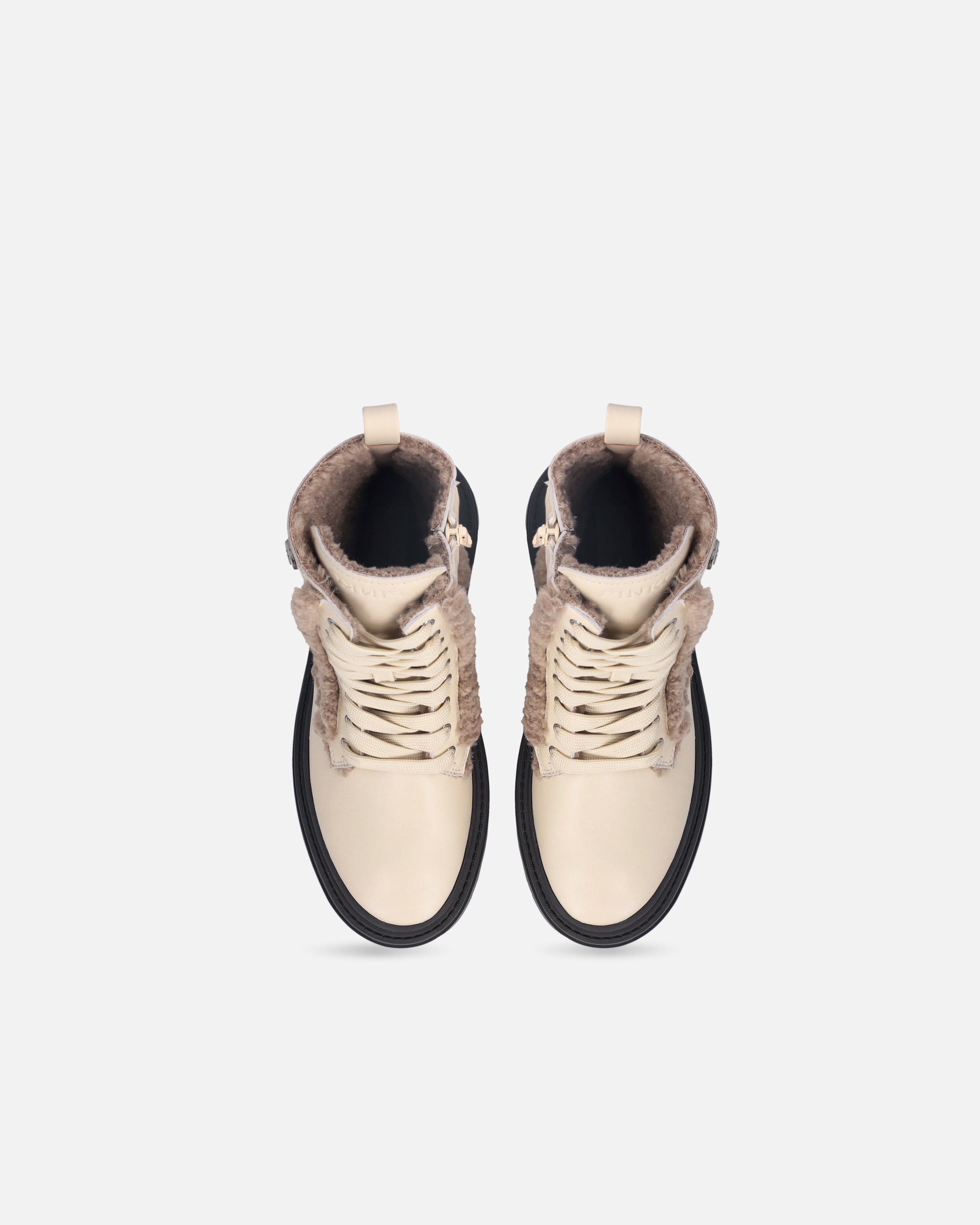 Leather booties with 17 cm-high leg shaft. Fur-effect Aspen fabric adorns the outer edges for an enveloping and warm feel, and the inside for comfort and protection from the cold. The 5.5 cm-high lug sole lends sturdiness and character to the shoe, while the finishing touch is provided by the small Love Birds logo plaque symbolising the brand's singular style. We all know that details are what make the difference: choose this pair to give your casual looks a unique touch.