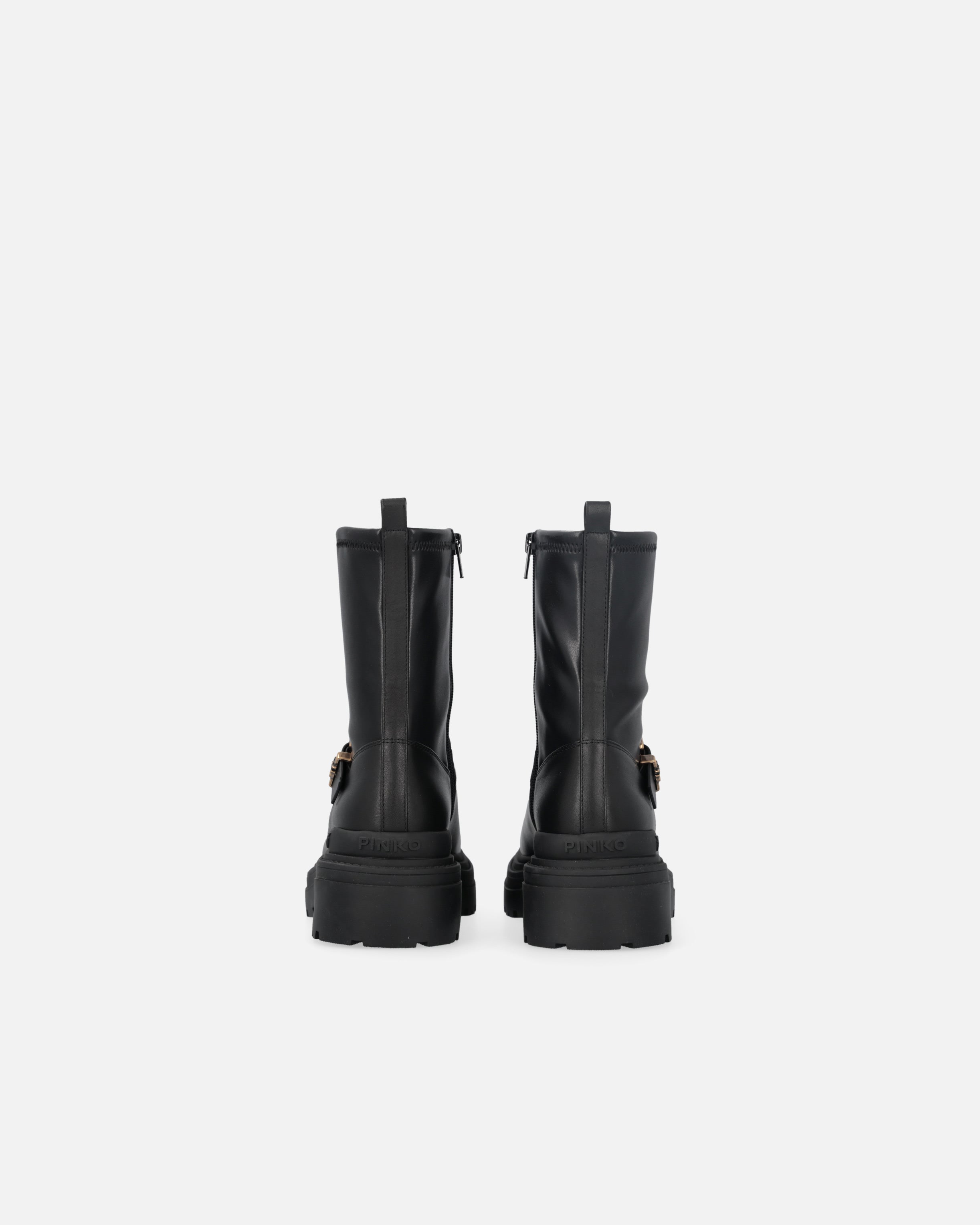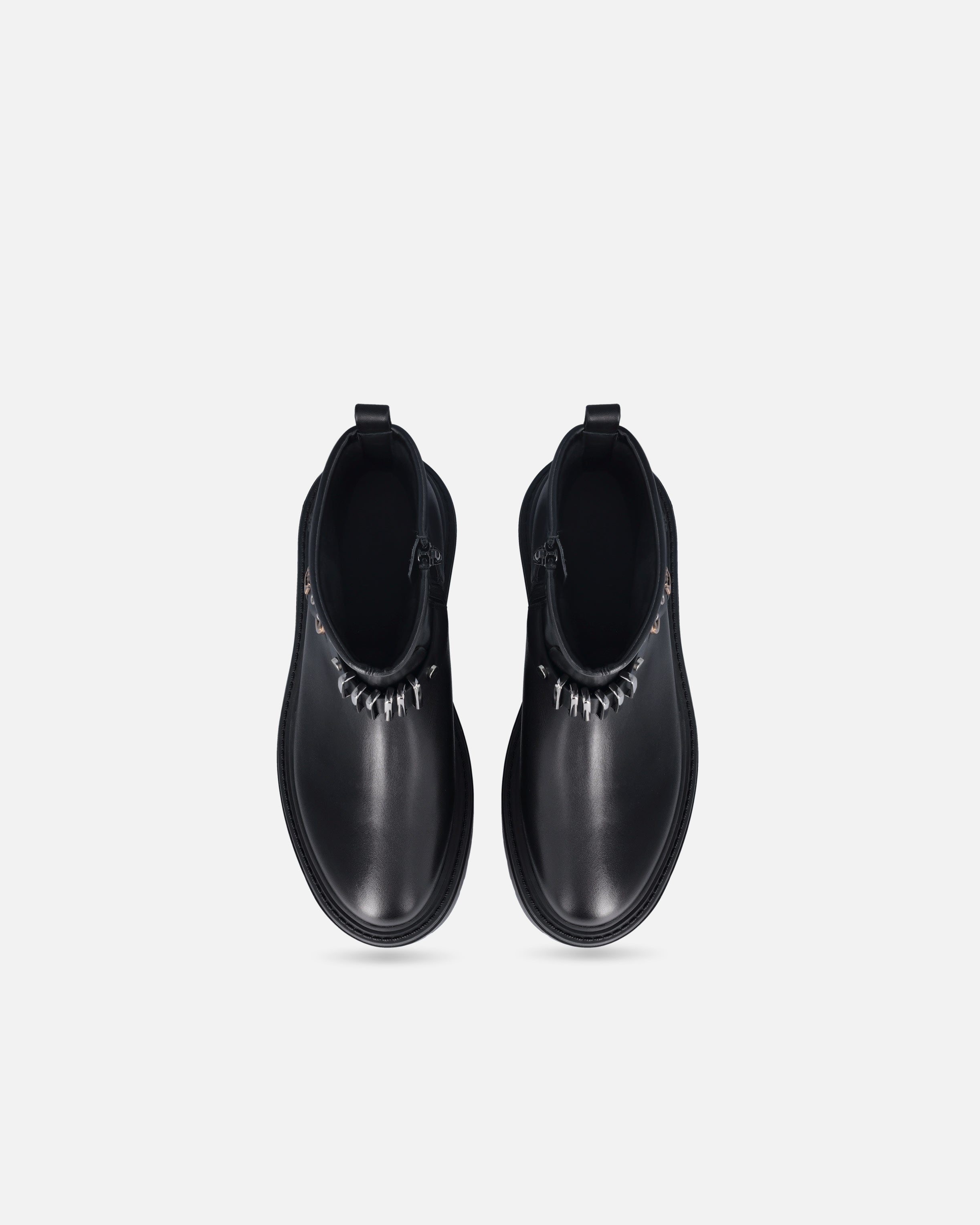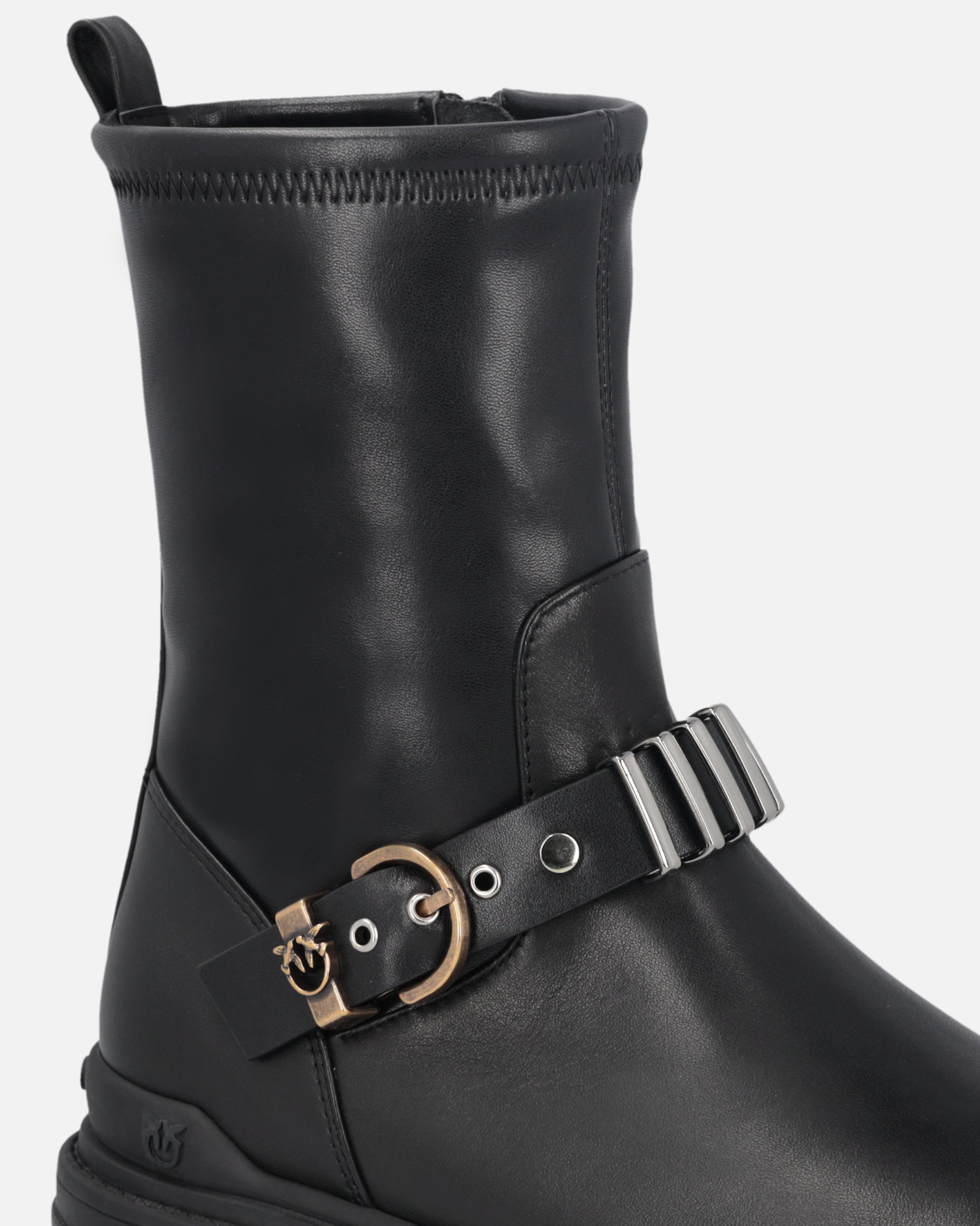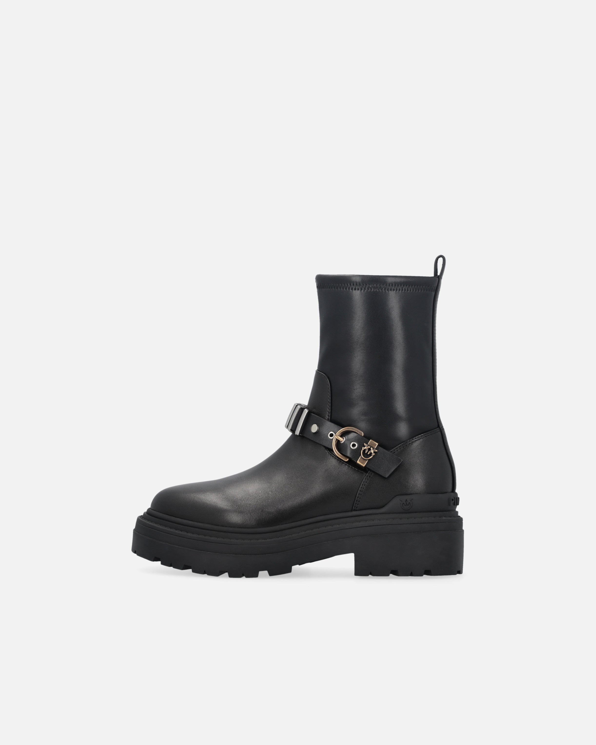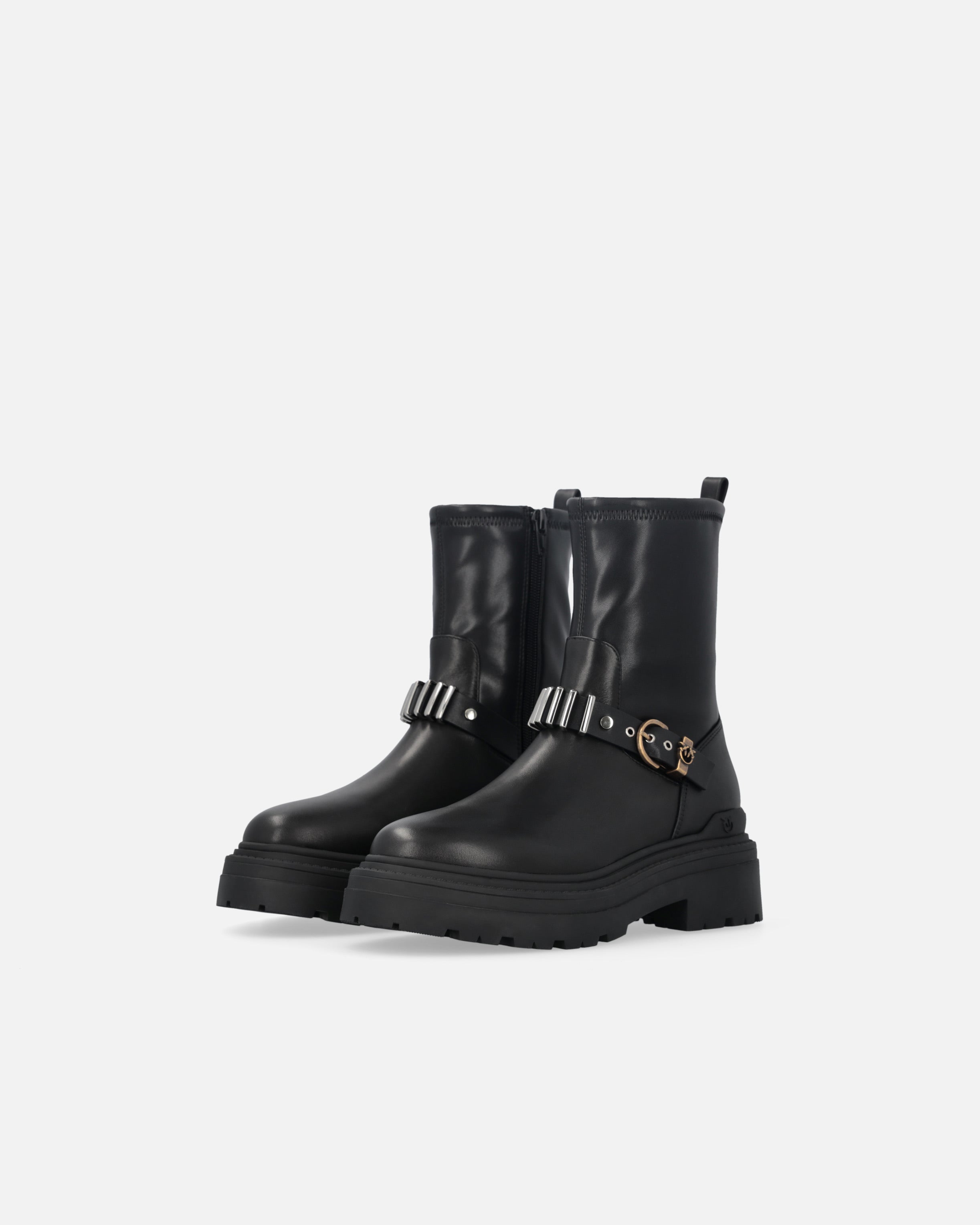 Calf-length booties in smooth leather with 5.5 cm-high rubber sole. This model in stretchy nappa leather stands out for its understated yet bold design enhanced by metal details that emphasise its character. The rear pull tab makes them easy to put on, while the adjustable front strap with buckle and metal loop bearing the Love Birds logo lends a sophisticated rock'n'roll edge. We all know that details are what make the difference: choose this pair to give your casual looks an edgy touch.