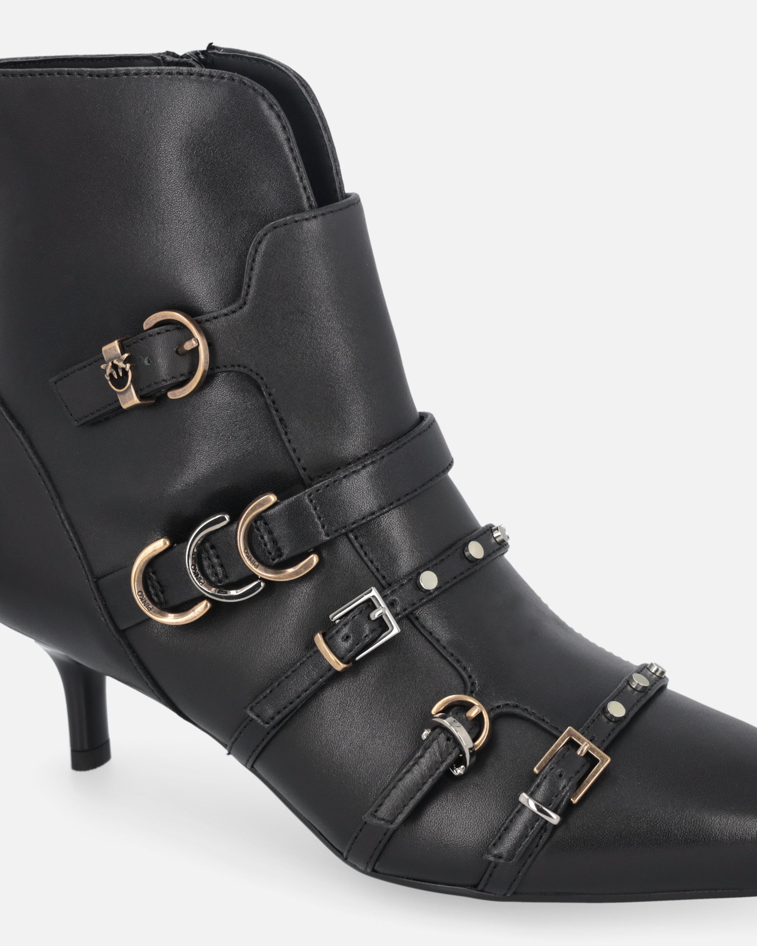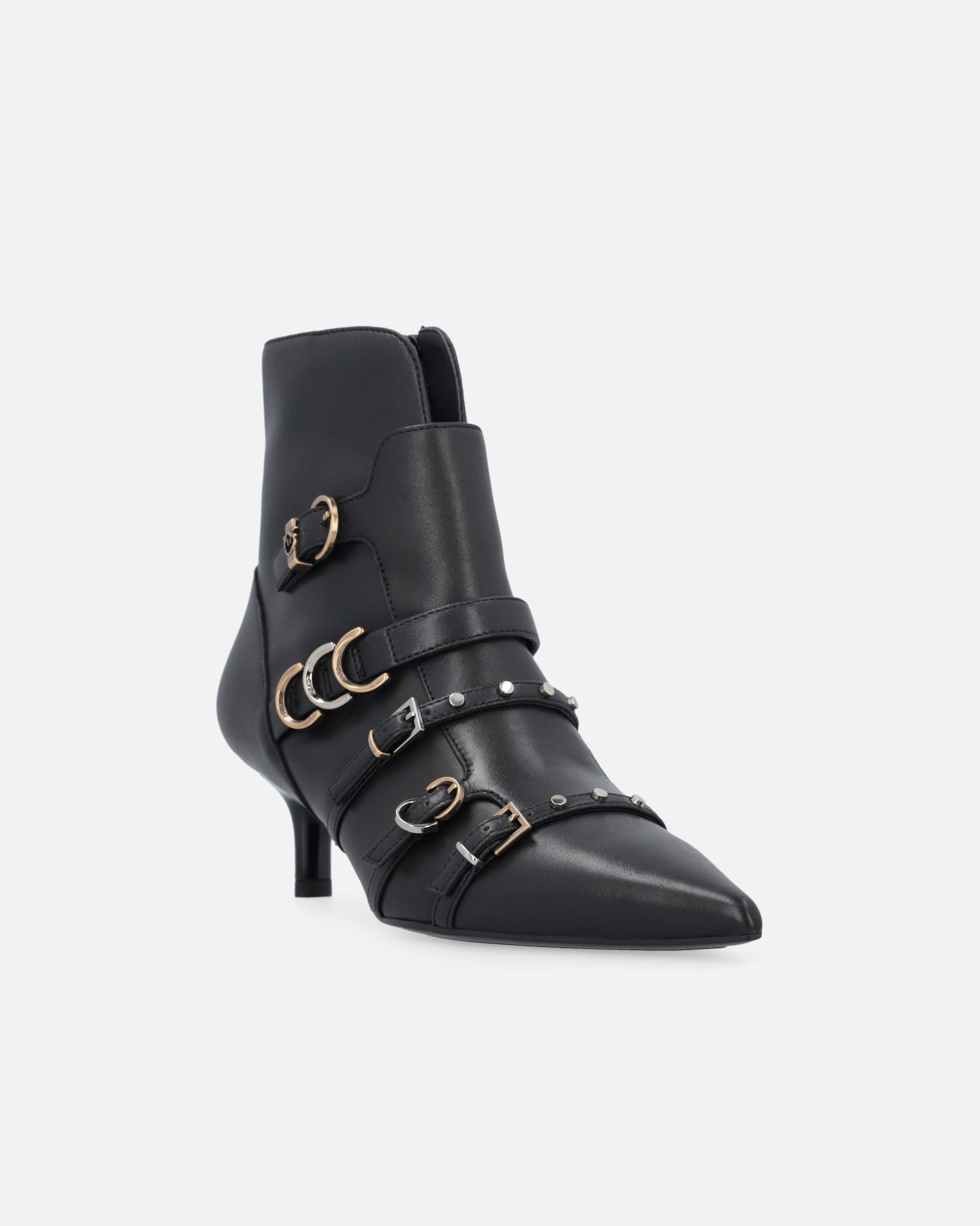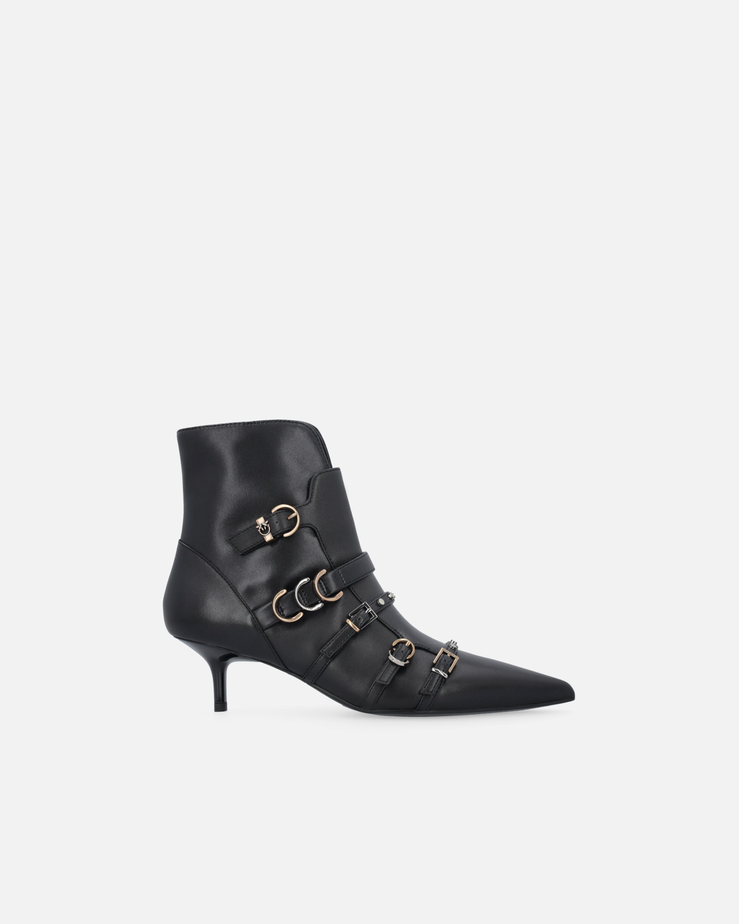 Leather booties with 14 cm-high leg shaft and slender 5 cm-high heel. This model combines geometric shapes to perfection, with buckles, flat mini studs and loops of different forms and sizes skilfully alternated to dynamic effect. These gold- and silver-coloured metal details enhance the design, giving it a sophisticated and bold edge, but the final touch is provided by the small electroplated metal Love Birds logo adorning the loop of the upper strap. Wear this pair of shoes with tailored trousers for the perfect office look.