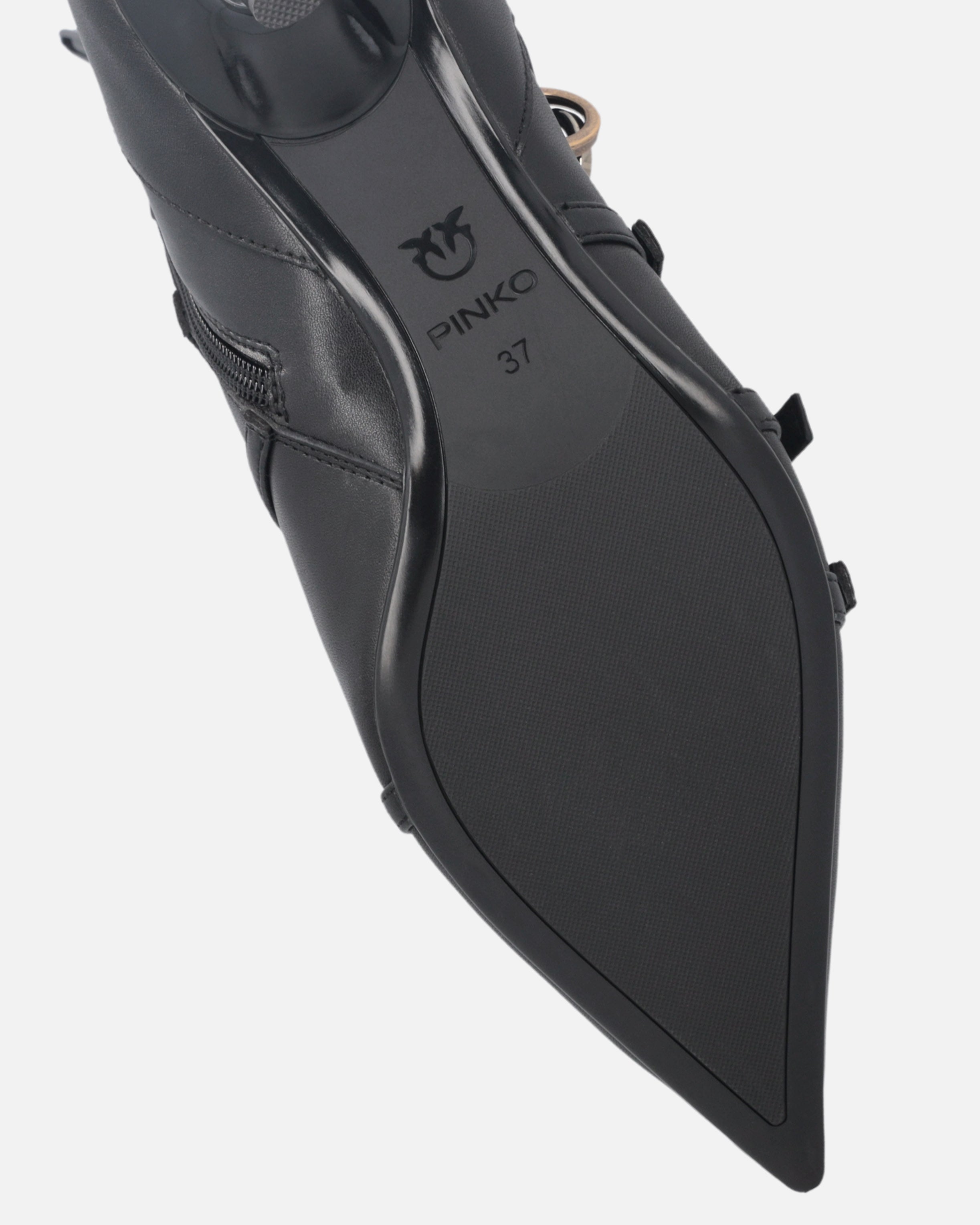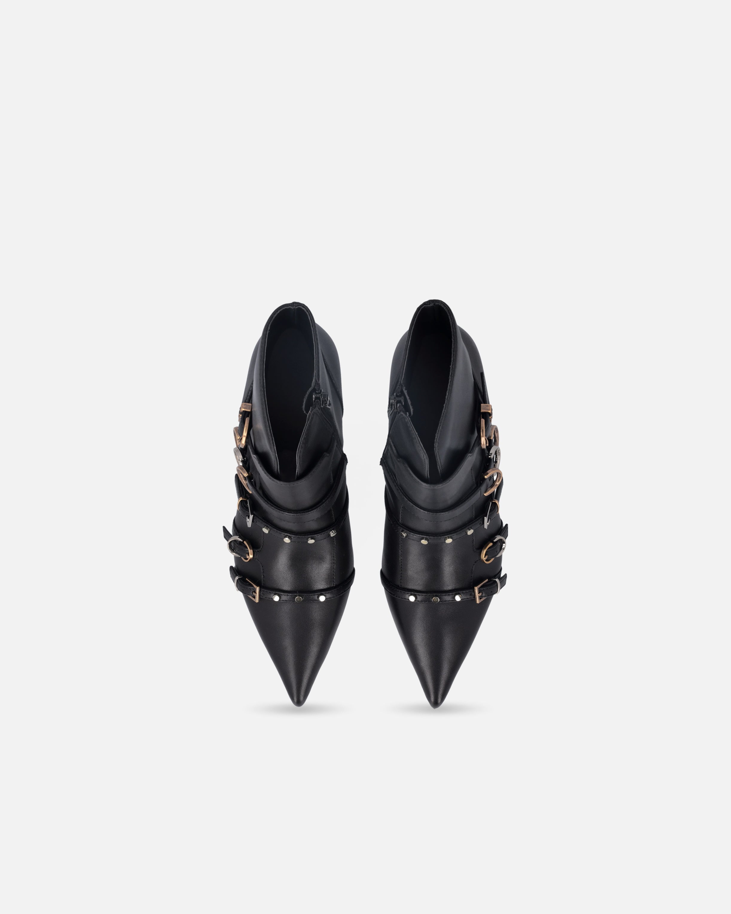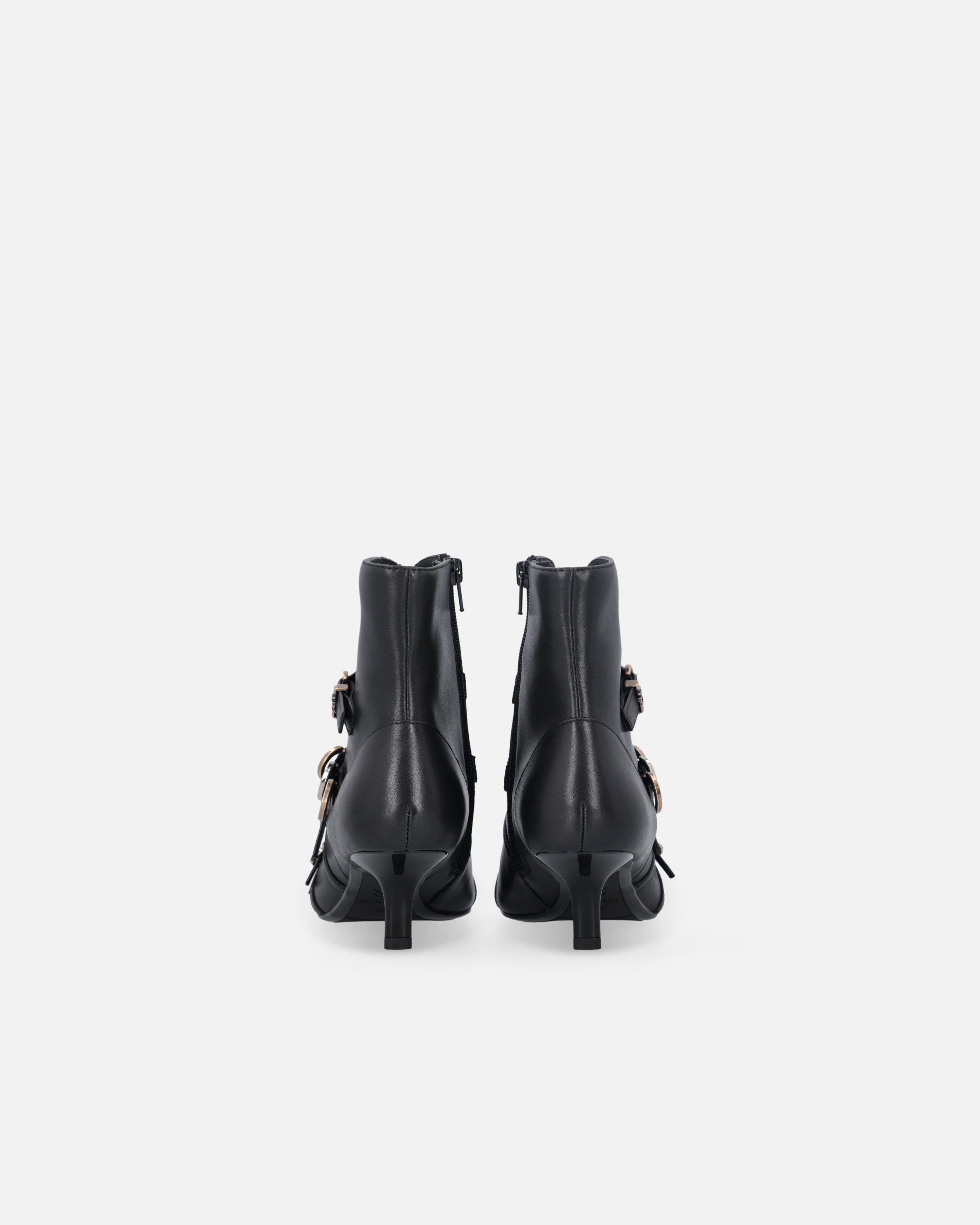 Leather booties with 14 cm-high leg shaft and slender 5 cm-high heel. This model combines geometric shapes to perfection, with buckles, flat mini studs and loops of different forms and sizes skilfully alternated to dynamic effect. These gold- and silver-coloured metal details enhance the design, giving it a sophisticated and bold edge, but the final touch is provided by the small electroplated metal Love Birds logo adorning the loop of the upper strap. Wear this pair of shoes with tailored trousers for the perfect office look.
