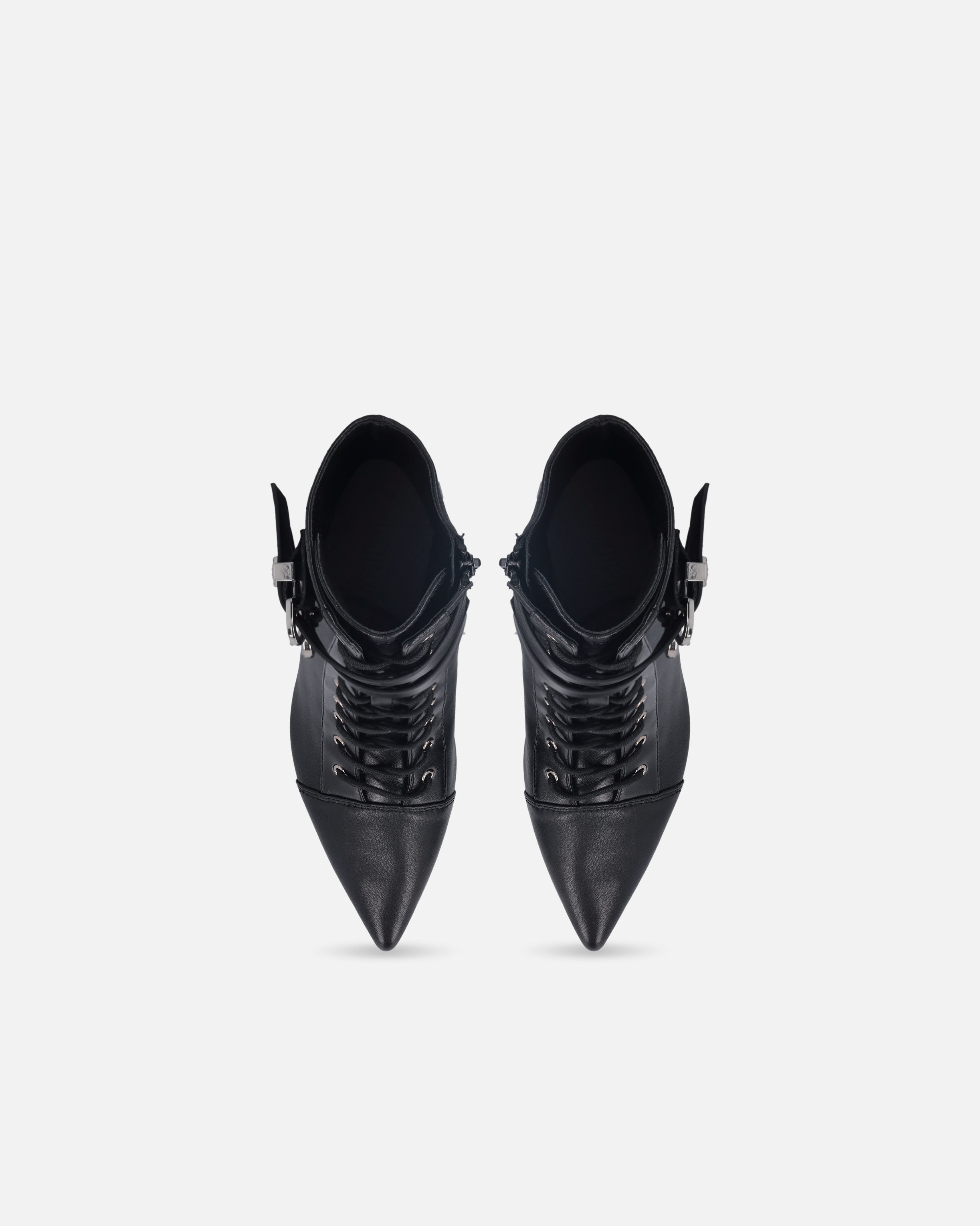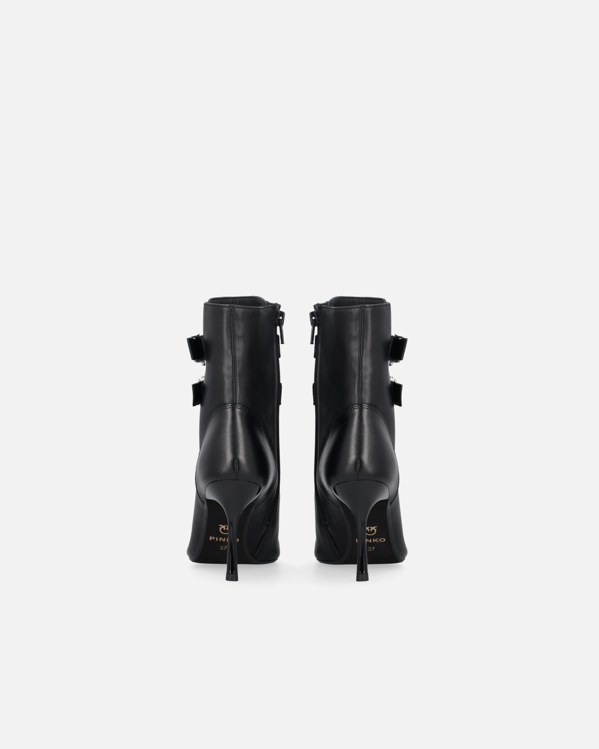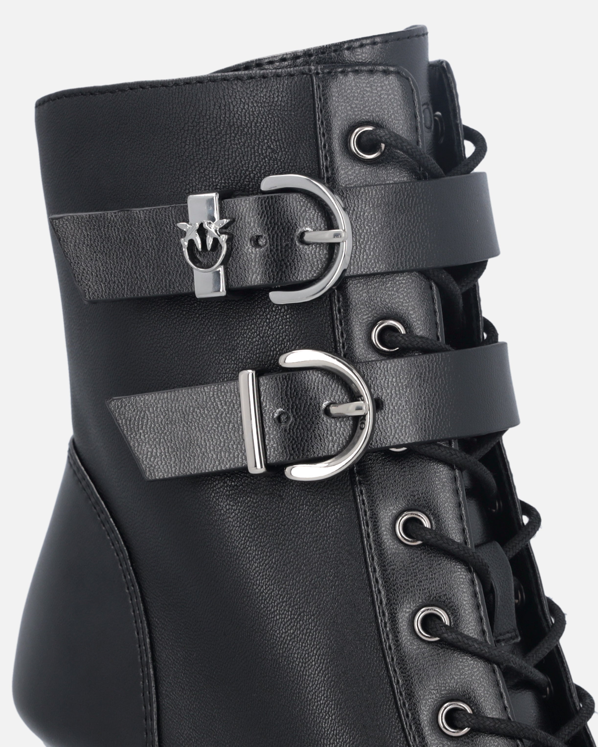Lace-up booties in glossy-effect soft leather with 14 cm-high leg shaft. The slender 9 cm-high heel has a figure-slimming effect without compromising comfort, balancing style and functionality to perfection. The model is finished with two straps with buckle on the leg shaft, one of which is embellished with the Love Birds logo on a metal loop. Thanks to its versatility, this shoe is ideal for special occasions, paired—as an example—with a refined skirt.