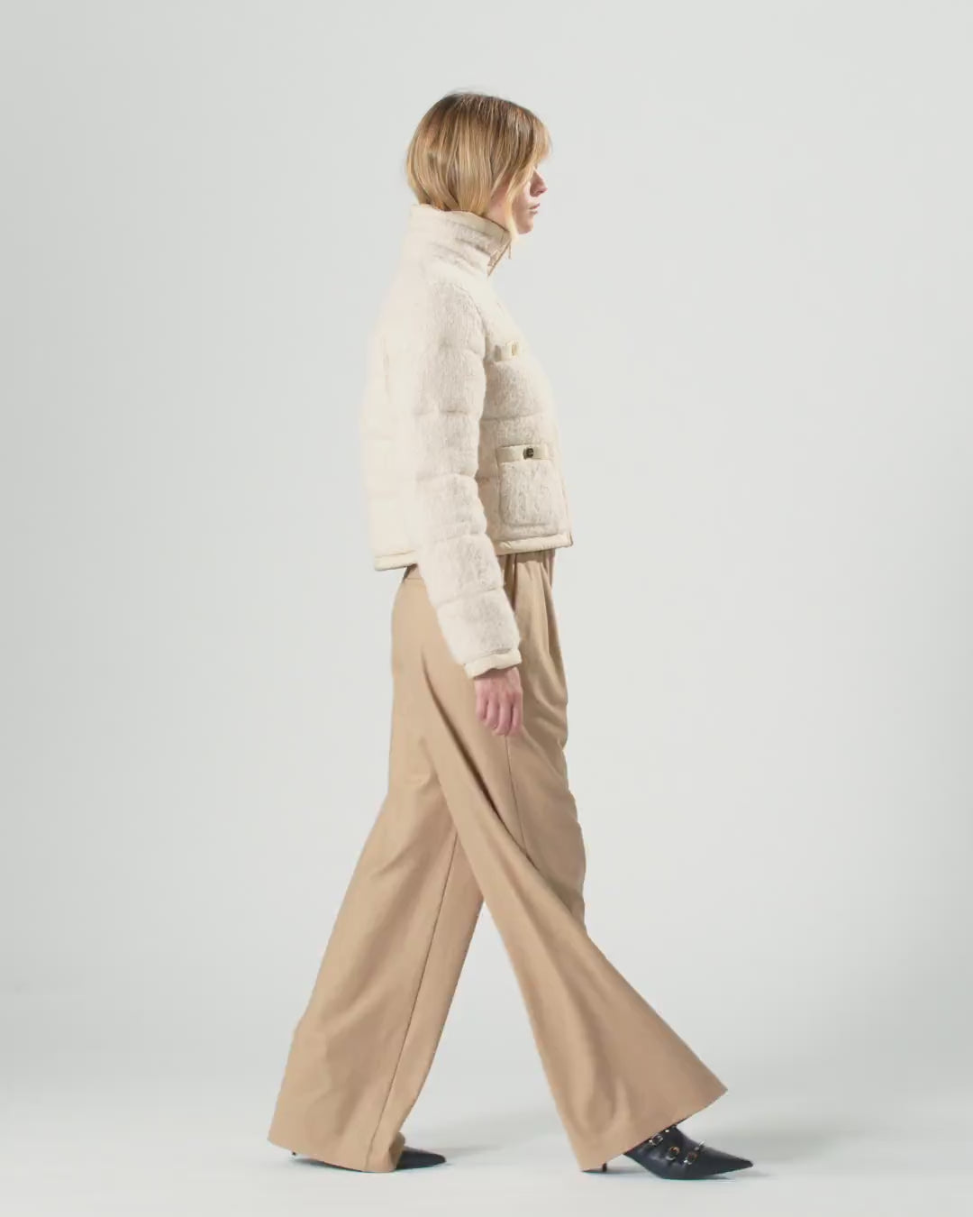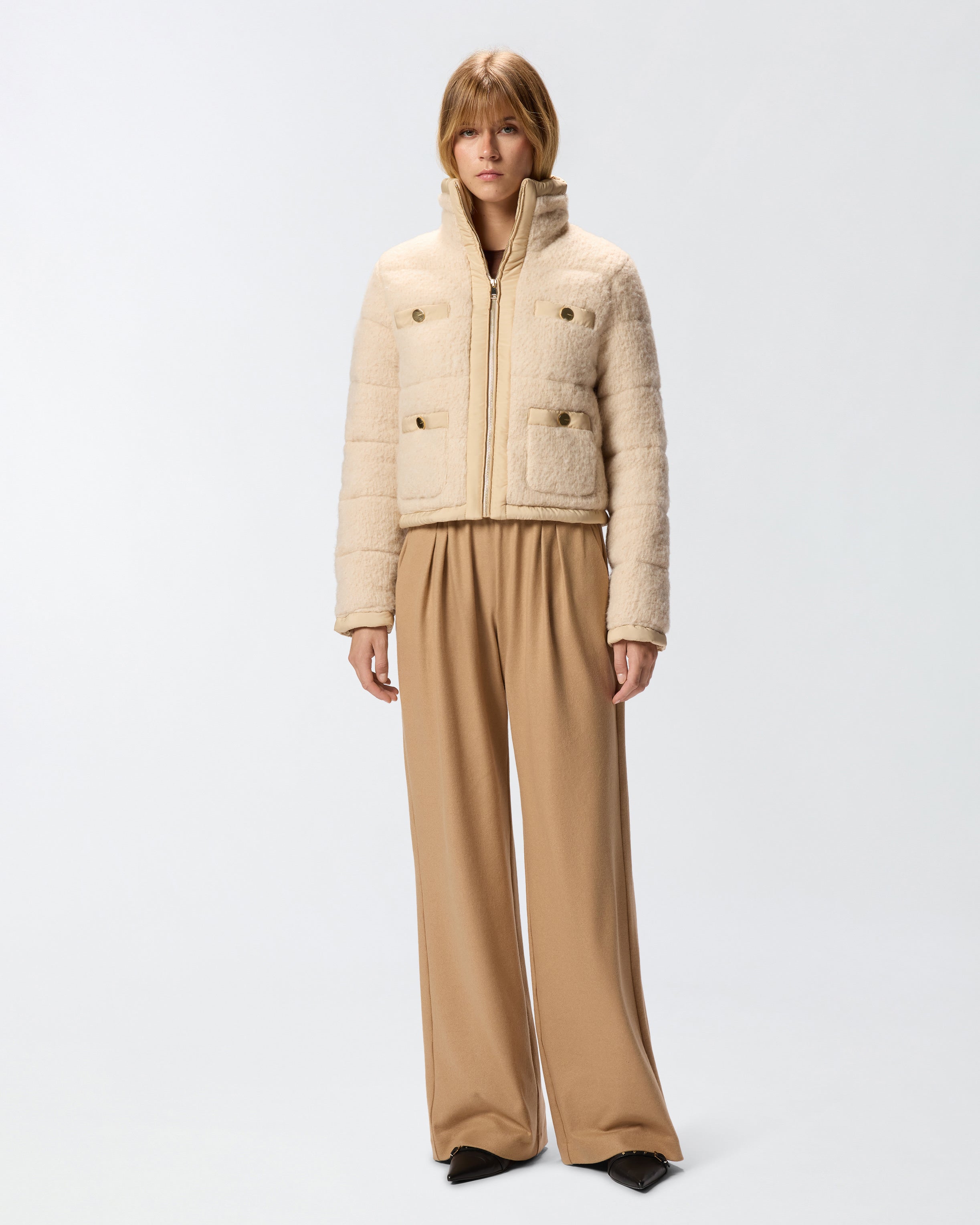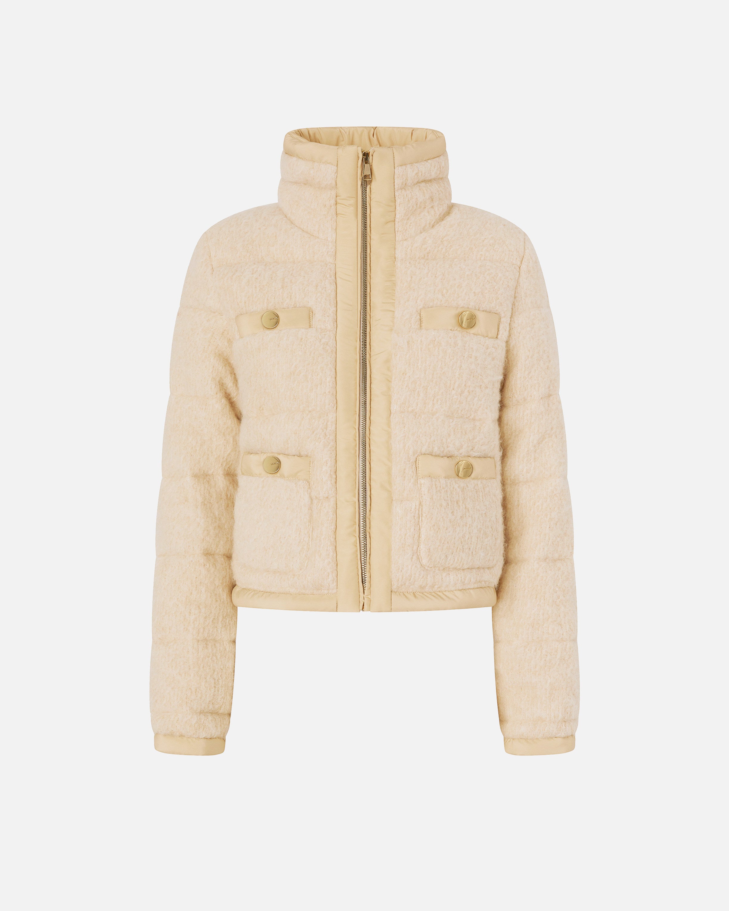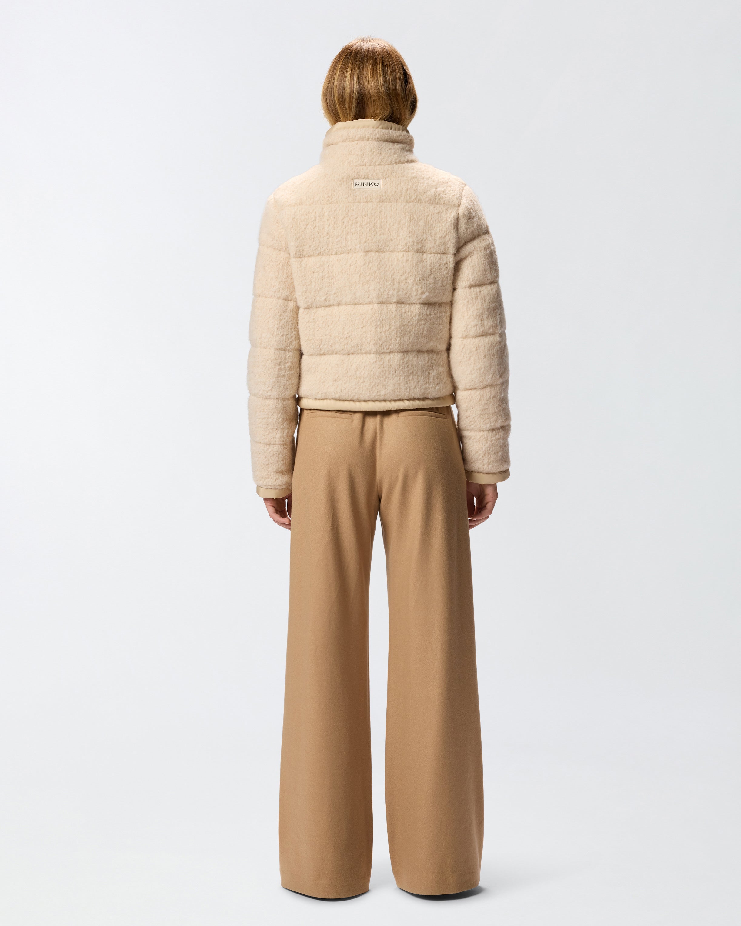 Long-sleeved, high-neck down jacket in bouclé fabric with zip fastening. This garment has four practical front pockets embellished with a gold-coloured button that elevates the look. To customise the item in pure PINKO style, there's a tone-on-tone label with embroidered logo lettering on the back. An outerwear piece that combines functionality and style, this down jacket is ideal to wear for everyday engagements, including when the cold weather begins to set in.