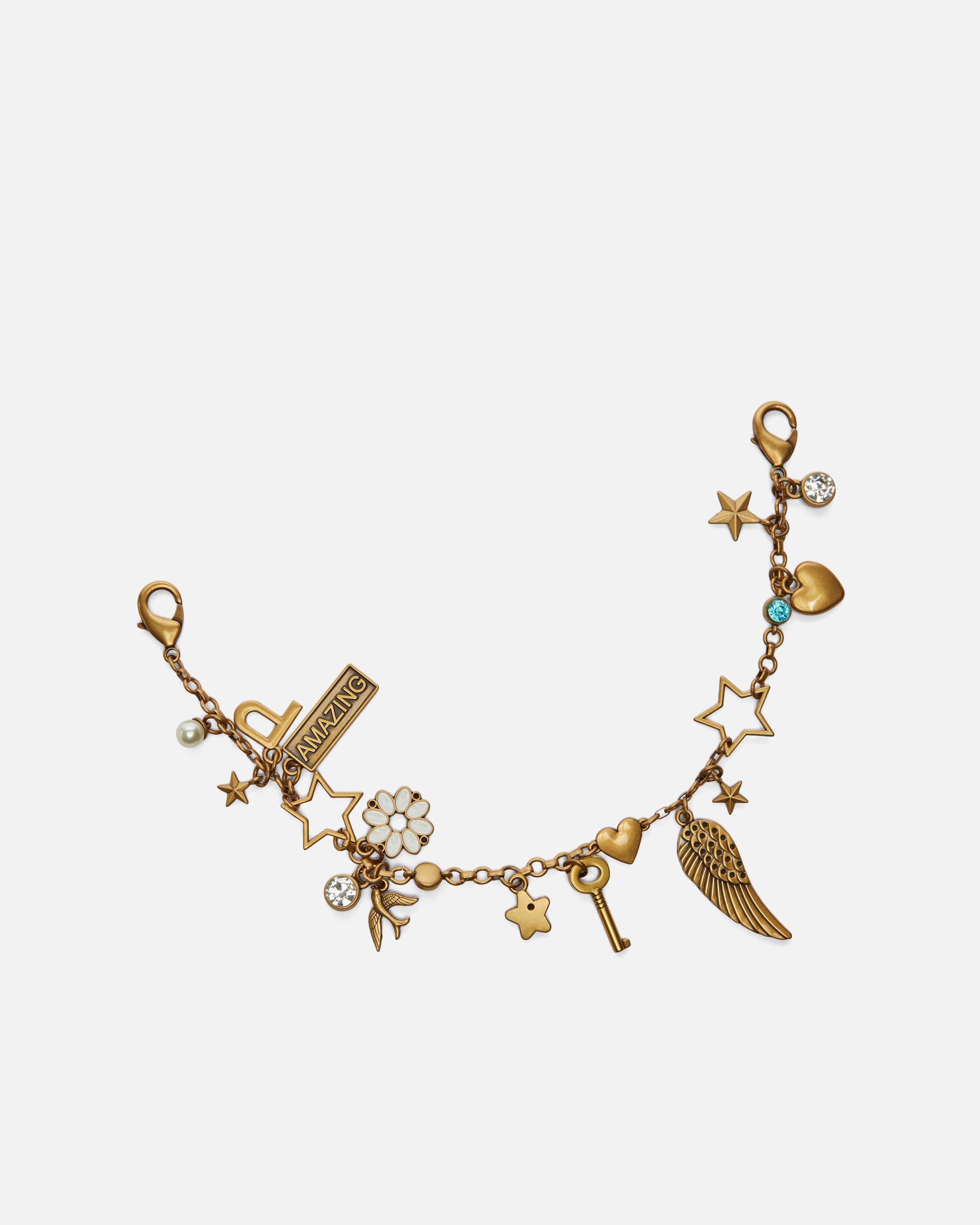 Bag charm with 25-cm long chain in durable antique gold-tone plated metal. The pendants, both in metal and enamel, personalise the design with different shapes: key, hearts, stars, flower, birds, wing and branded accents. It is the perfect accessory to complete even the most essential day bags in full PINKO style.