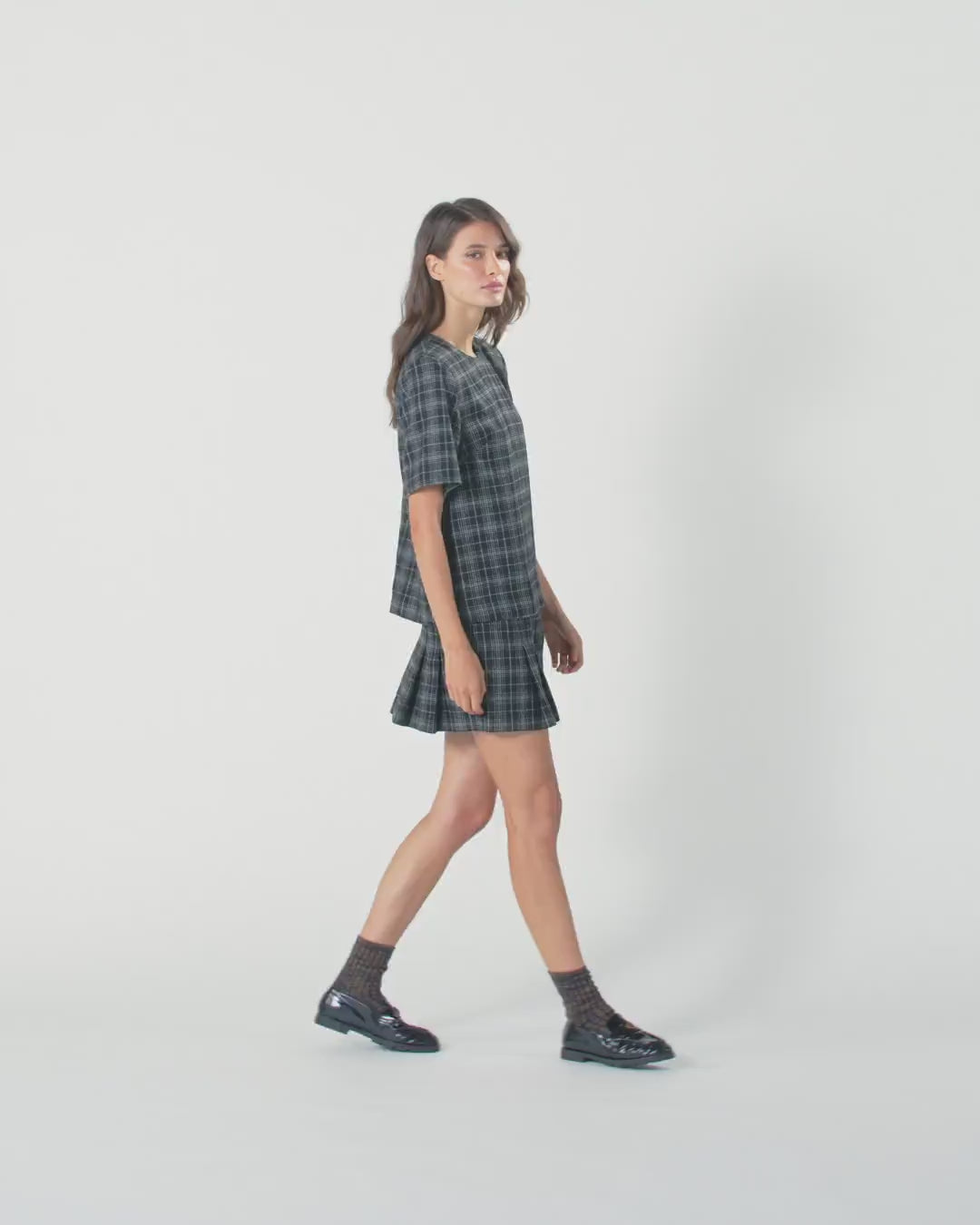 Short-sleeved straight-cut mini dress with crew neck, rear zip and pleated skirt-like flounce. The yarn-dyed wool-blend fabric is embellished with an all-over check motif, while the decorative belt on one side of the mini skirt lends a finishing touch. Who ever said that formal garments can't be comfy too? Your office looks will never be the same again.