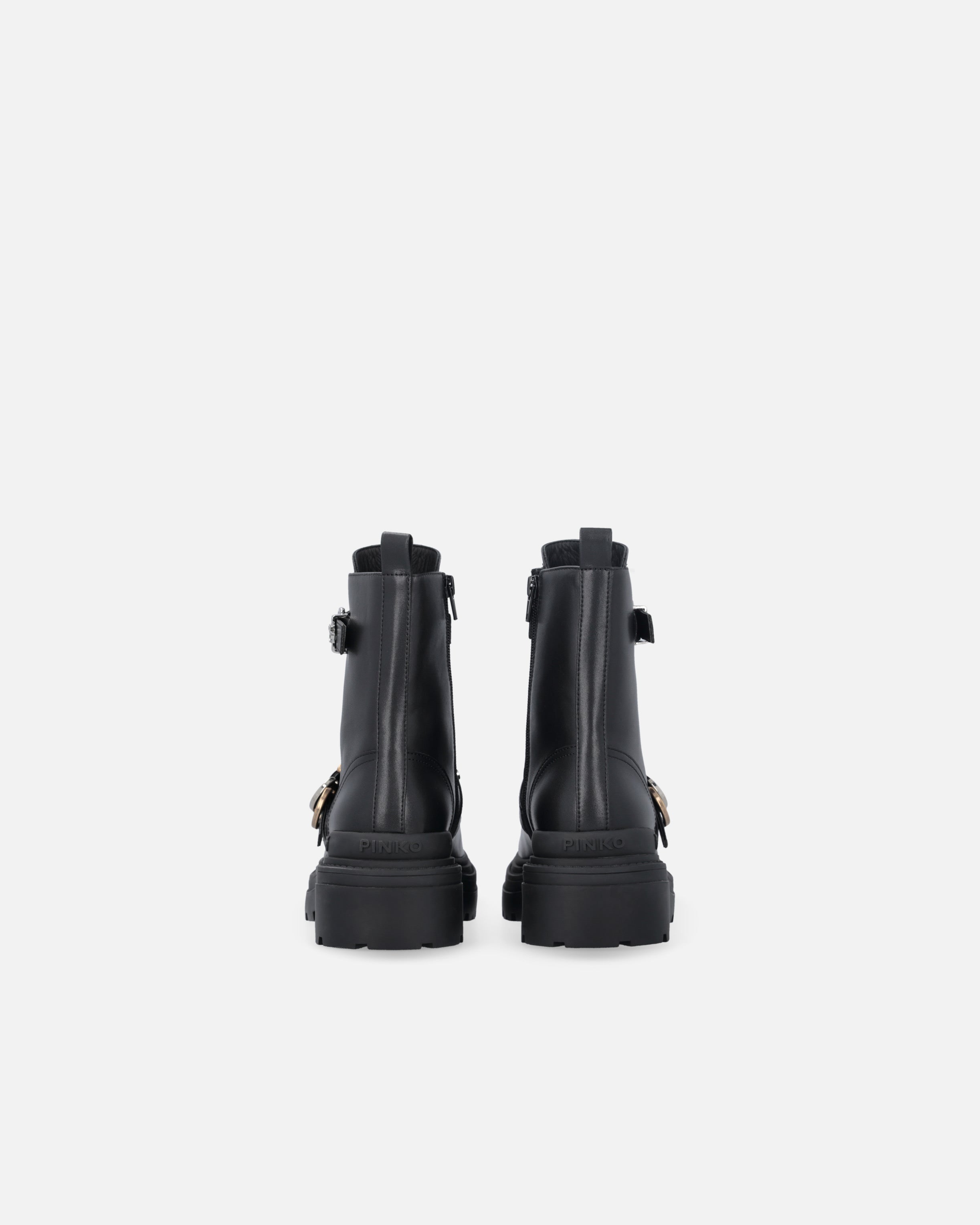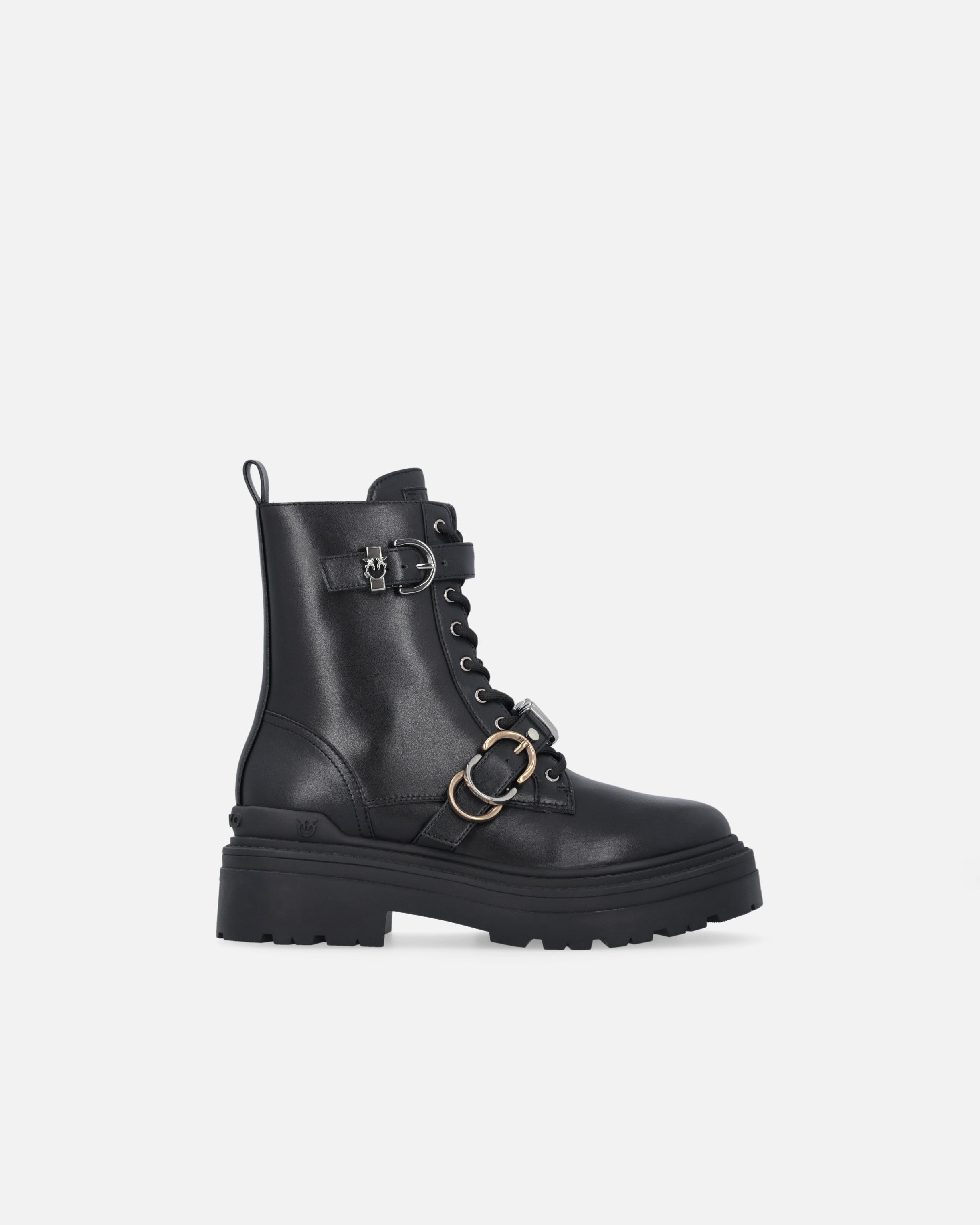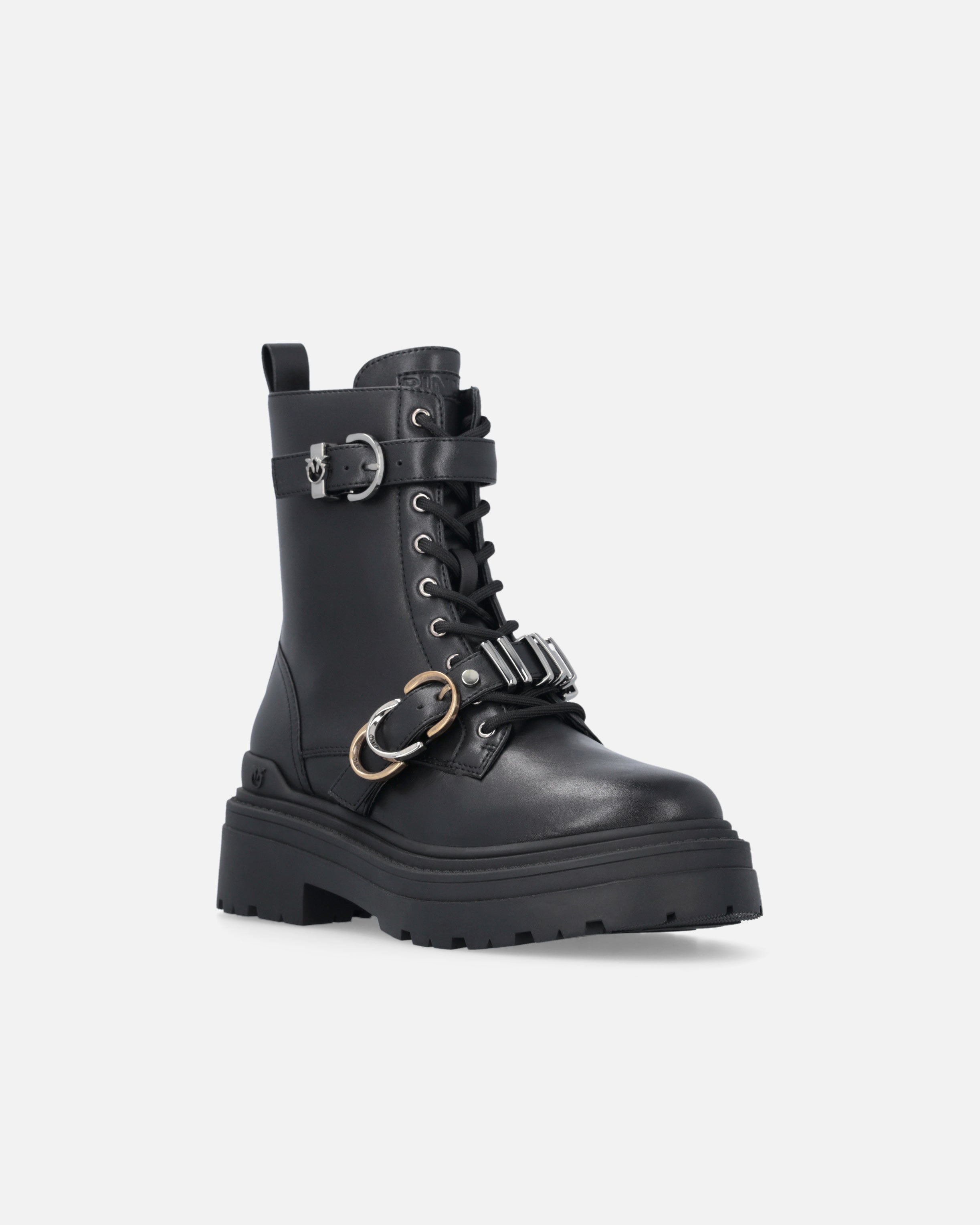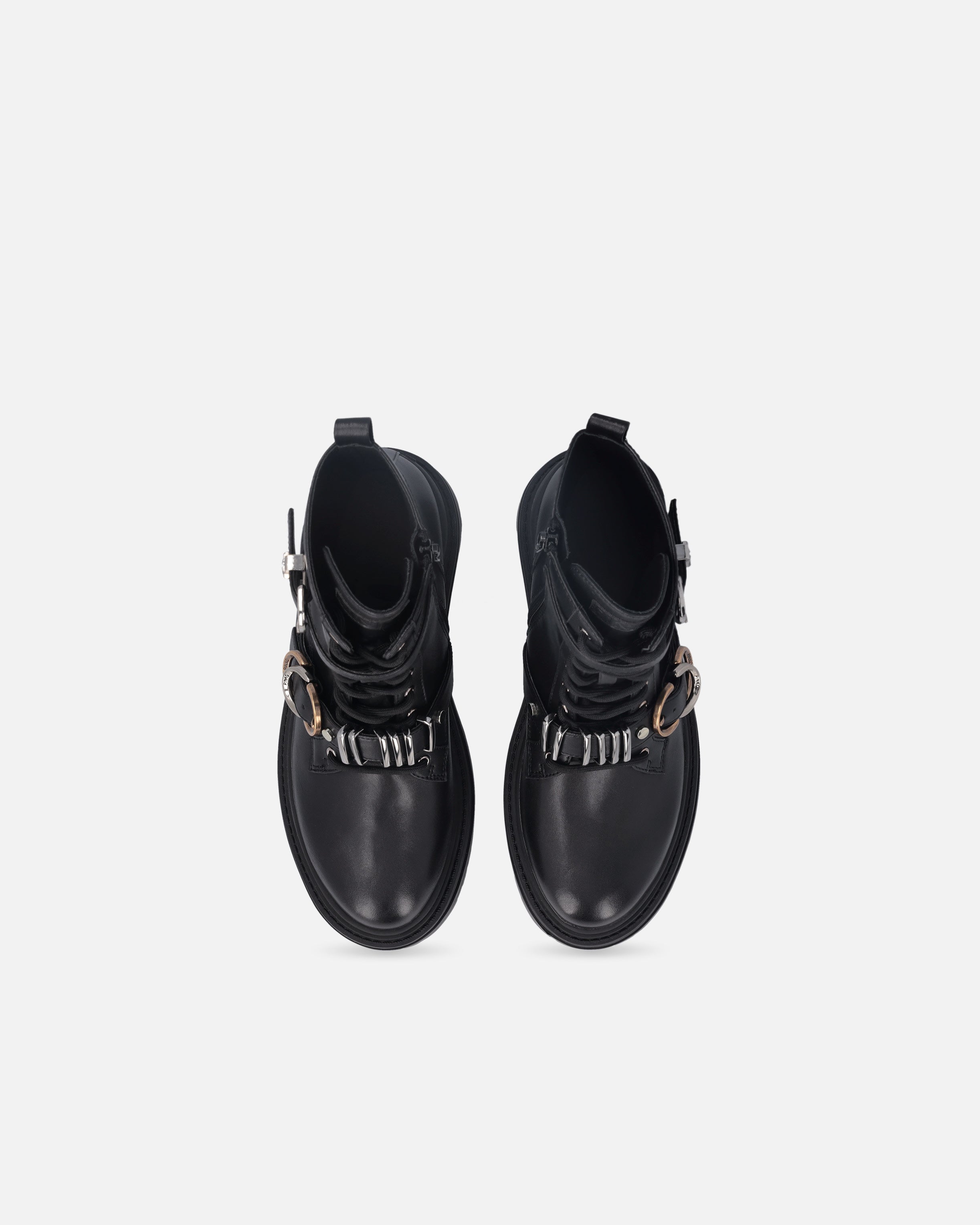 Lace-up leather combat boots with 16 cm-high leg shaft and 5.5 cm-high rubber lug sole. This model stands out for its understated yet bold design enhanced by metal details that emphasise its character. The side zip makes them easy to put on, while the adjustable straps with buckle, one of which features a metal loop bearing the Love Birds logo, lend a sophisticated rock'n'roll edge. We all know that details are what make the difference: choose this pair to give your casual looks an edgy touch.