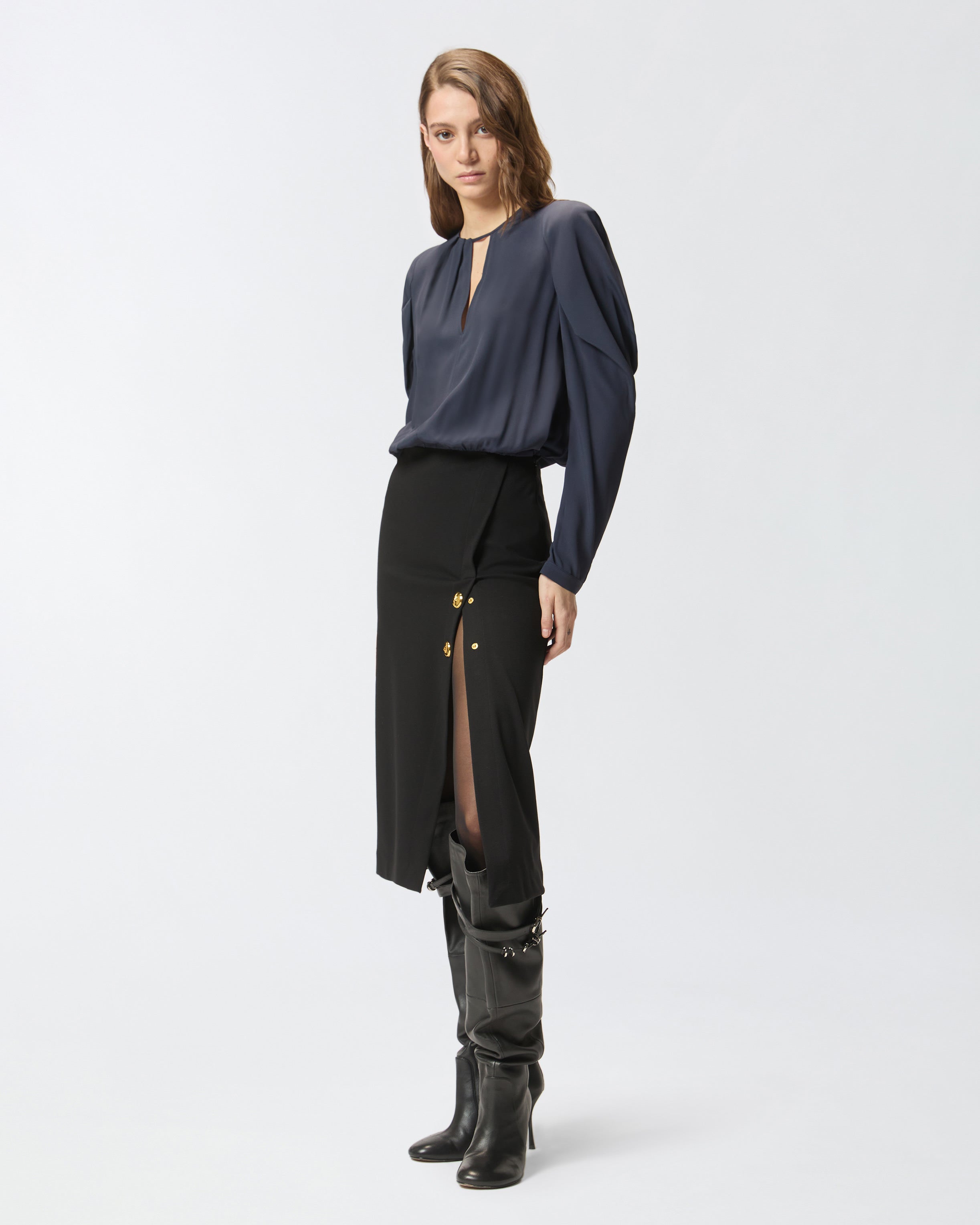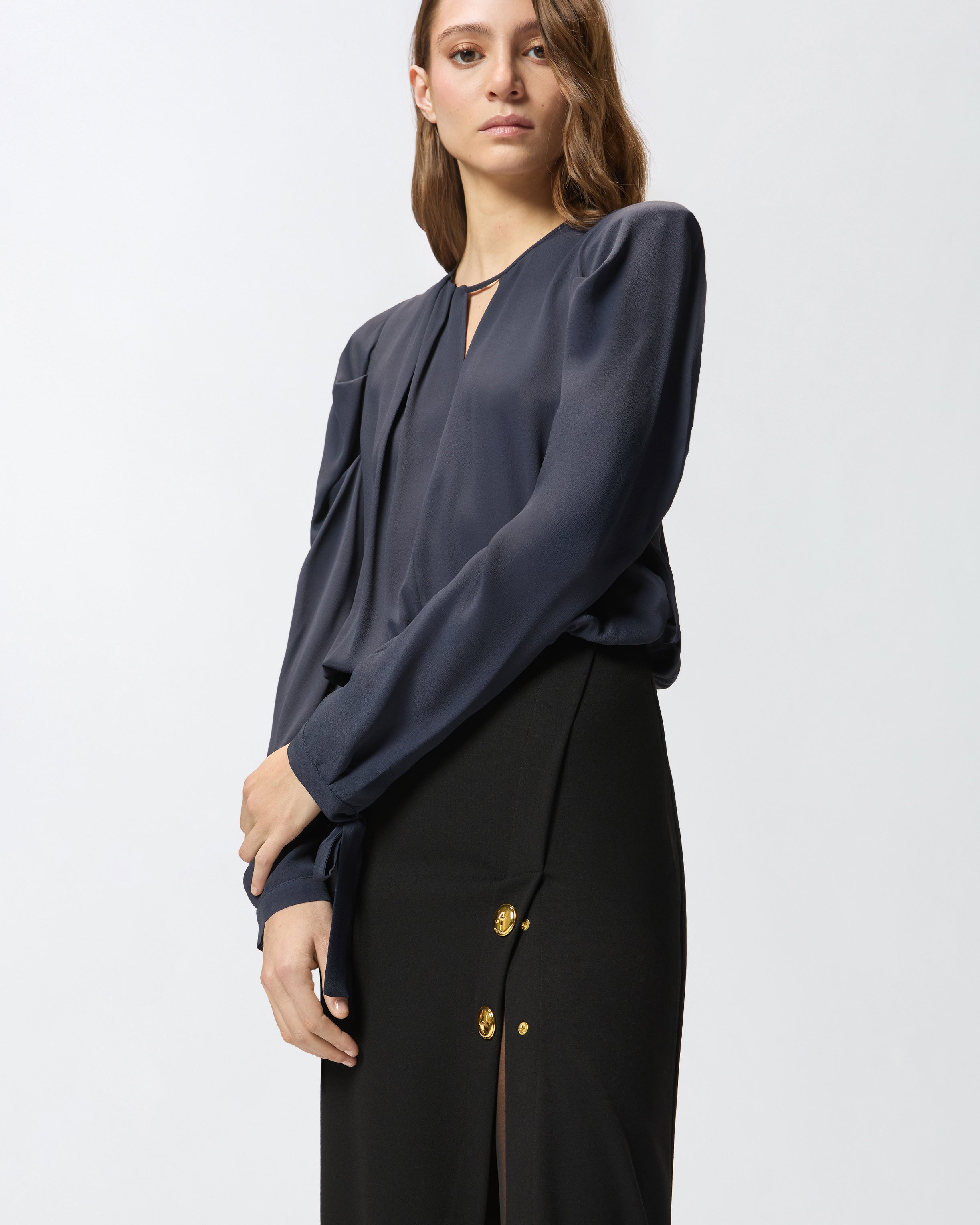 Calf-length dress with a pencil skirt, a crew-neck defined by a deep V-shaped opening on the front, and long draped sleeves completed by soft ribbons that tie on the cuffs. The garment features a bi-material construction, combining a fluid silk-blend fabric on the top, with a stretch technical viscose full Milano-knit fabric on the skirt. The front is also punctuated by metal star-decorated buttons. This fitted style is more cinched on the sides. Keyhole fastening on the back of the neck and a zip fastening at the side of the skirt. Perfect as an elegant outfit for special evenings out or for an everyday look where the dress code calls for sophistication.