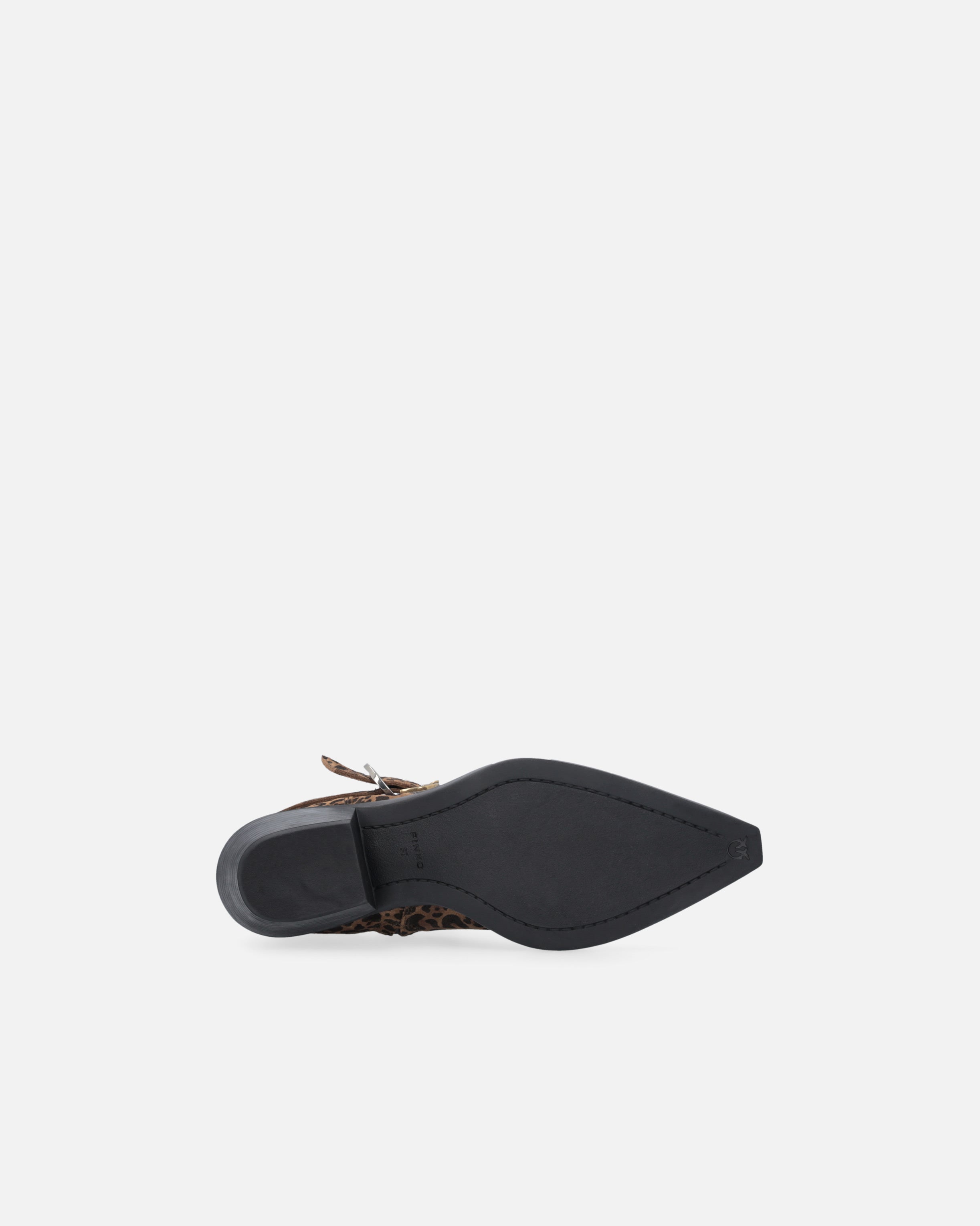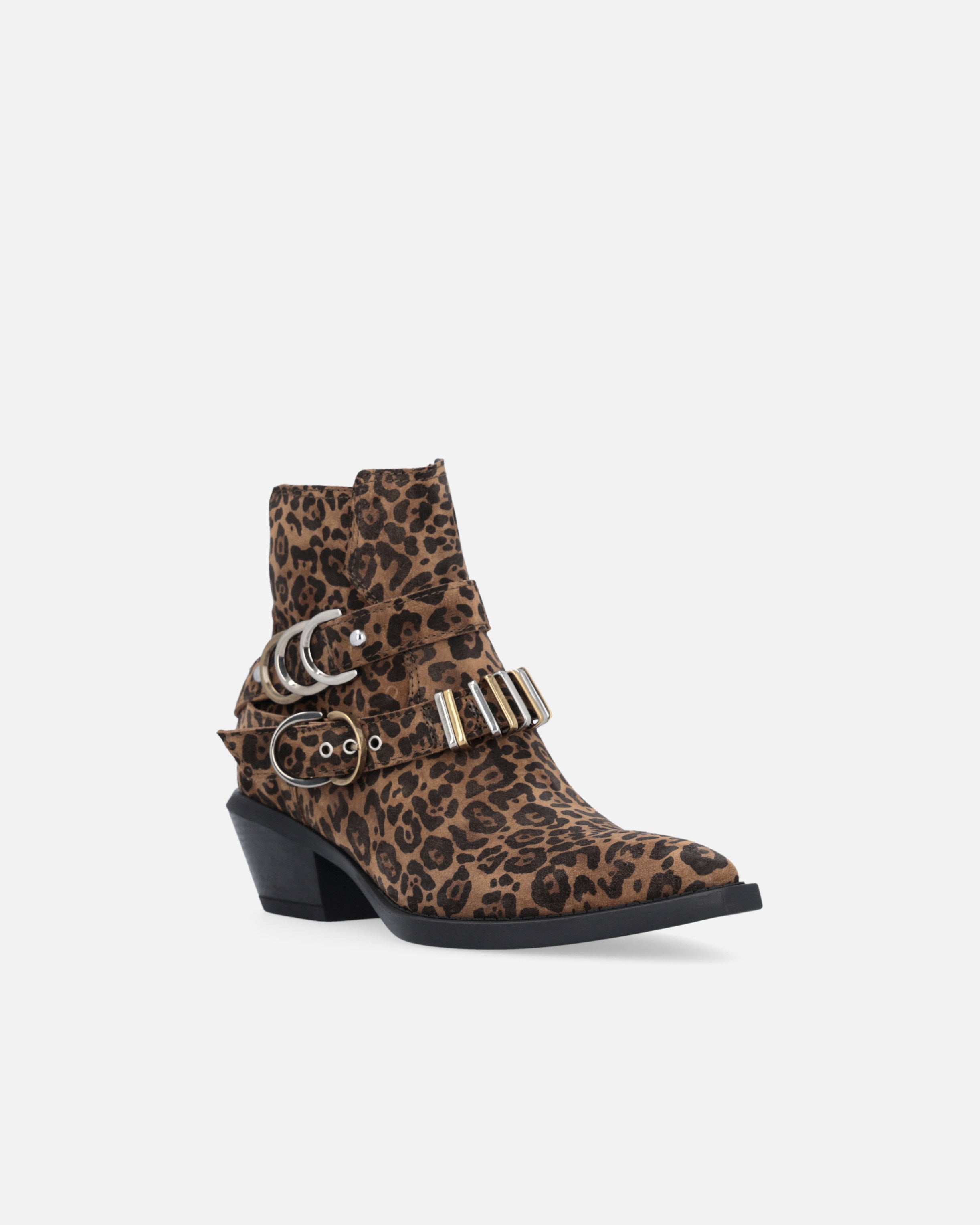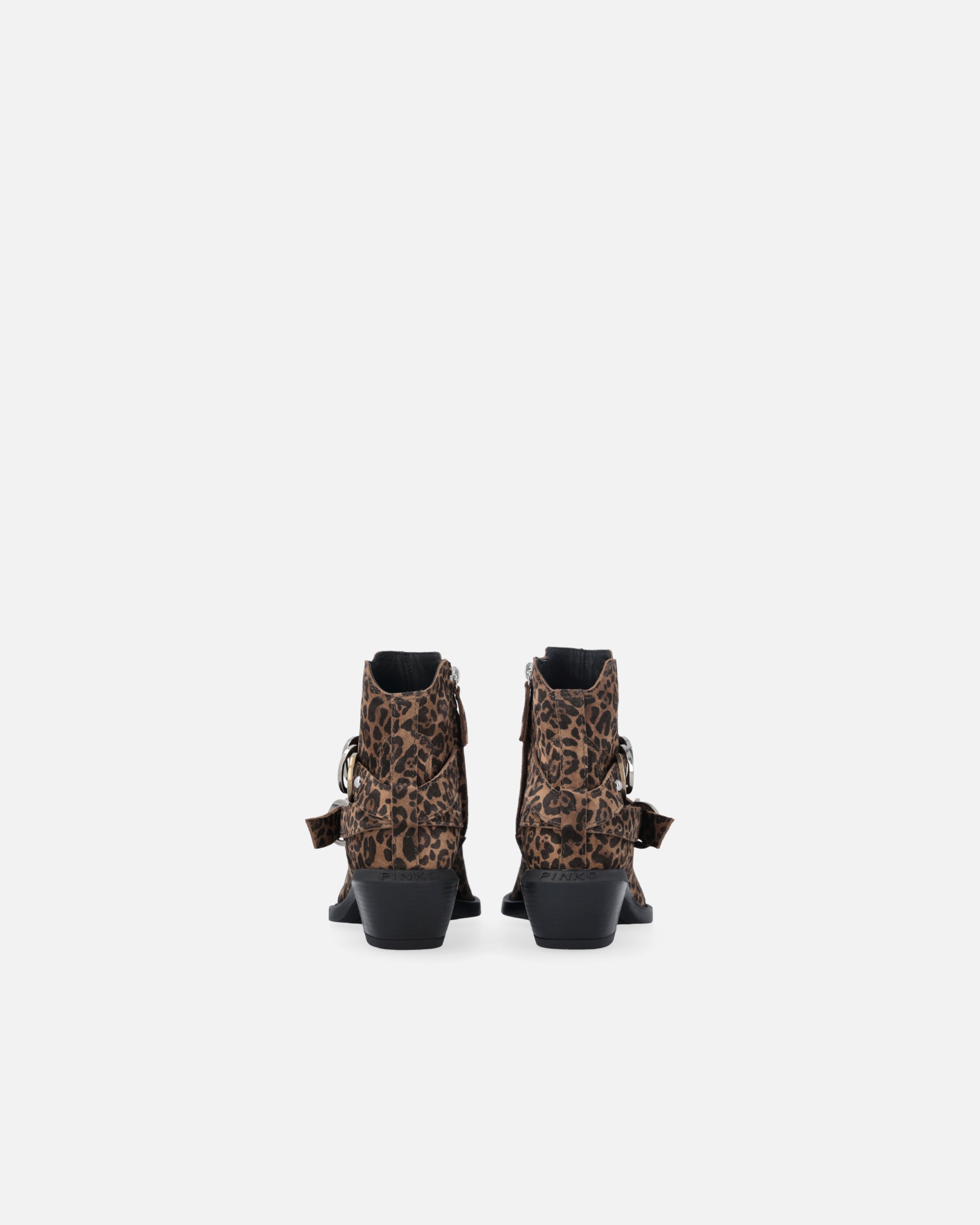 Cowboy ankle boots in fine suede with animal print and wide, 5 cm-high heel. This model, equipped with two straps, combines geometric shapes and various plated finishes to perfection, with studs and loops of different sizes skilfully alternated to dynamic effect. The pure rubber sole provides excellent thermal insulation, ensuring maximum comfort and durability. We all know that details are what make the difference: choose this bold pair to give your casual looks a unique touch.
