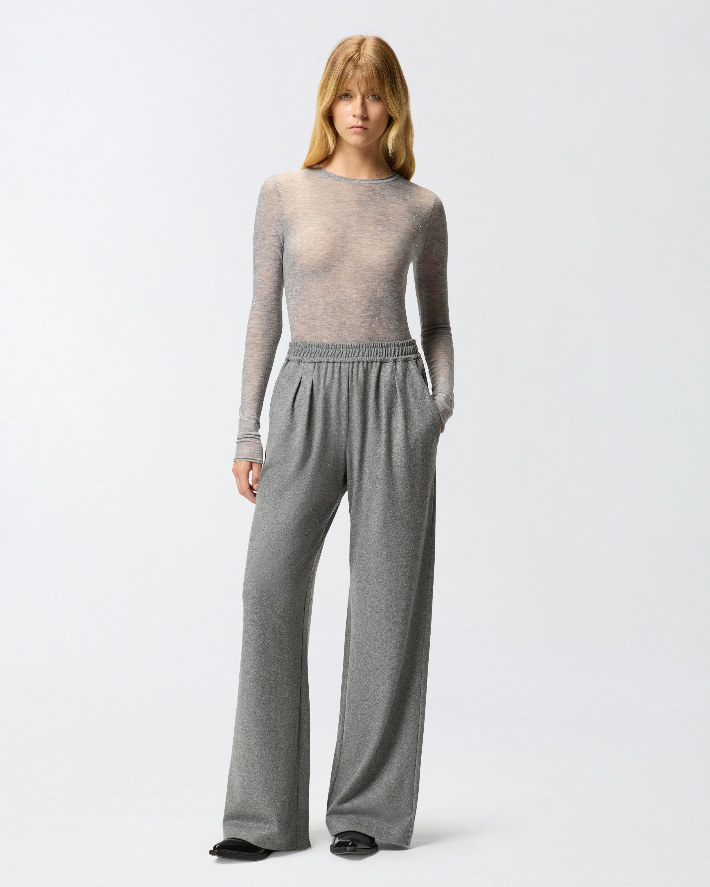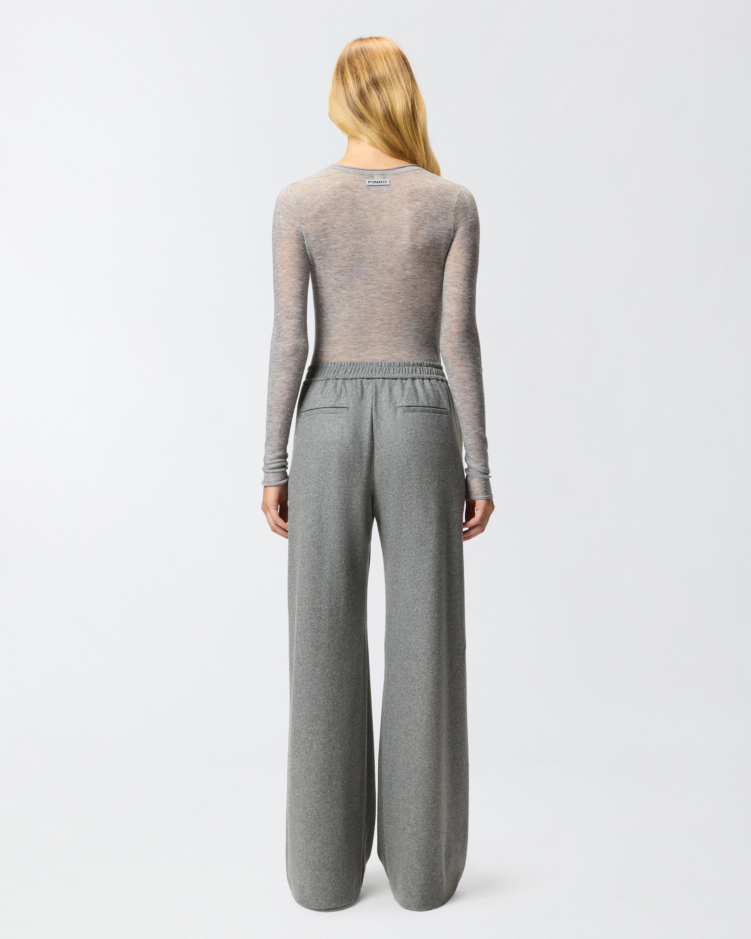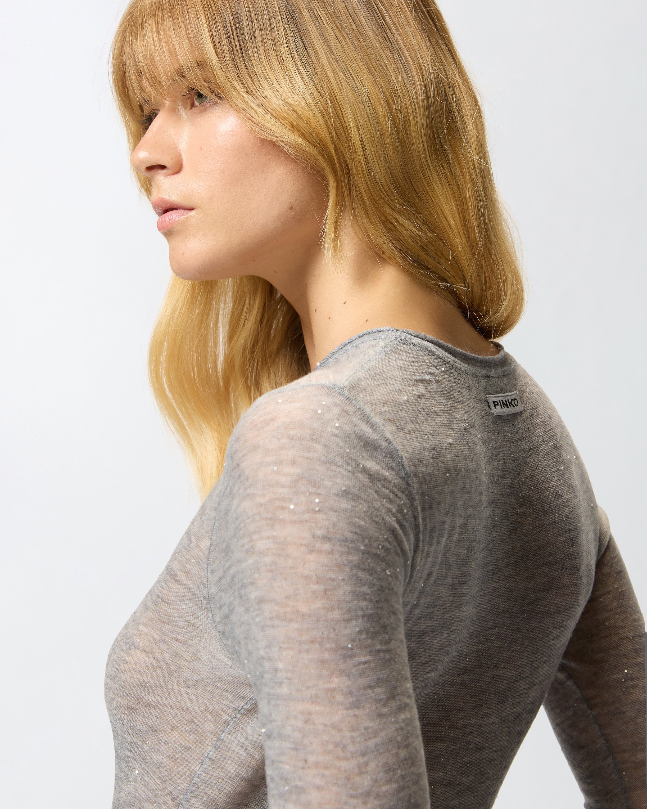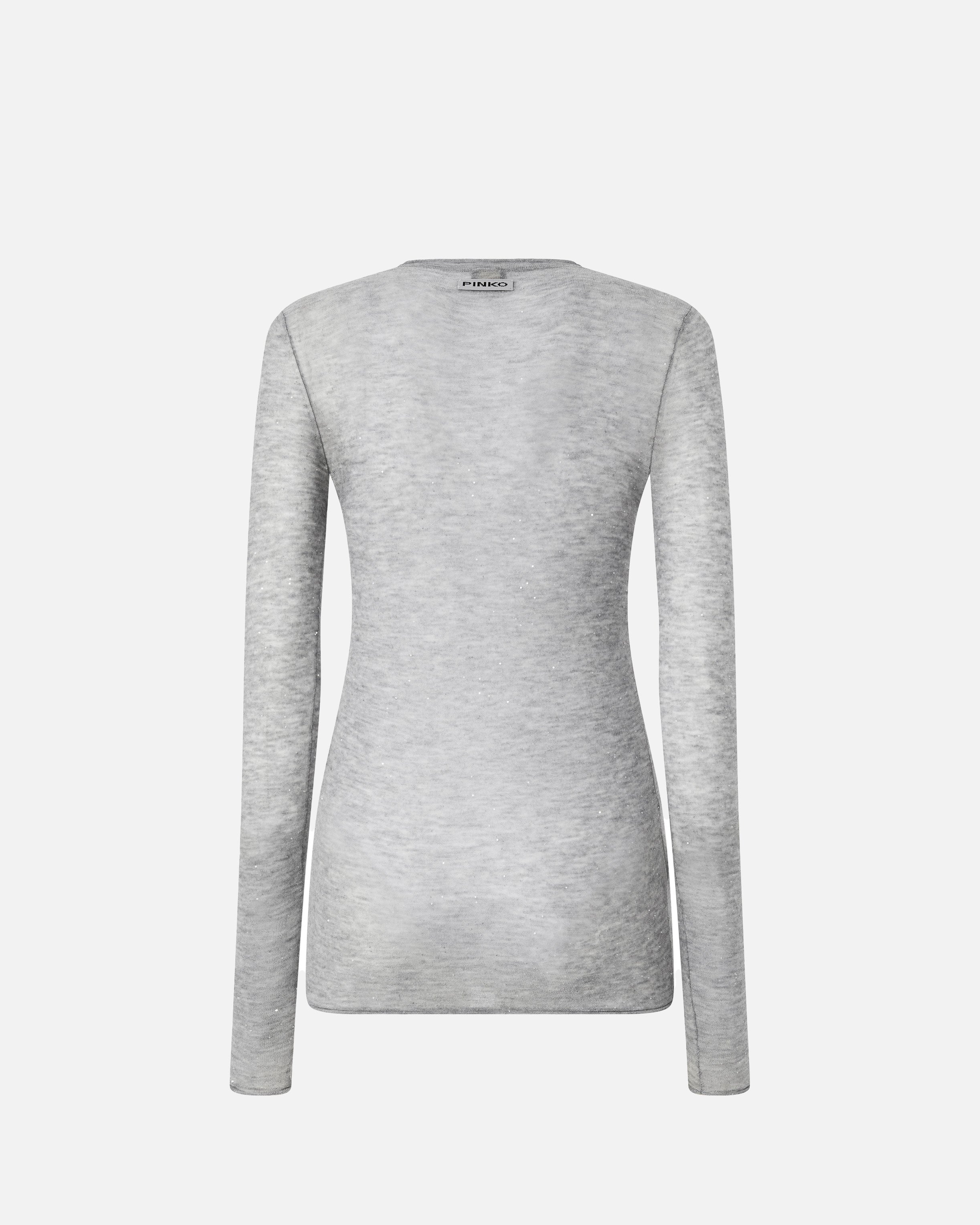 Crew-neck sweater made from a semi-sheer wool blend: a lightweight and soft yarn that is almost impalpable, which helps create a sensual and striking look. The design is embellished with micro-sequins inserted in the thread and manages to be shiny and understated and extremely comfortable to wear. The piece has undergone finishing tests to minimise the possible formation of pilling, ensuring greater fabric softness and durability. The final touch is given by the label with PINKO lettering logo on the back.