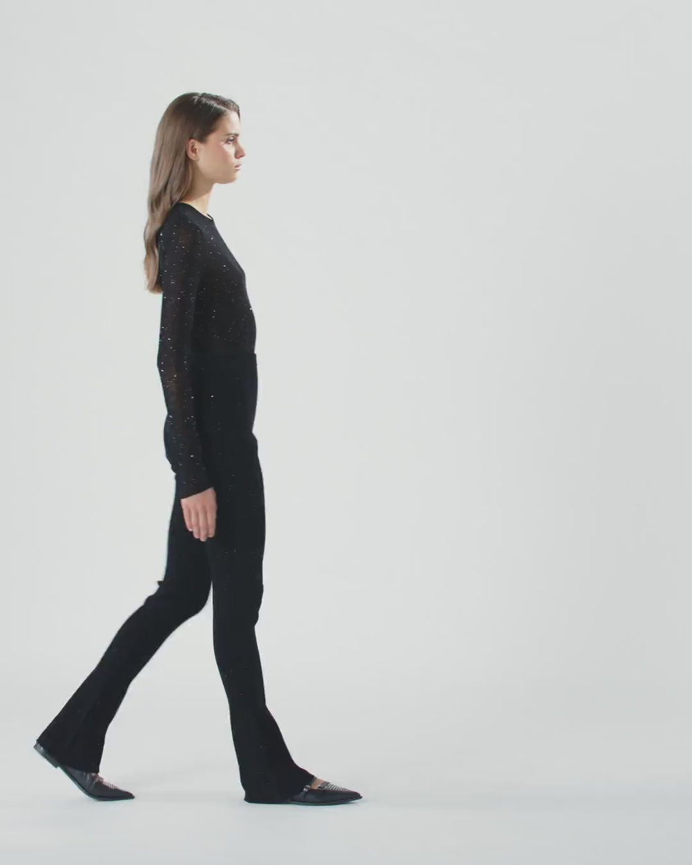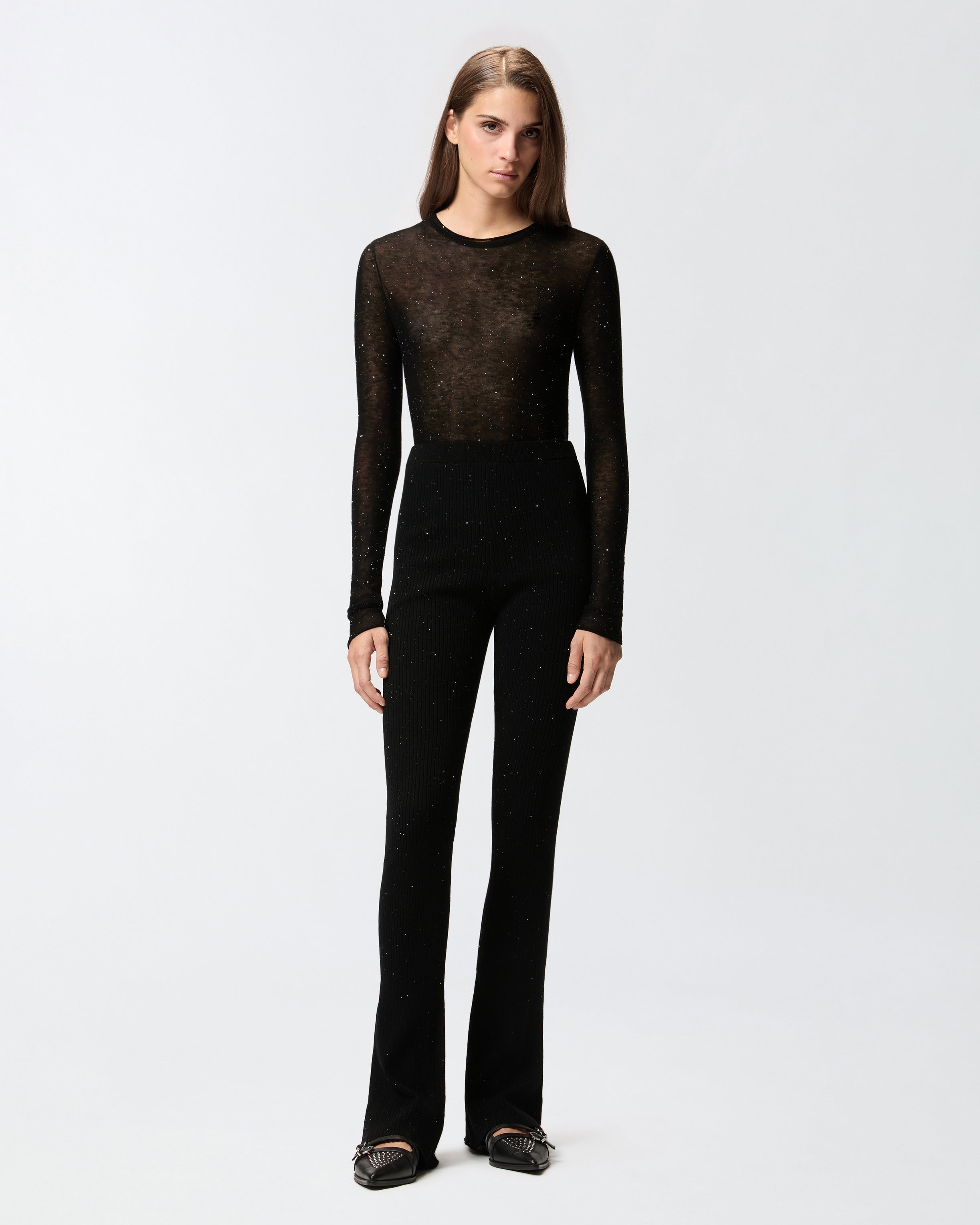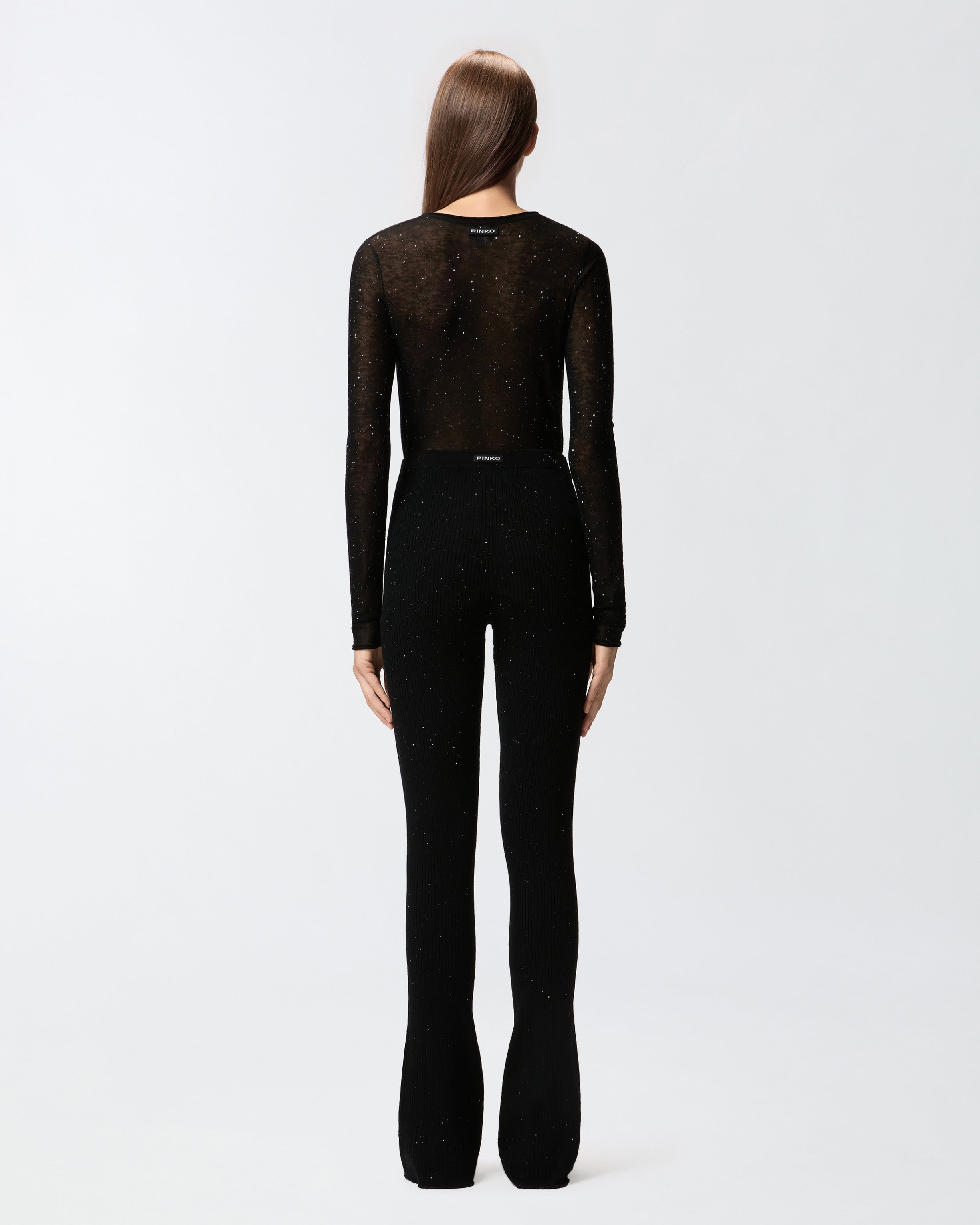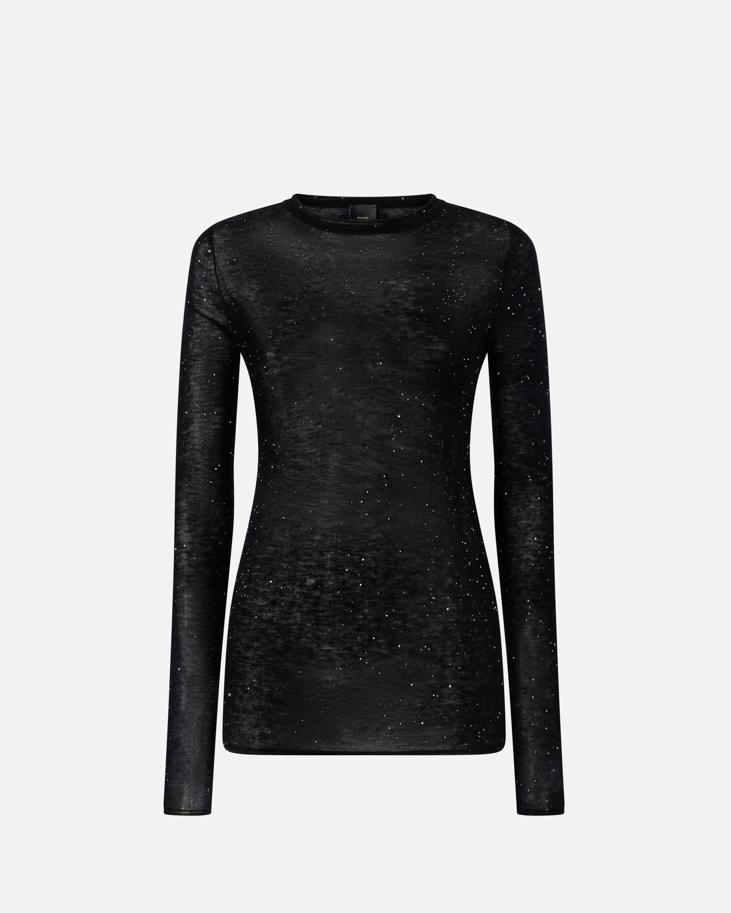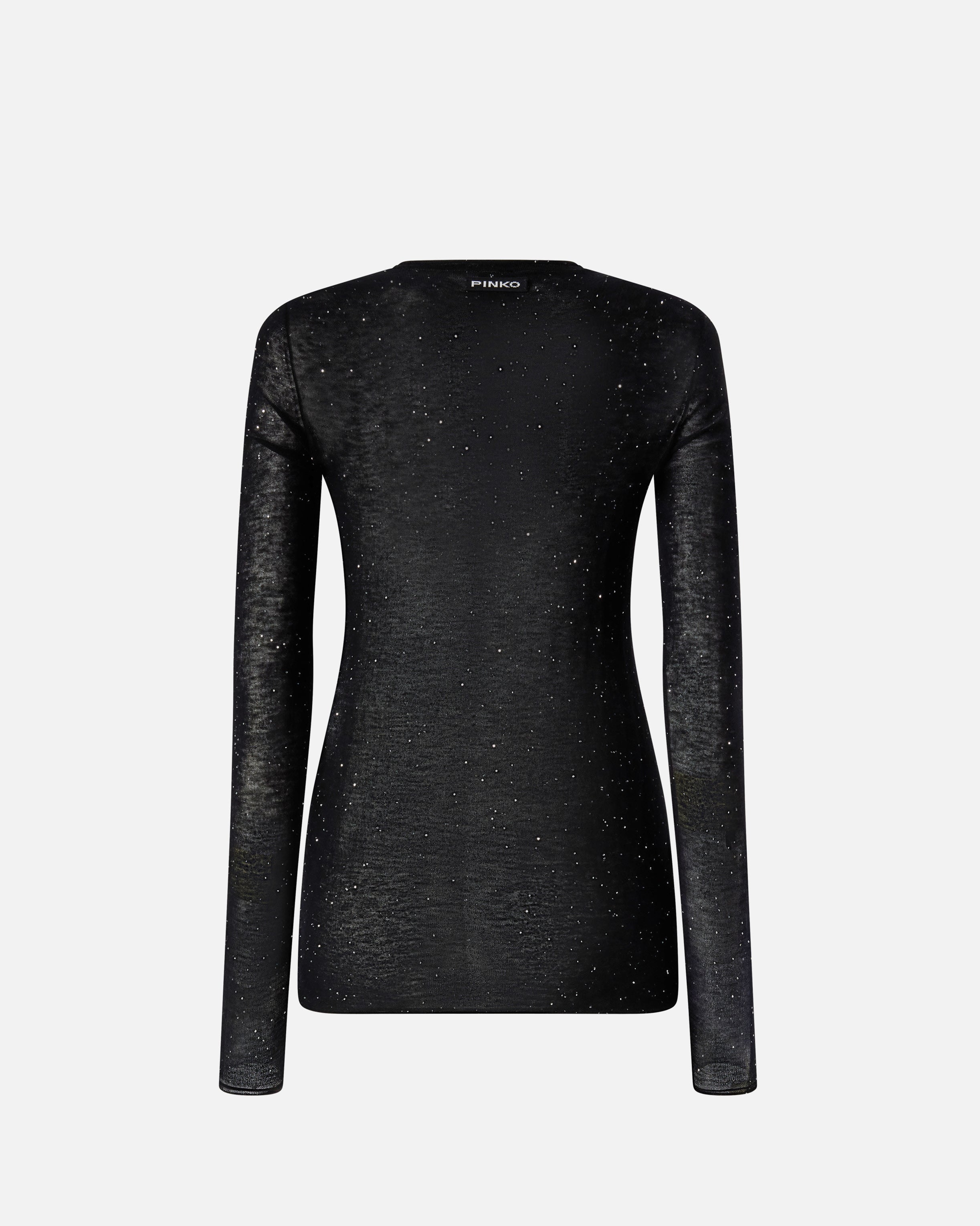 Crew-neck sweater made from a semi-sheer wool blend: a lightweight and soft yarn that is almost impalpable, which helps create a sensual and striking look. The design is embellished with micro-sequins inserted in the thread and manages to be shiny and understated and extremely comfortable to wear. The piece has undergone finishing tests to minimise the possible formation of pilling, ensuring greater fabric softness and durability. The final touch is given by the label with PINKO lettering logo on the back.