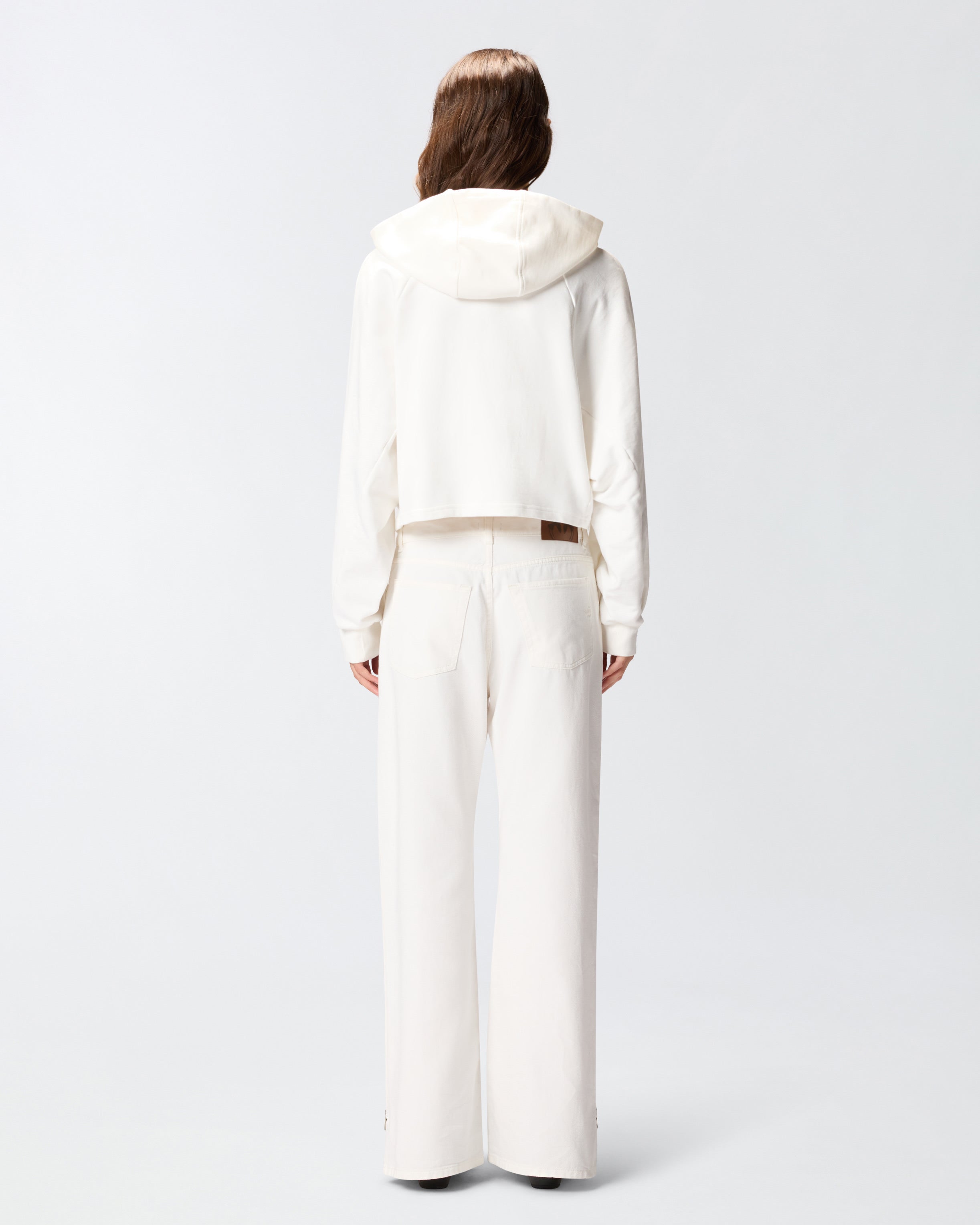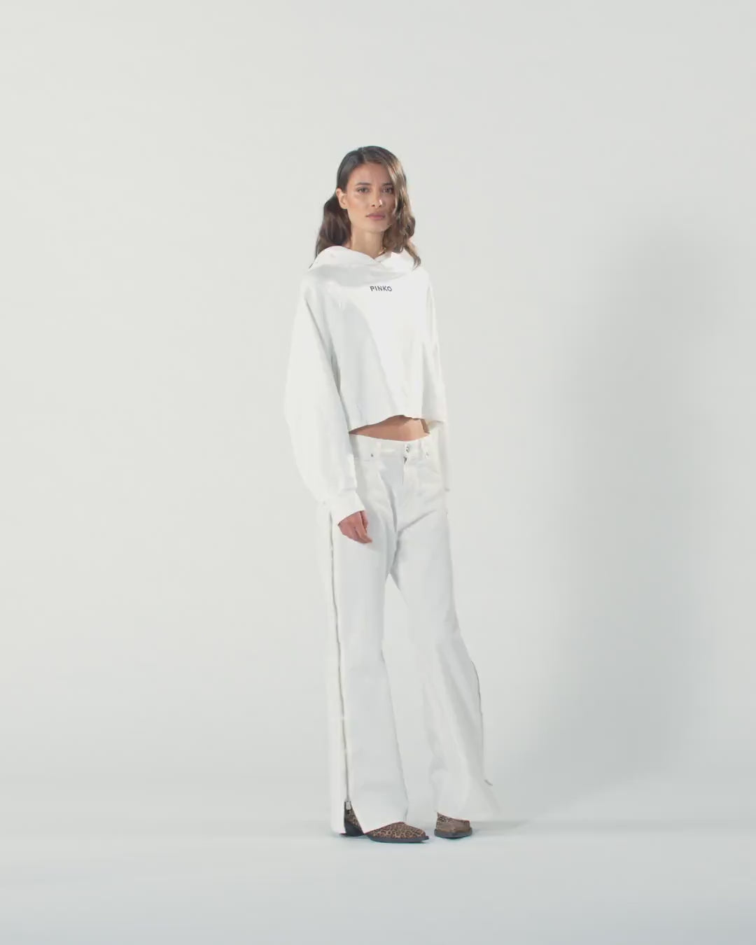 Cropped cotton hoodie with long raglan sleeves, with stretch fabric hem and cuffs. The PINKO lettering logo embroidered with contrasting thread adds a custom touch to the piece. Create the perfect total look for the office by pairing it with the matching trousers and a sports jacket for a feminine look that is all about comfort.