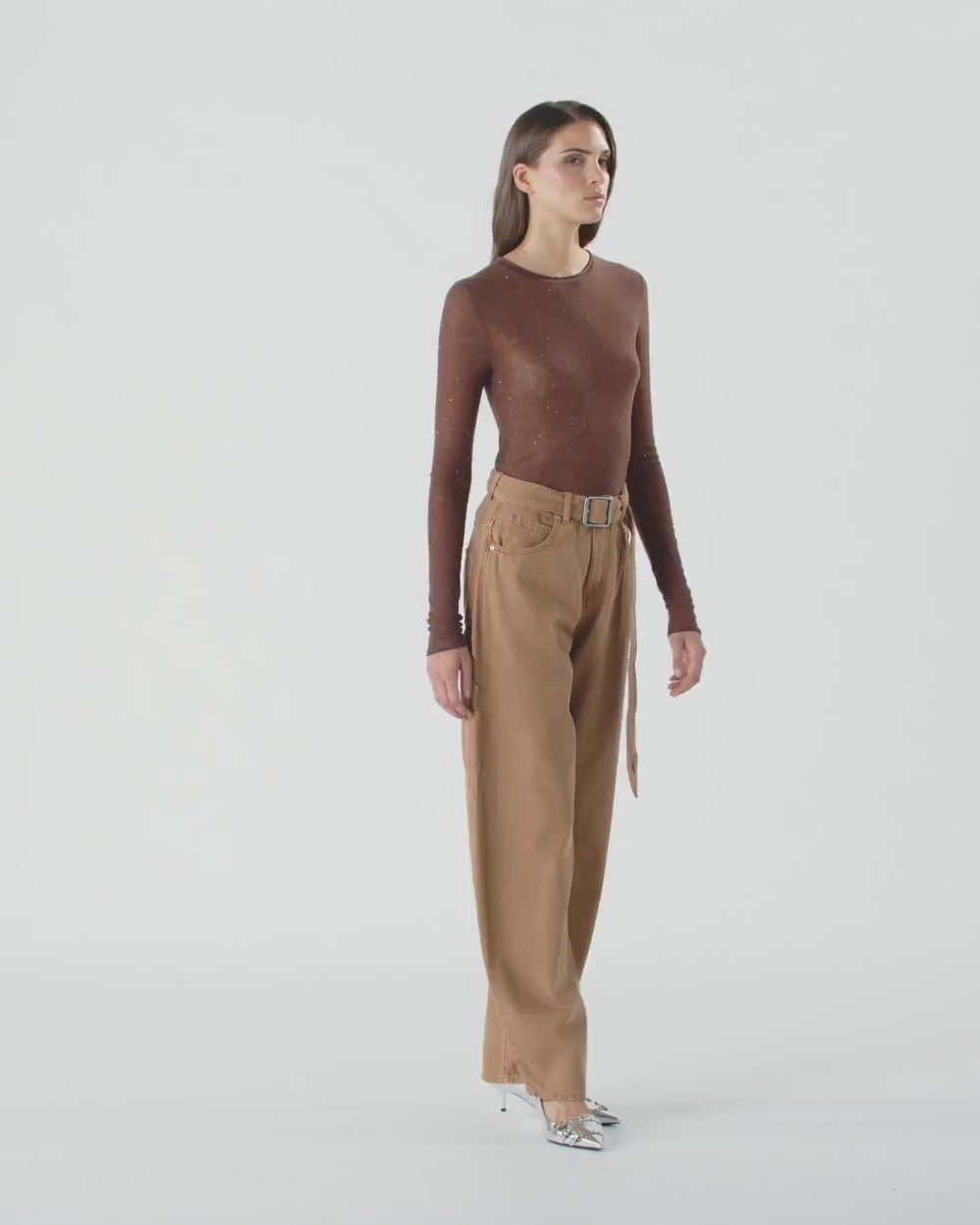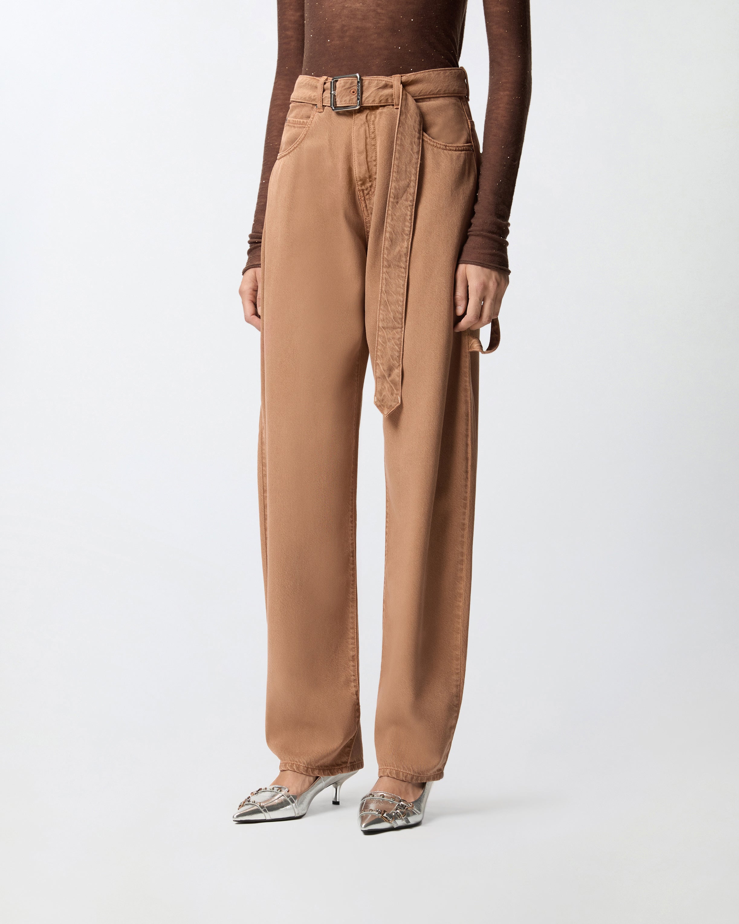 Balloon-fit trousers with a soft balloon leg that is rounded at the top and more cinched on the hem. The model is made from cotton and lyocell denim, a particular float-woven fabric that allows for a more fluid and comfortable hand when worn, and is treated with an old-effect dye that recreates slight discolouration. Complete your wardrobe with these workwear-inspired five-pocket jeans, finished with a detachable matching belt with metal buckle, double ruler holder on one leg, and hammer loop on the other. Concealed zip and button fastening.