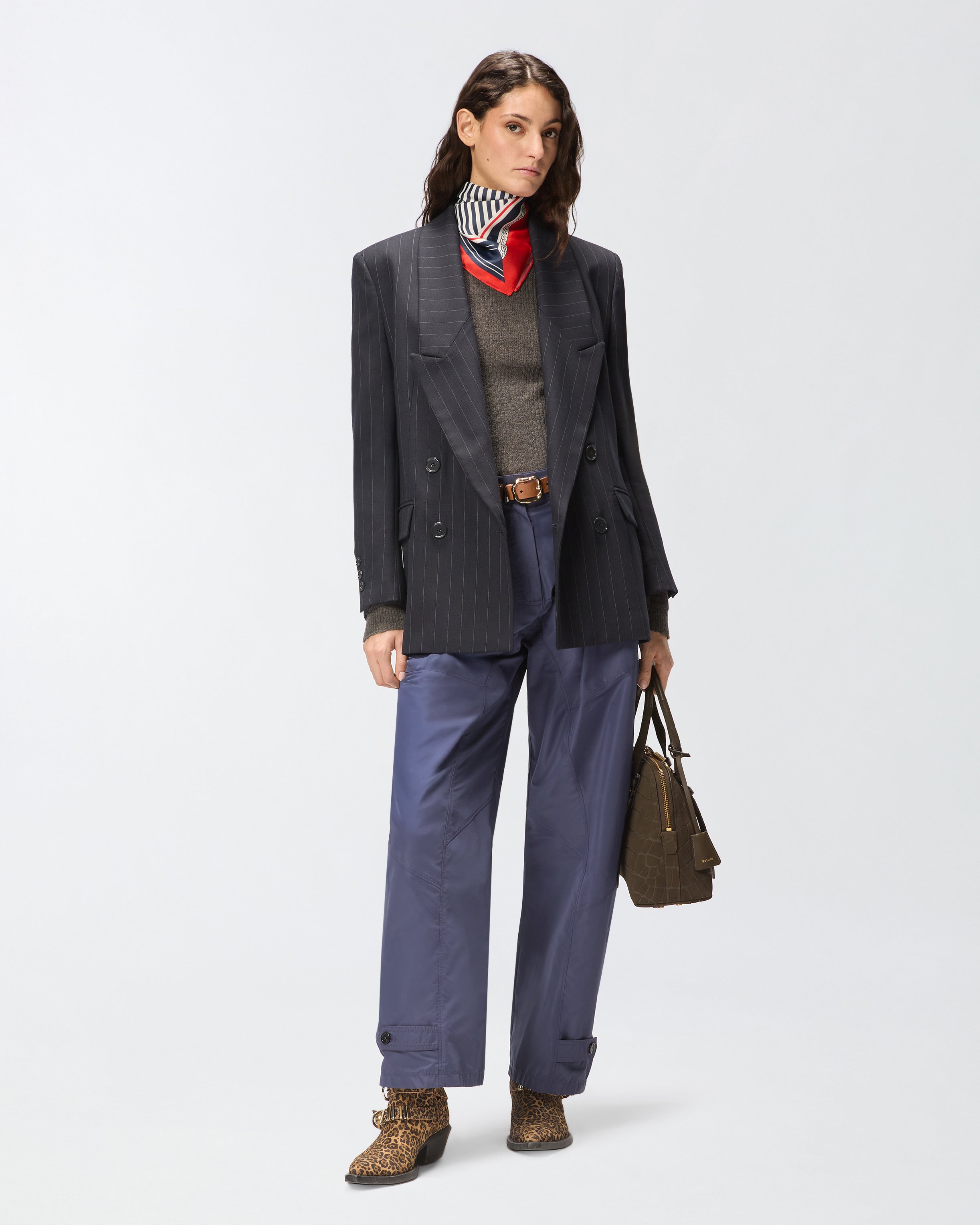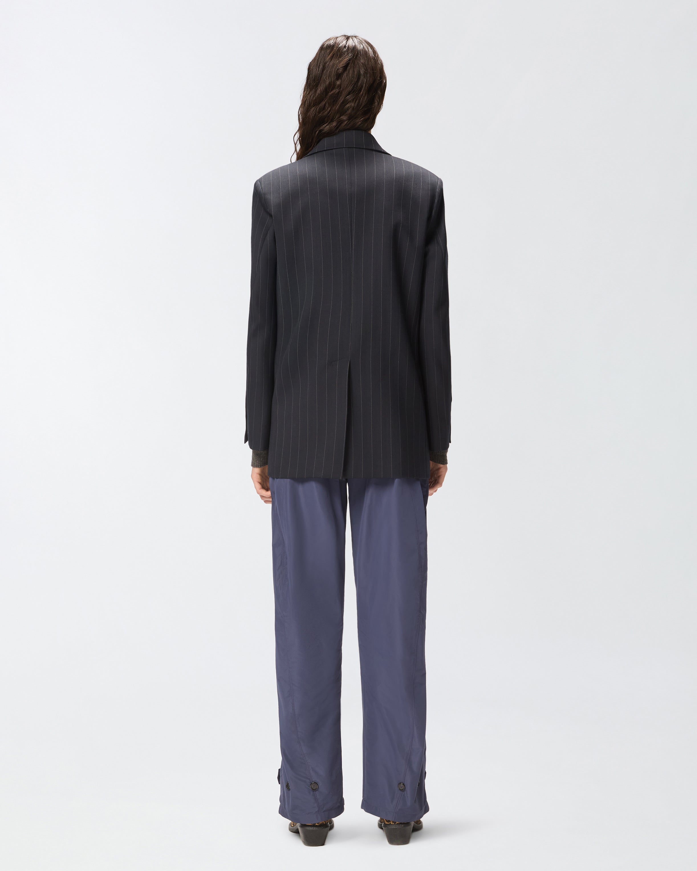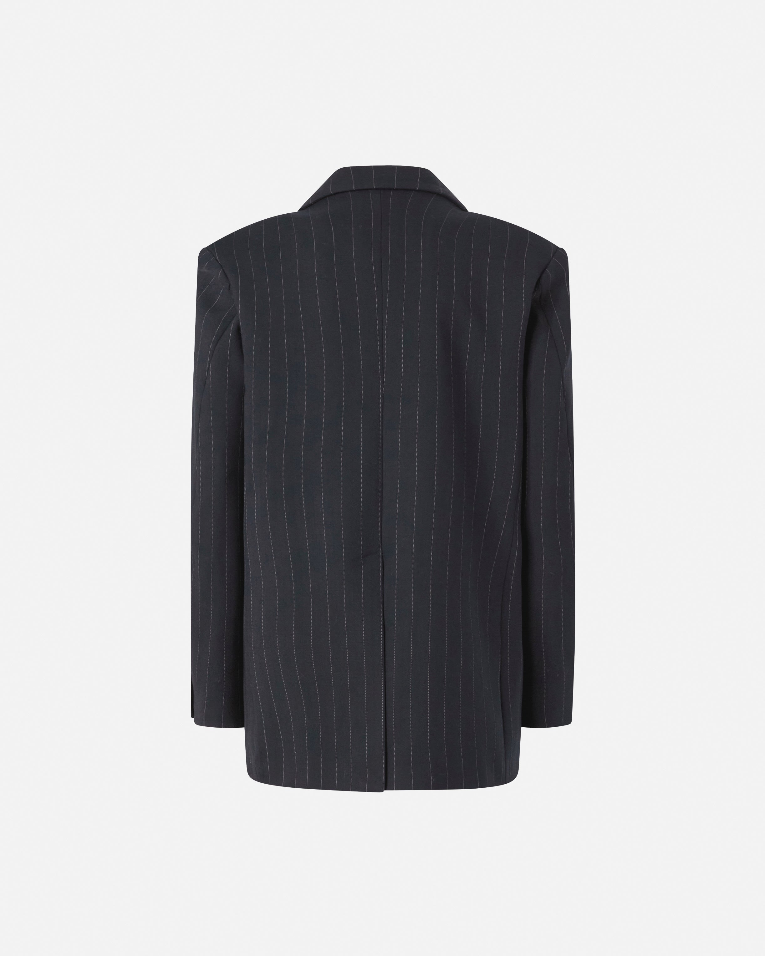 Double-breasted blazer jacket with a masculine look, characterized by a straight line with a central slit on the back, flap pockets and a lapel collar with lowered spears. The fabric used is a classic poly wool pinstripe characterized by a change of texture and light to emphasize the design of the material. Combine the jacket with trousers in the same fabric to create an elegant yet contemporary outfit.