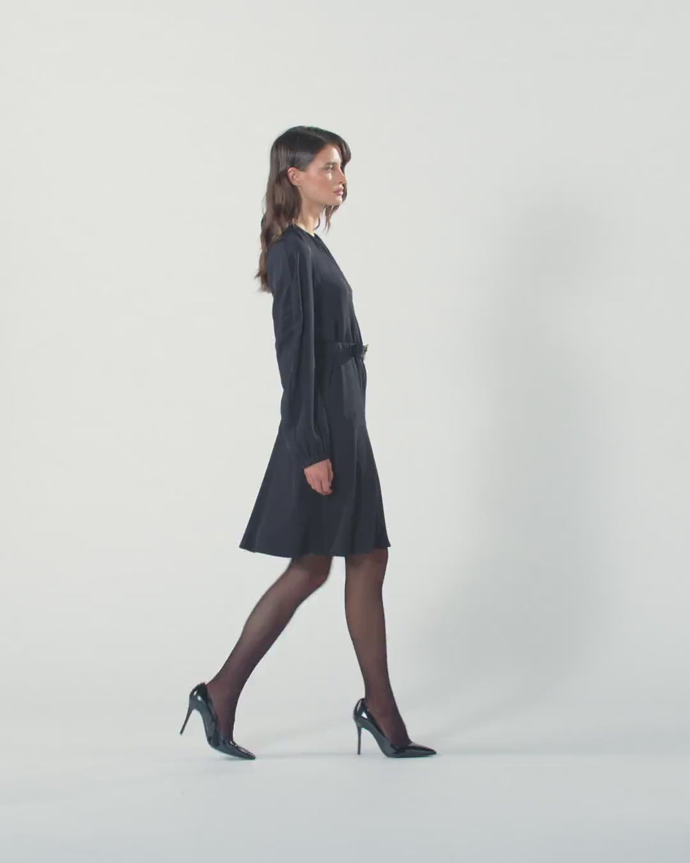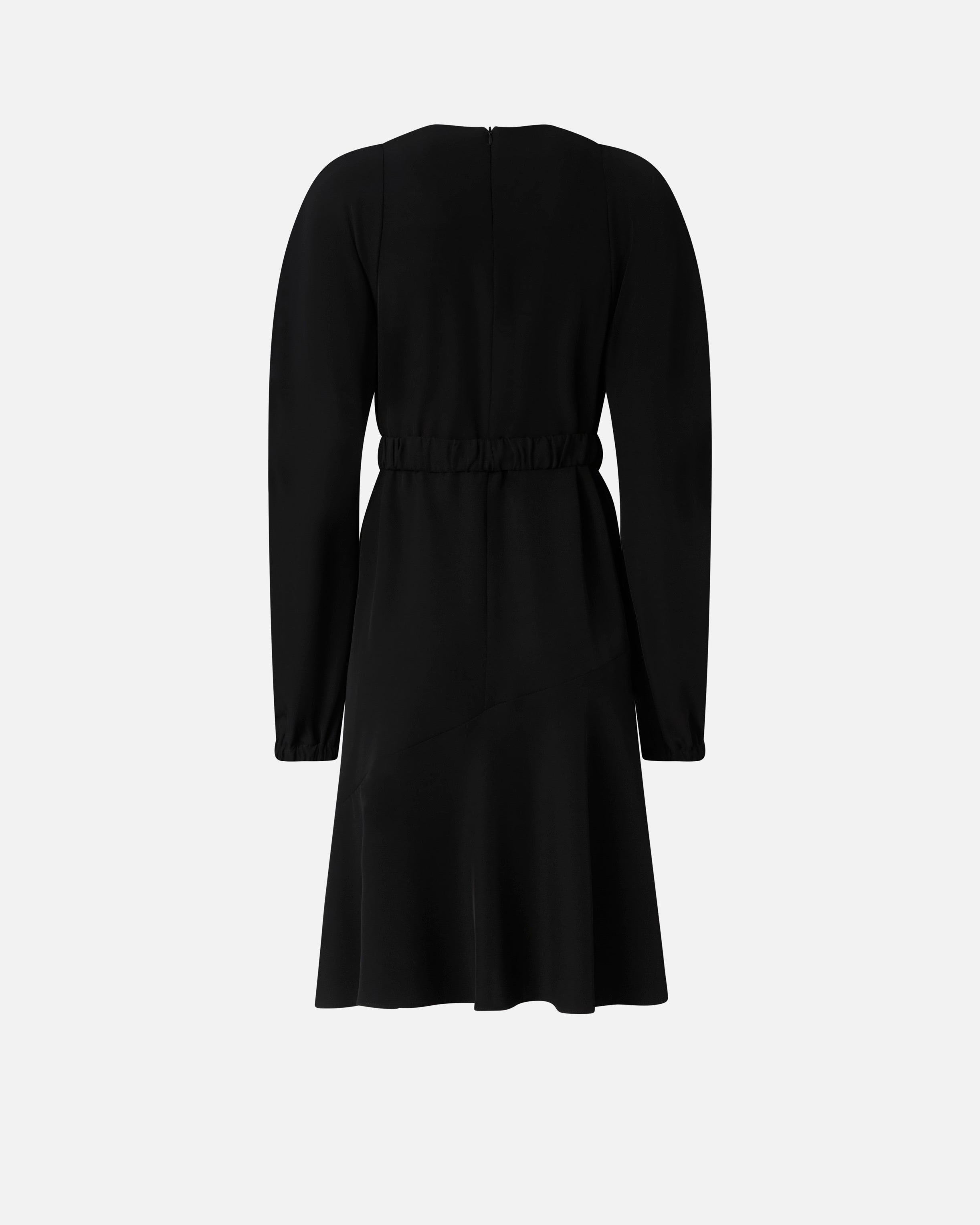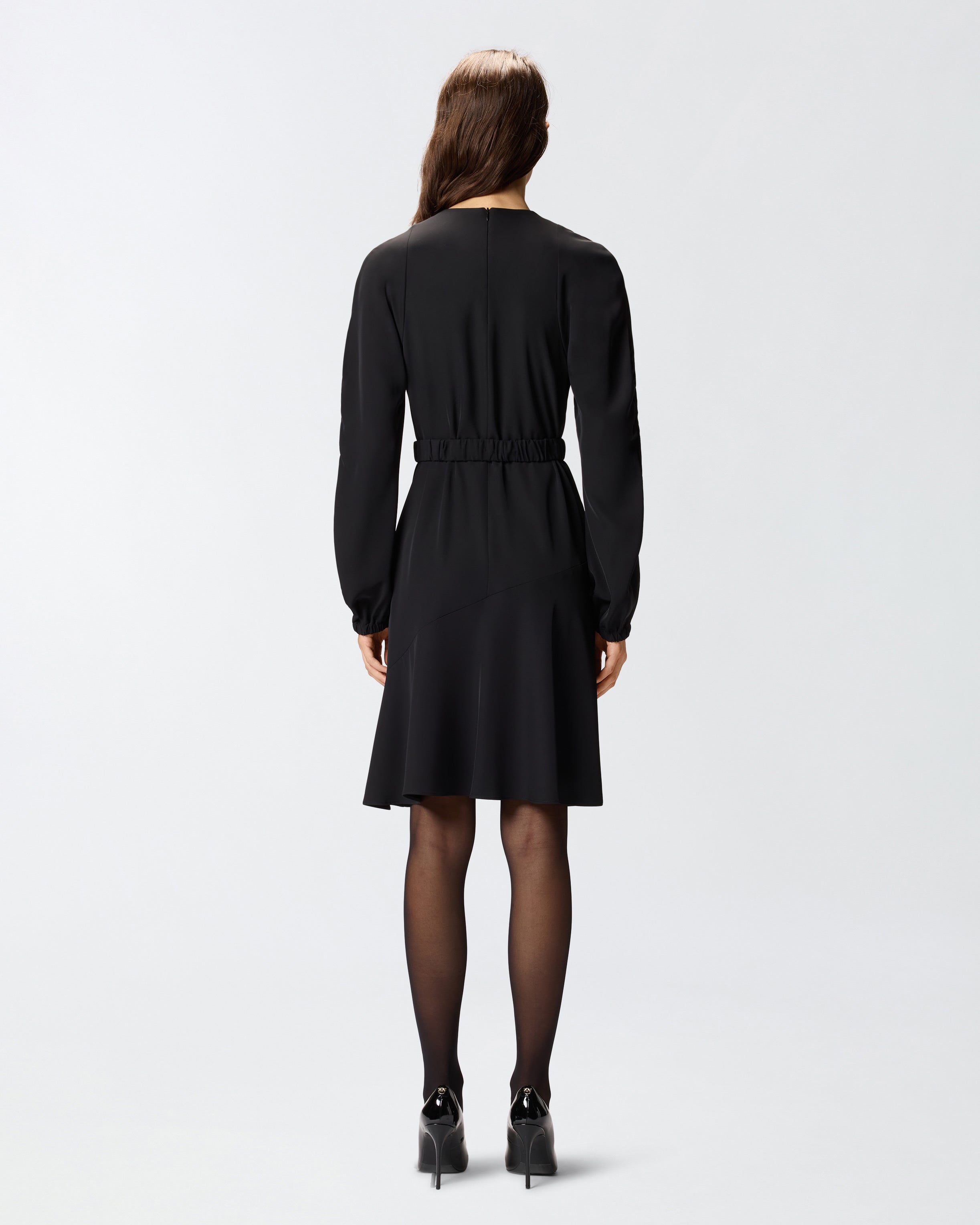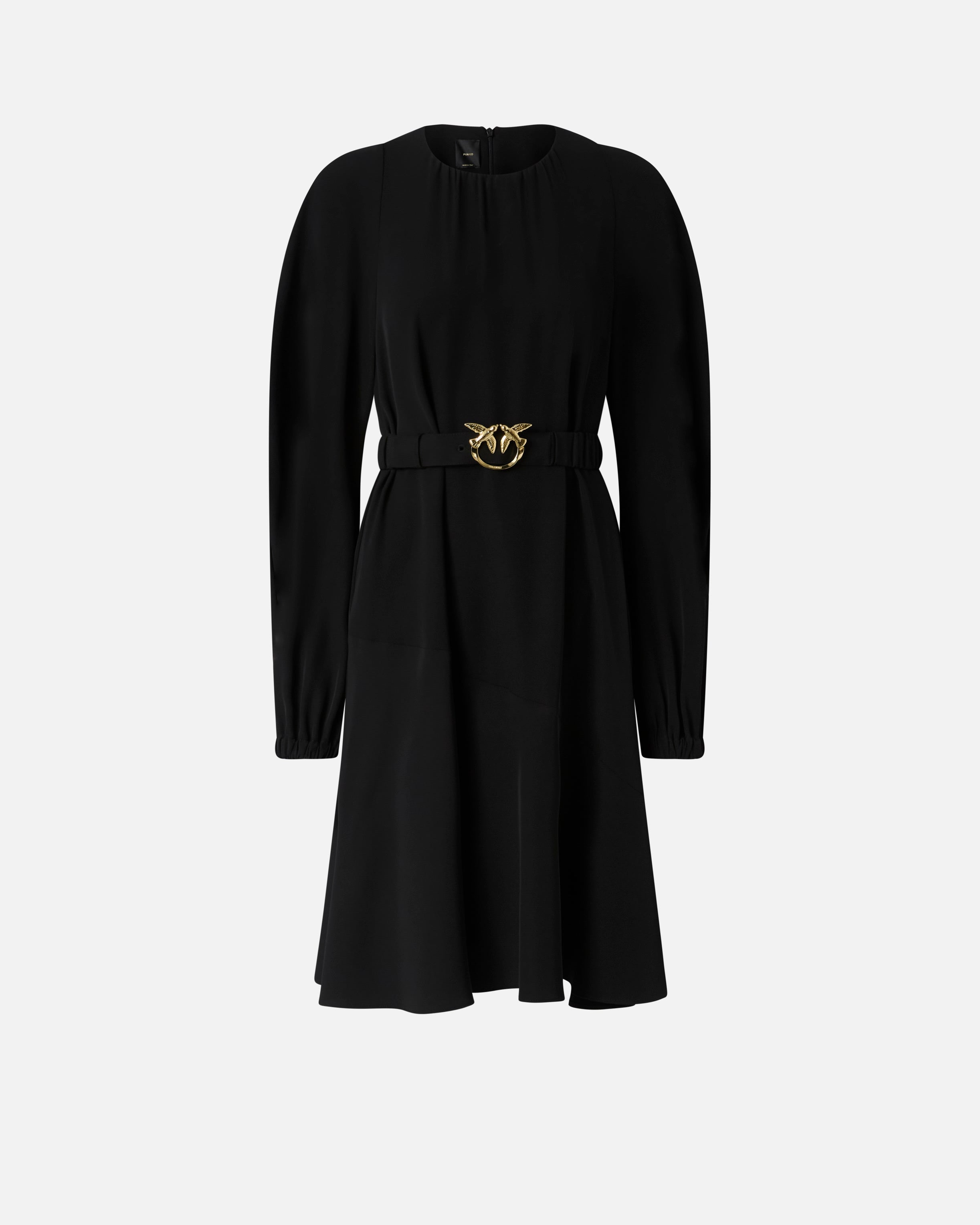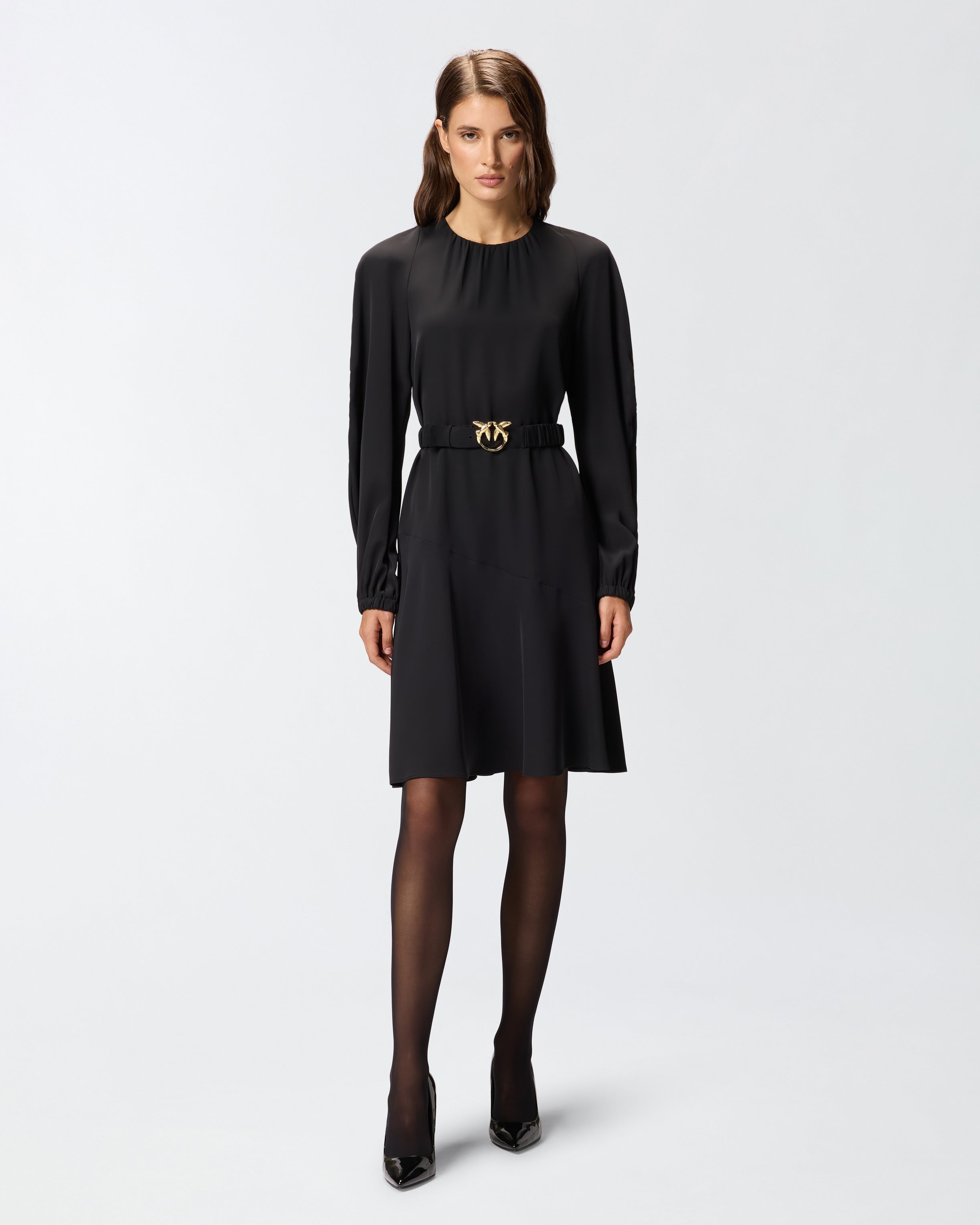 Calf-length dress with a gathered round-neck on the front and long balloon sleeves that end in stretch cuffs. The fluid fabric with a washed effect helps to offer softness and volume to the dress. This fitted style is more cinched on the sides. Complete with a matching-fabric belt with the metal Love Birds Diamond Cut buckle. Invisible zip fastening on the back. Wear it every day to get practicality and femininity in one piece that can be worn from the office to after-work drinks.