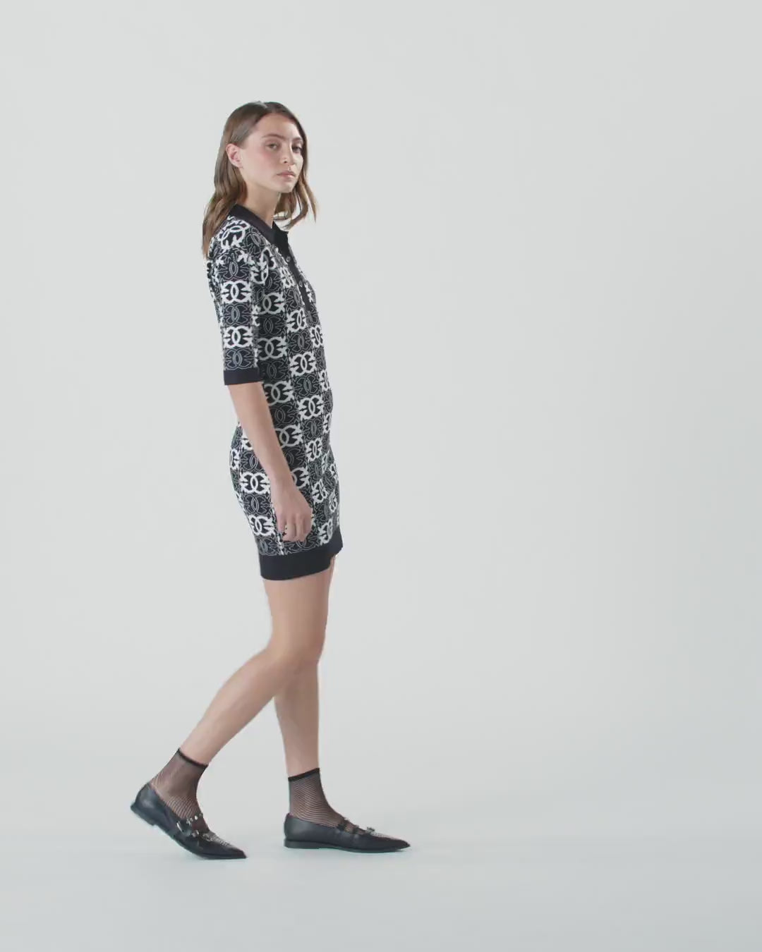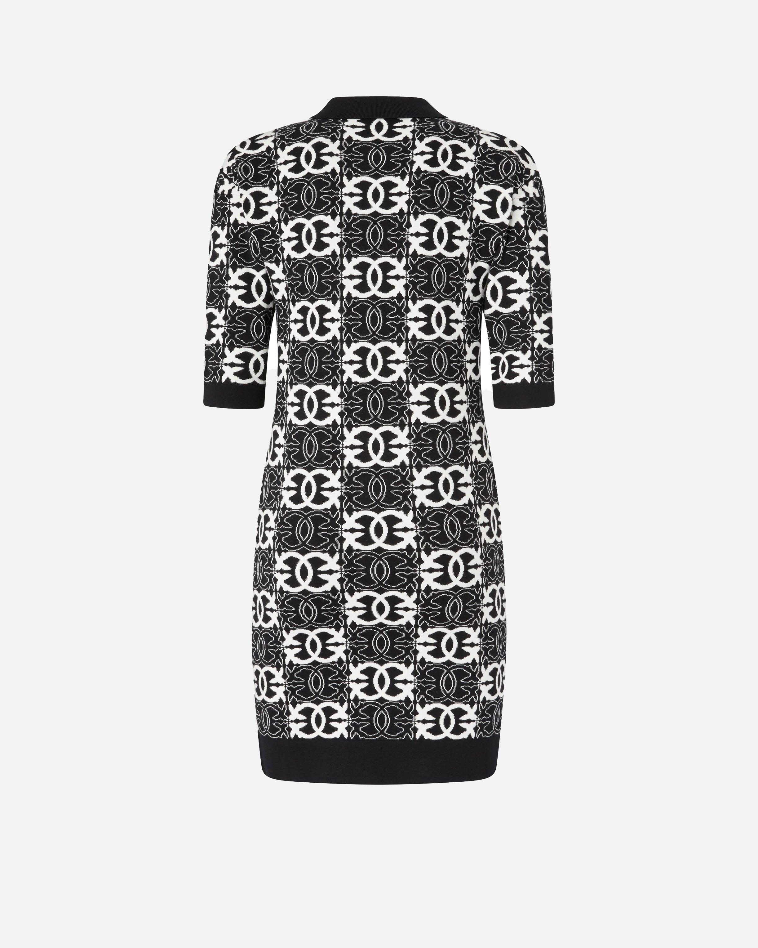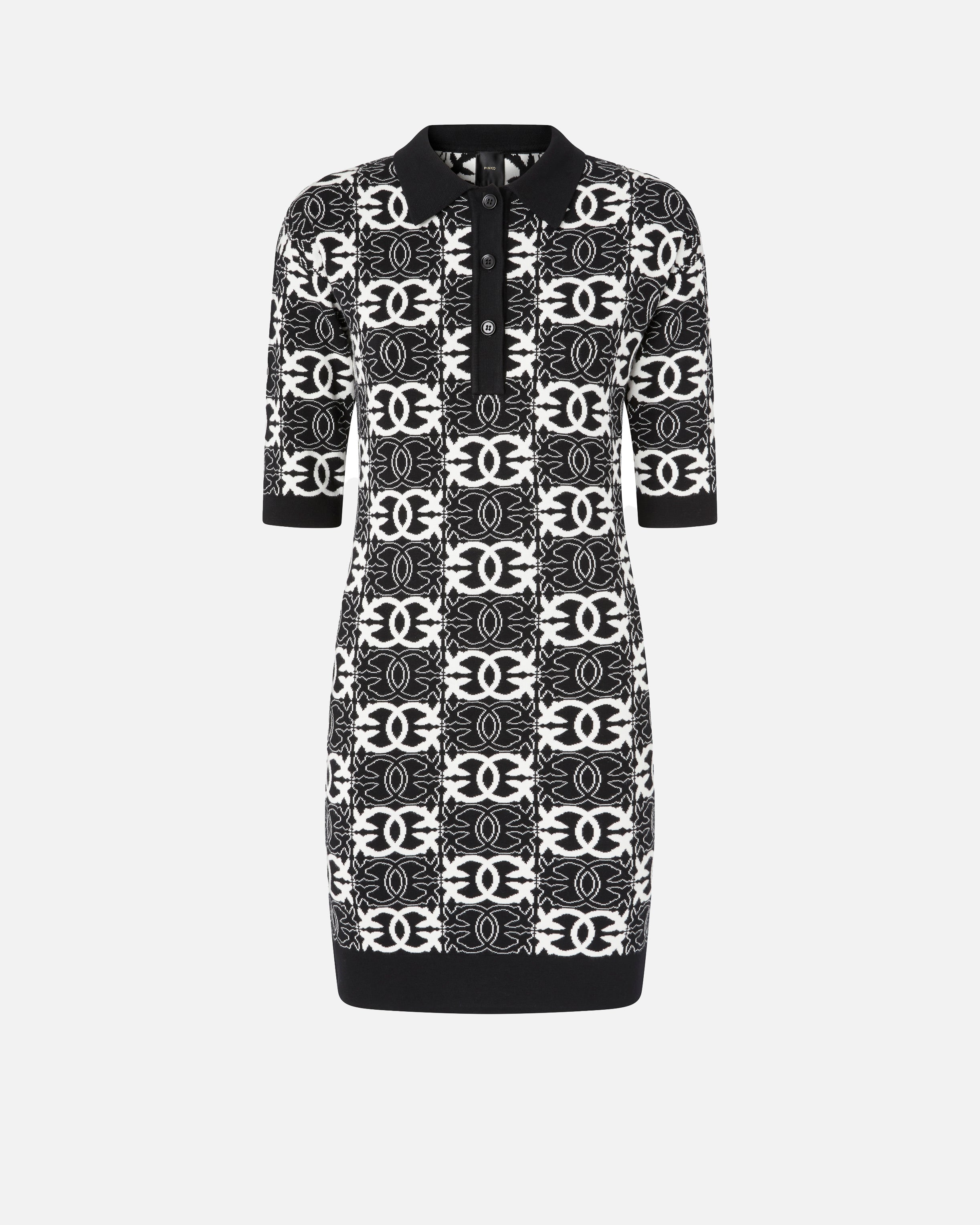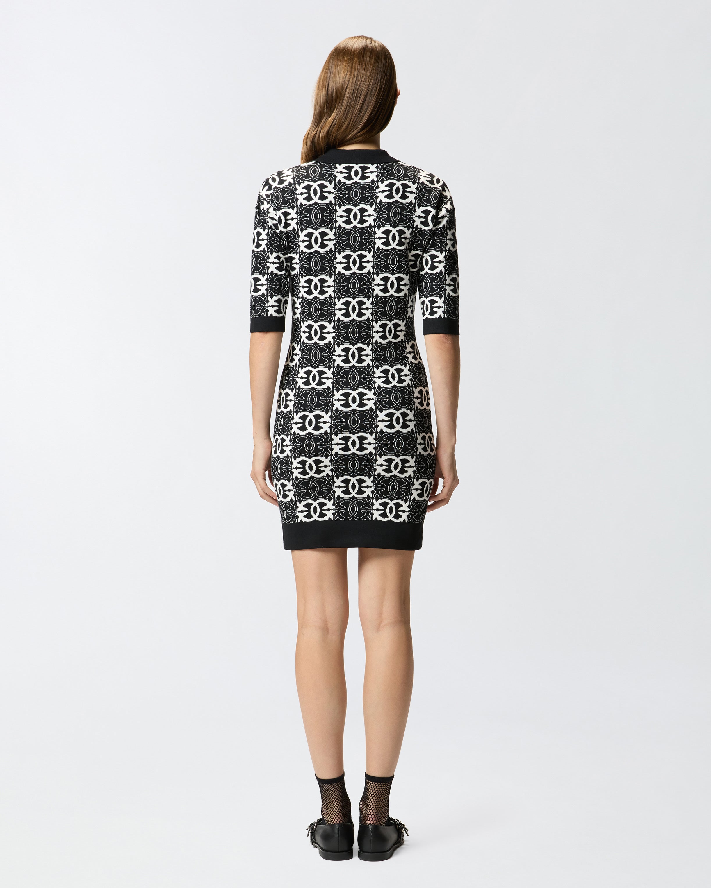 Knit mini dress with short sleeves, polo-style collar and comfortable slim fit. This model features a contrasting collar, placket and hems, while the all-over jacquard Love Birds logo motif is an eye-catching detail that enhances the design. The piece has undergone finishing tests to minimise the possible formation of pilling, ensuring greater fabric softness and durability.