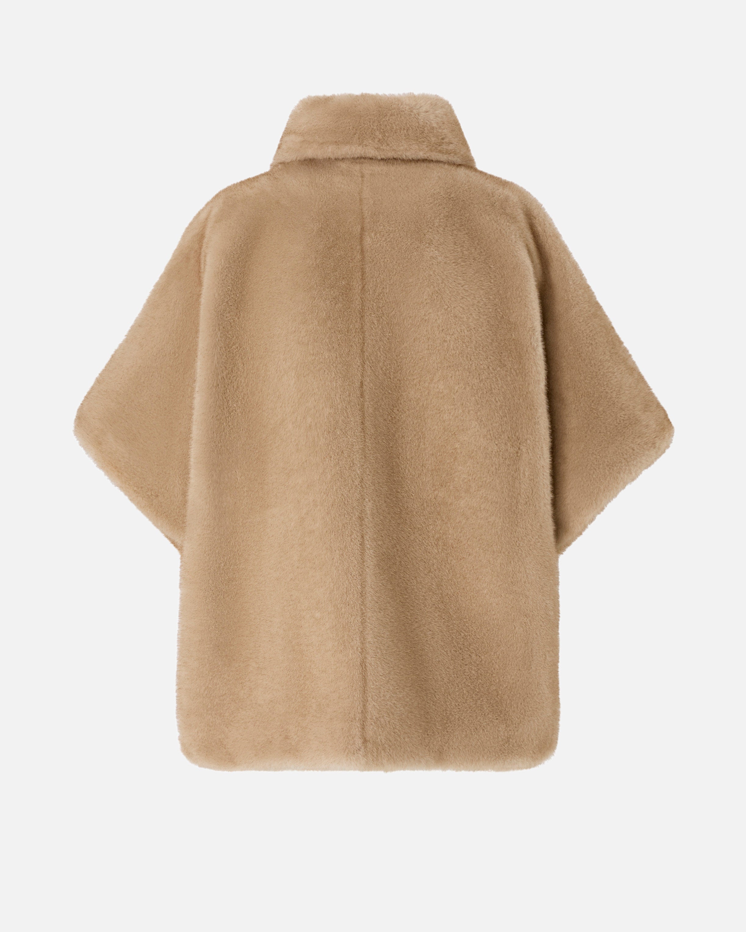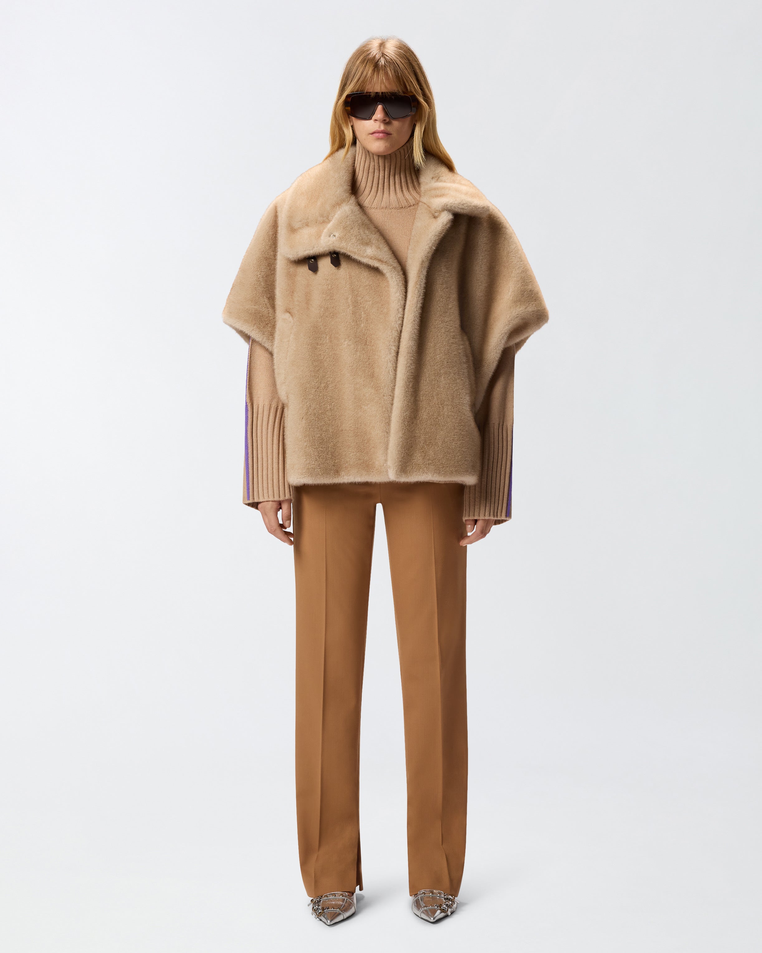 Short cape with short sleeves, welt pockets, a wraparound folded collar and off-centre front fastening. This piece is made from soft Aspen fabric with a fur effect, which is particularly pleasant to the touch. Lined model. This outerwear is ideal for wearing on cooler early-season days in the open air with maximum comfort without sacrificing a touch of style.