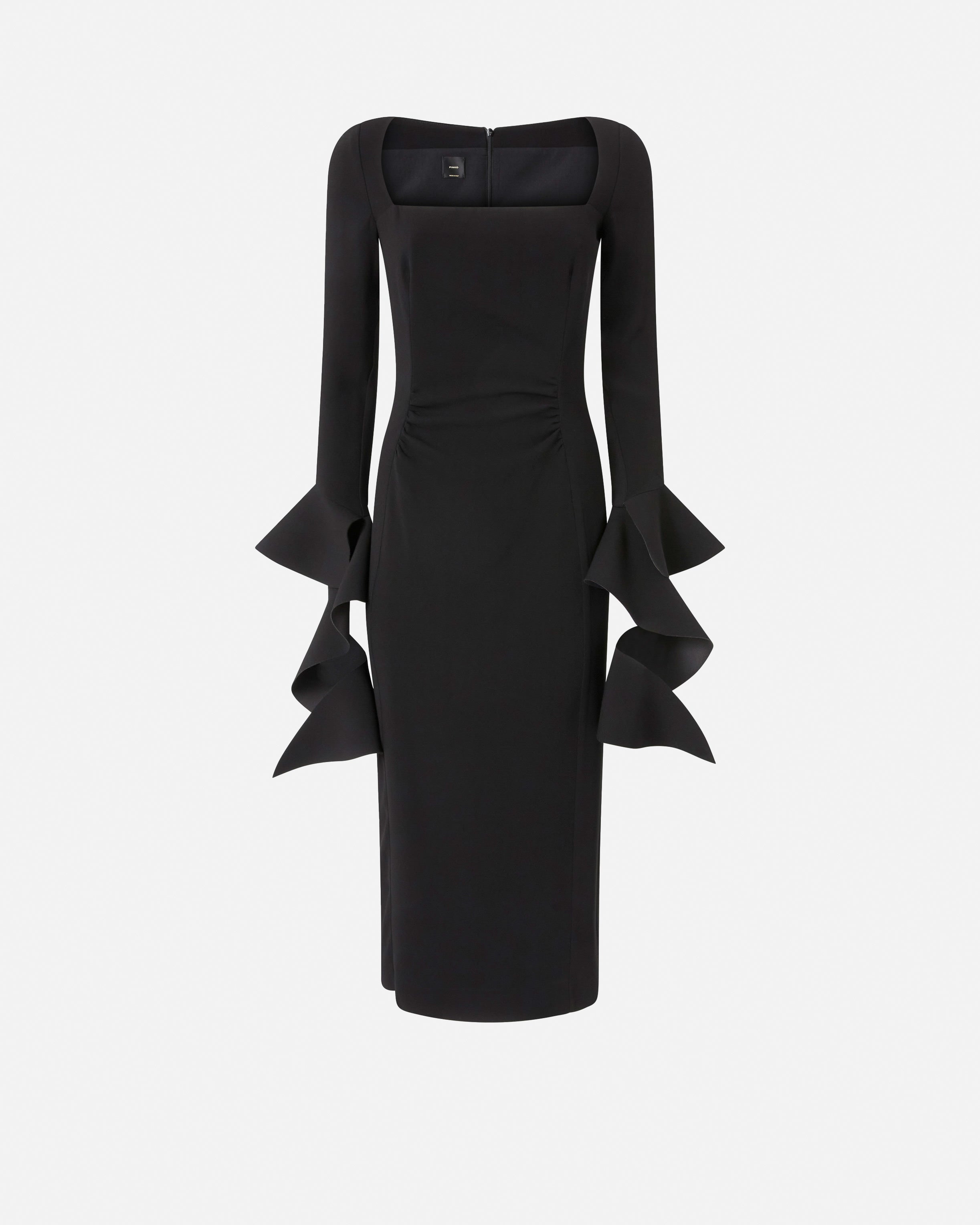 Long and elegant slim-fit dress with long sleeves and a square neckline. The shape of the skirt caresses and brings out the wearer's body figure, and there is a split in the middle at the bottom on the back. The piece is made from stretch viscose fabric, which translates into an optimal fit: the material is designed to perfectly adhere to the lines of the body, enhancing the silhouette in a natural and defined way. The spiral flounces on the side flaunt the satin fabric, creating shiny/matte contrast that enhances the texture. The mix of shapes adds movement to this refined look, without losing a structured and feminine final effect.