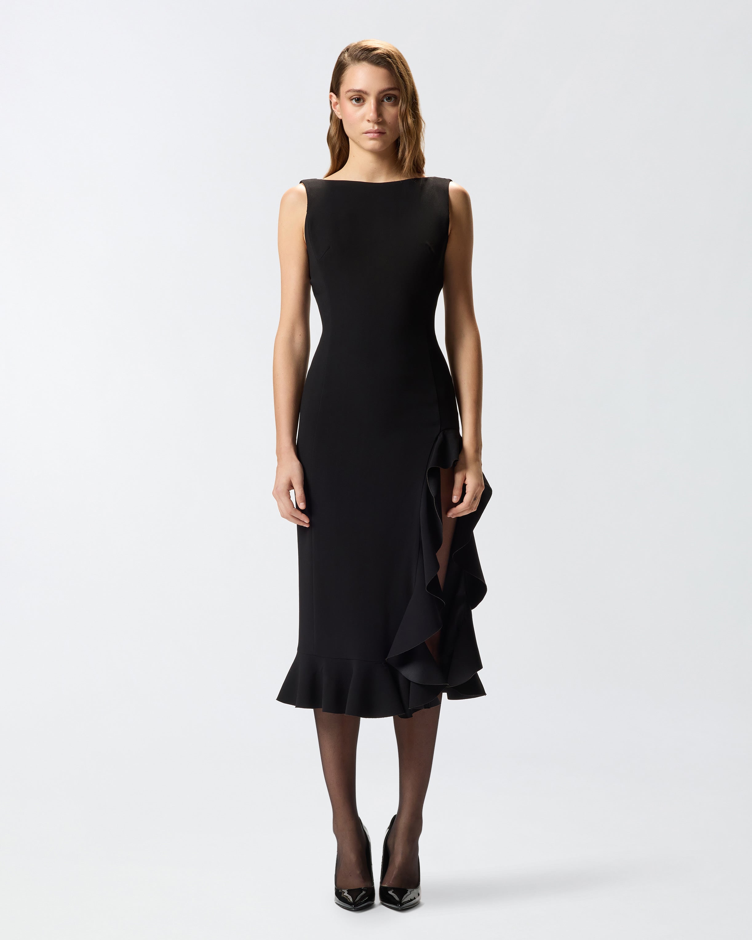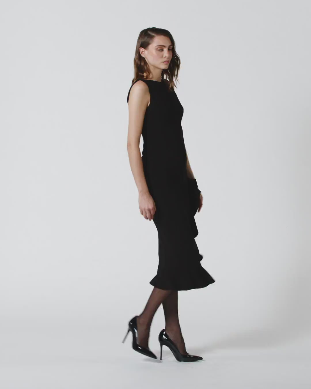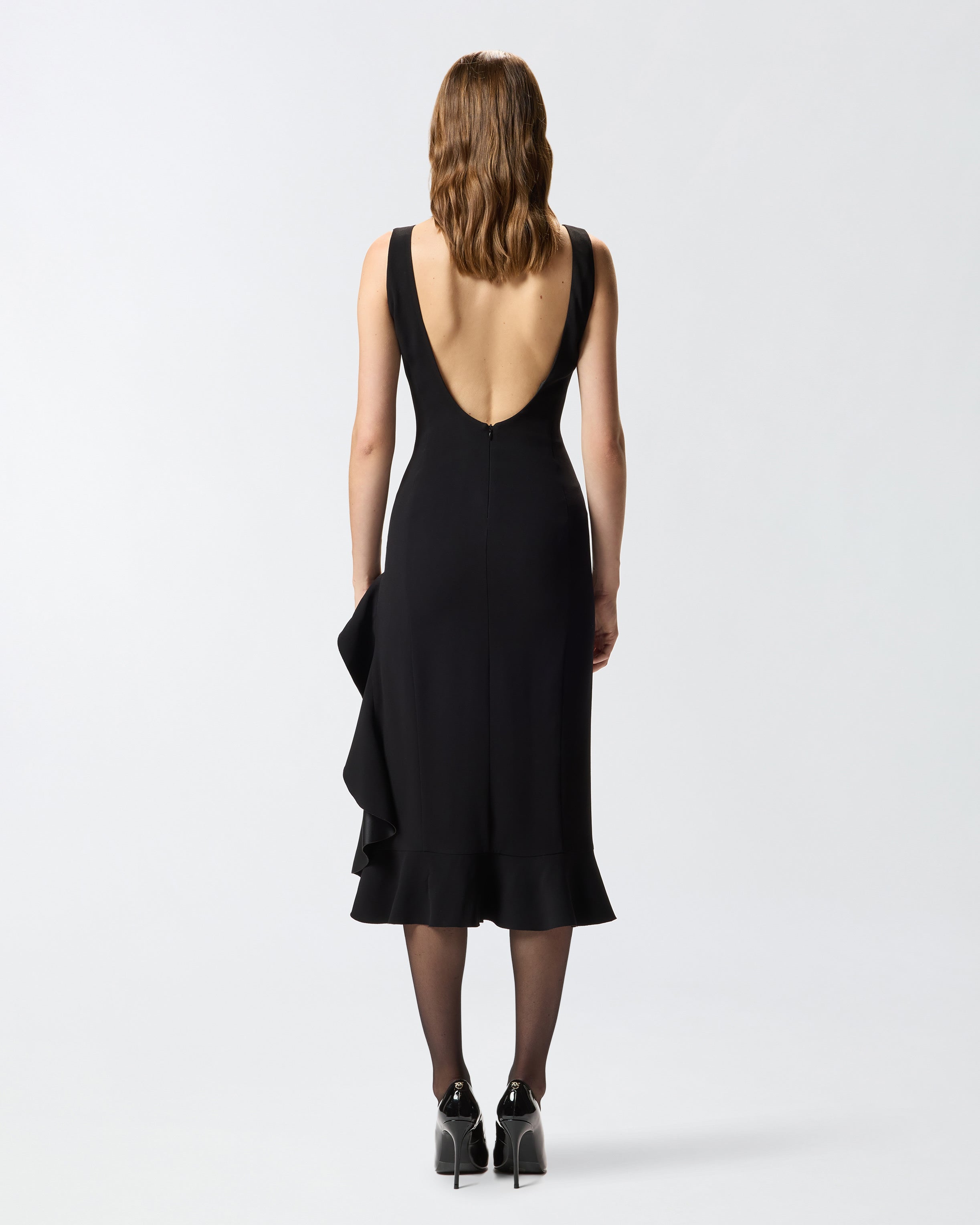 Long sleeveless dress with a deep neckline on the back, made from stretch viscose fabric, which translates into an optimal fit. The material has been designed to perfectly adhere to the lines of the body, enhancing the silhouette in a natural and defined way. Laser-etched spiral flounces paired with satin create shiny/matte contrast that enhances the texture of the fabric. The mix of shapes adds movement to this refined look, without losing a structured and feminine final effect.