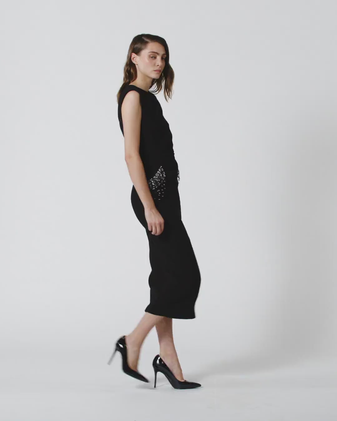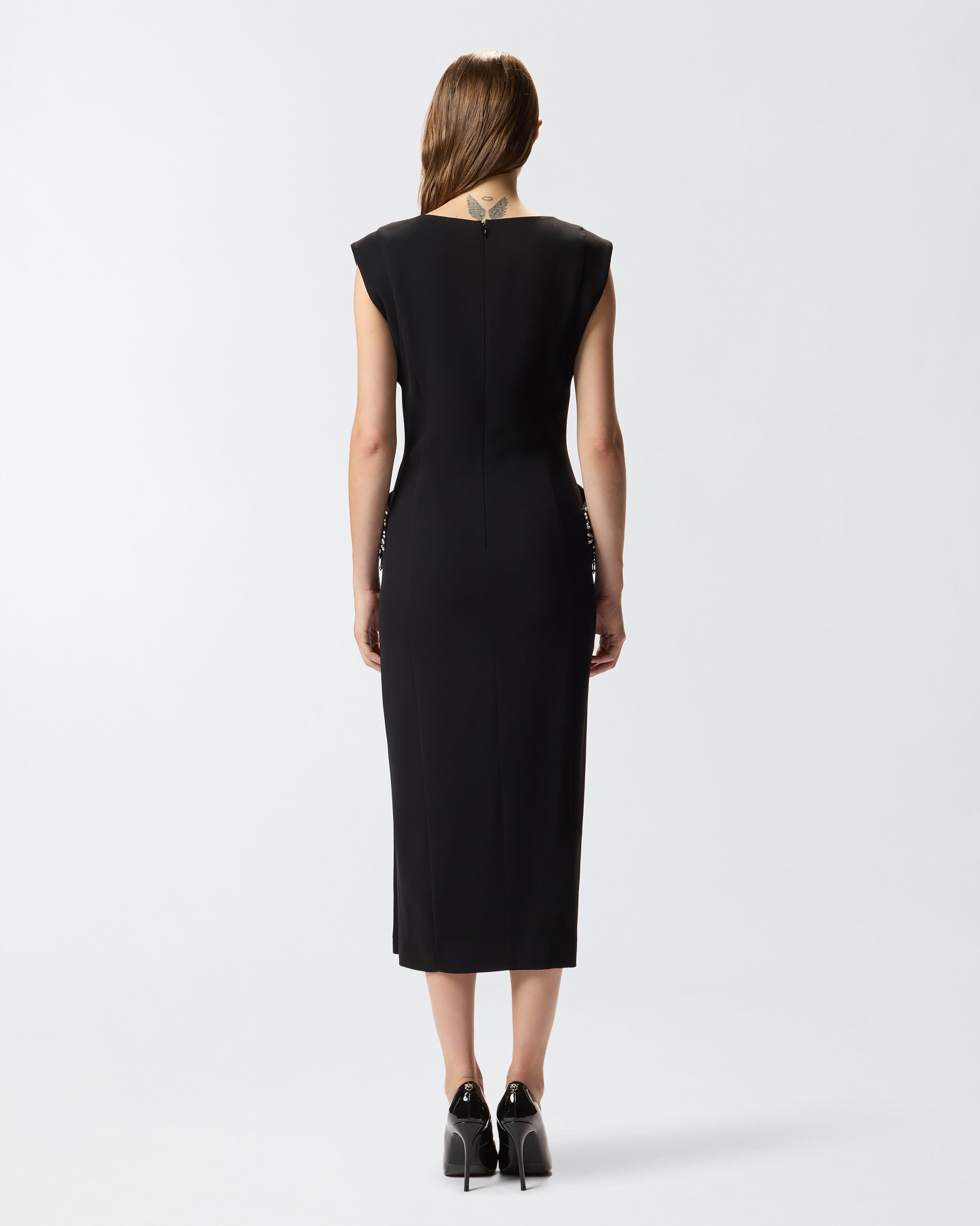 Sleeveless fitted midi dress with a slightly boat neckline, made of stretch viscose fabric, which translates into an optimal fit. The material is designed to adhere perfectly to the lines of the body, enhancing the silhouette in a natural and defined way. The micro crystal embroidery on the sides creates a contrast of lights that enhances the texture of the fabric and gives movement to the look, without losing a structured and feminine final effect. Invisible zip closure on the back.