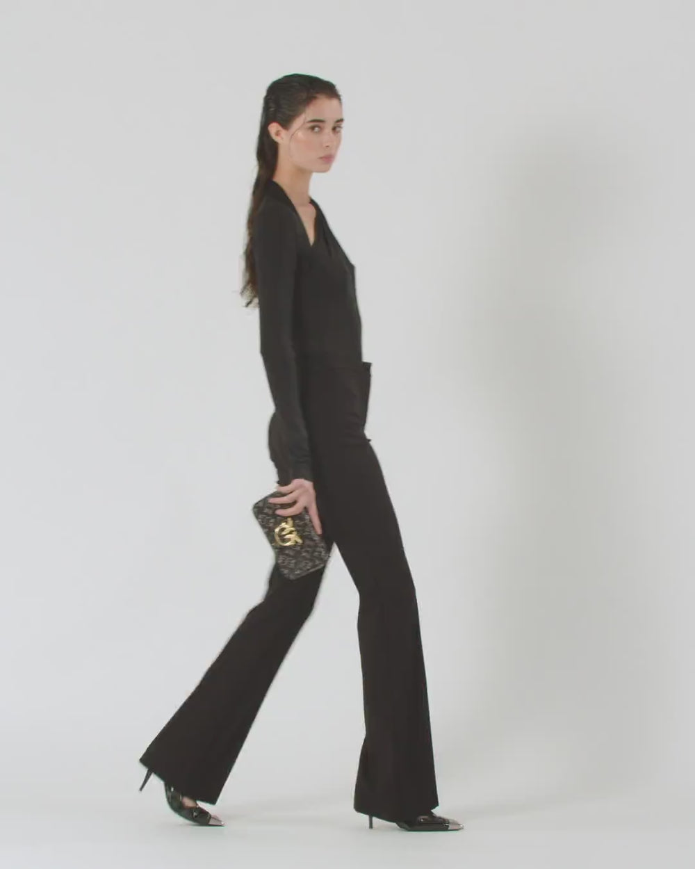 Flared trousers in stretch viscose full Milano knit, a knit fabric with a woolly look that is very comfortable and high-performance, ensuring a compact hand. This piece features a slim-fit leg down to the knee, which flares towards the hem, forming the classic, iconic 70s-inspired bell-bottom shape. Fastened with zip and small hook. Elegant and versatile at the same time, this pair is perfect for any occasion, thanks to the texture and unique fit.