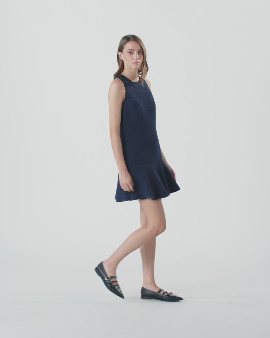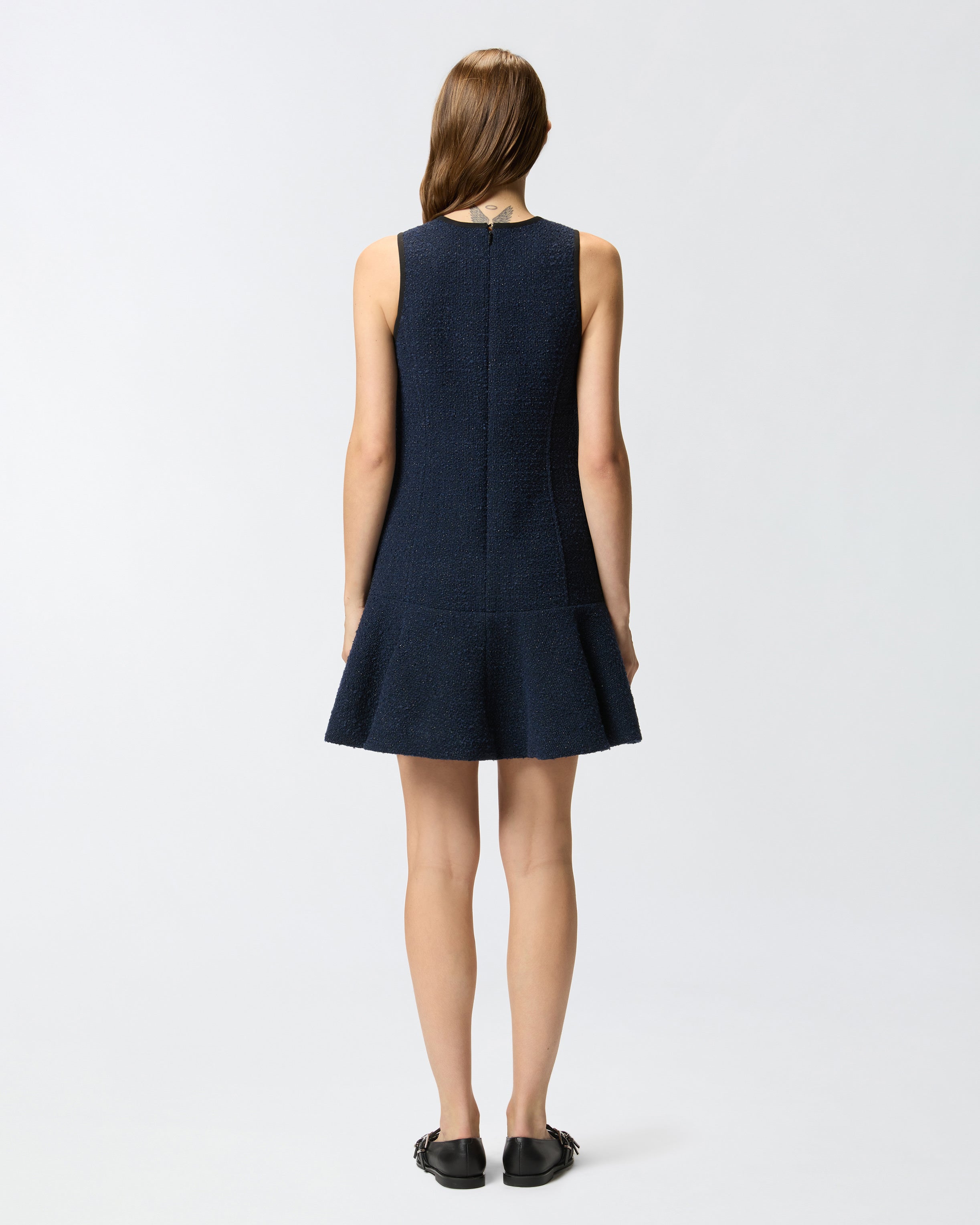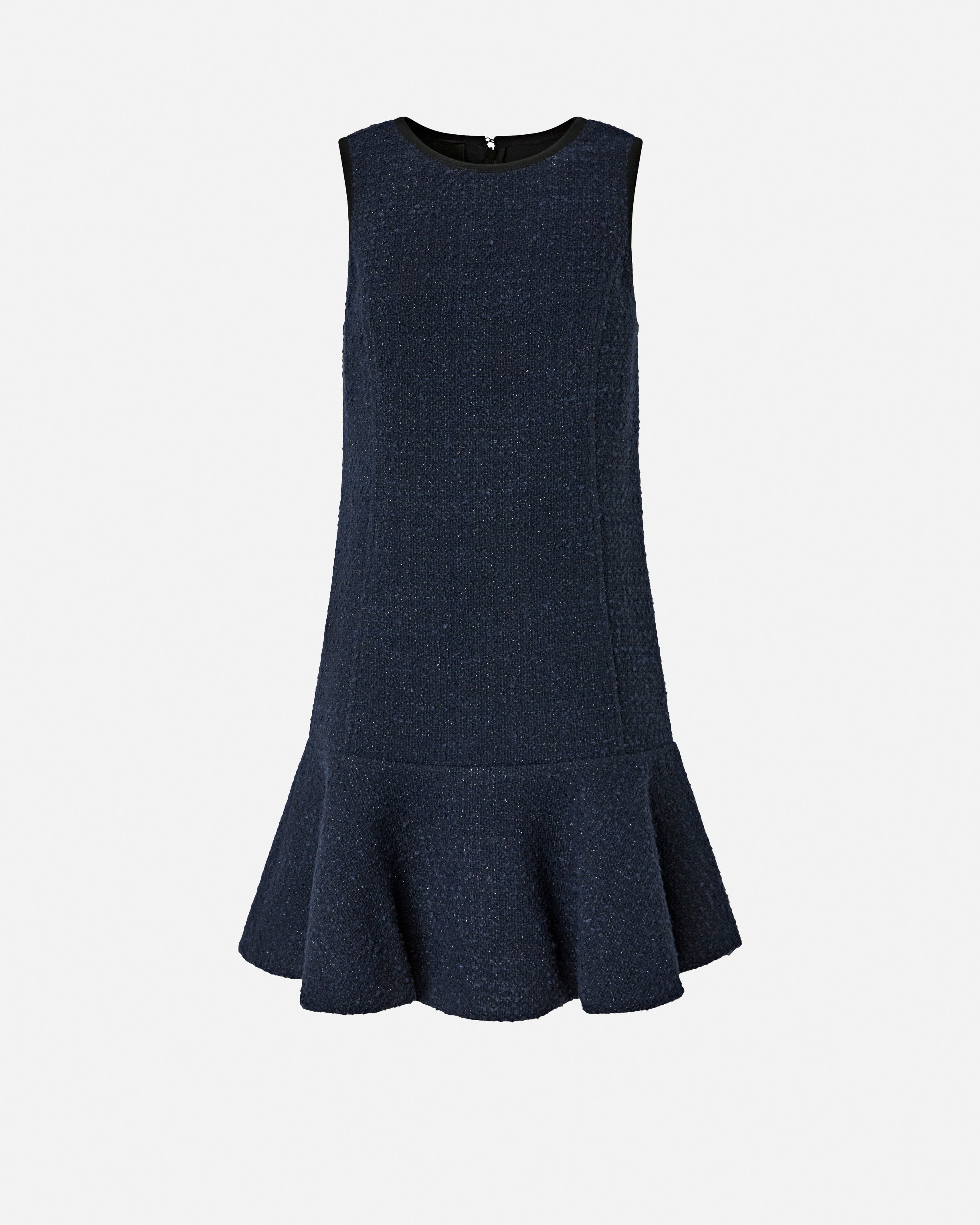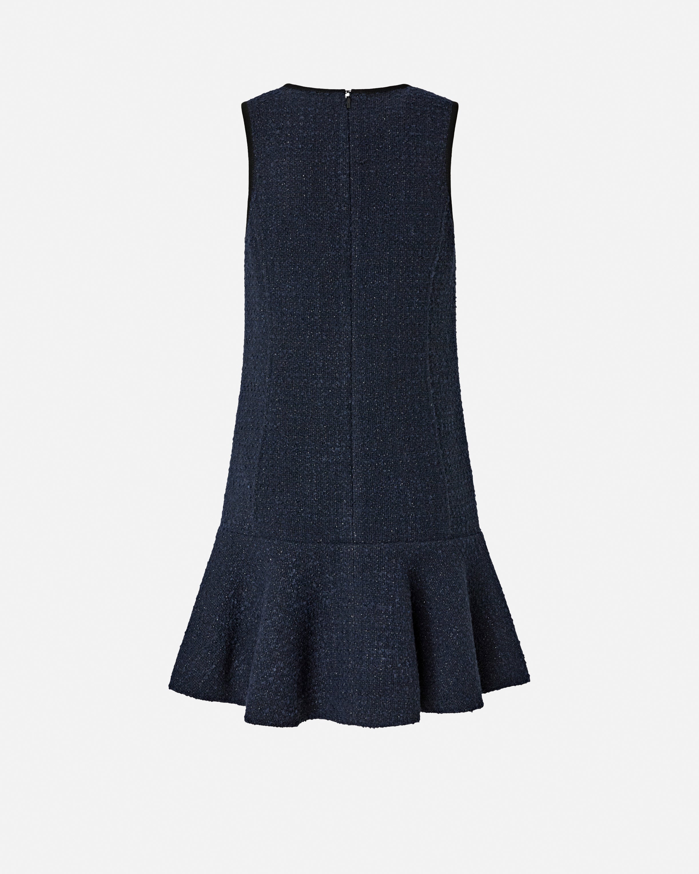 Sleeveless tweed fabric dress obtained from a bouclé yarn and metallic thread, and paired with extremely light georgette for a soft and enveloping fit. This sleeveless crew-neck style features a fitted construction for a cinched-waist silhouette, while the ruffled hem completes the flared design at knee height. Invisible zip fastening on the back. Whether it's a cocktail party or formal event, wear this sleeveless dress with a pair of pumps to be the perfect guest.