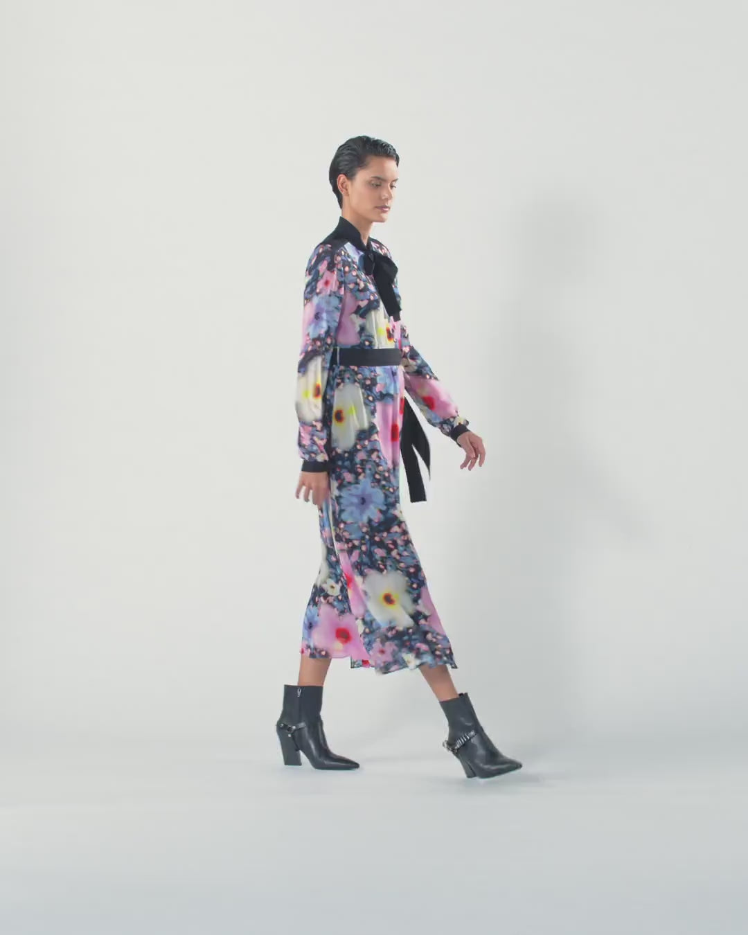 Long shirt dress in viscose georgette fabric, with floral print all over. The multi-coloured print, made with a digital technique, gives the dress a feminine look, while the solid-colour details on the collar, yoke, cuffs and belt create attractive contrast. This fitted style is more cinched on the sides. The neck fastens at the front in a bow, as does the removable belt. Fastened with visible buttons on the front. Lined model.