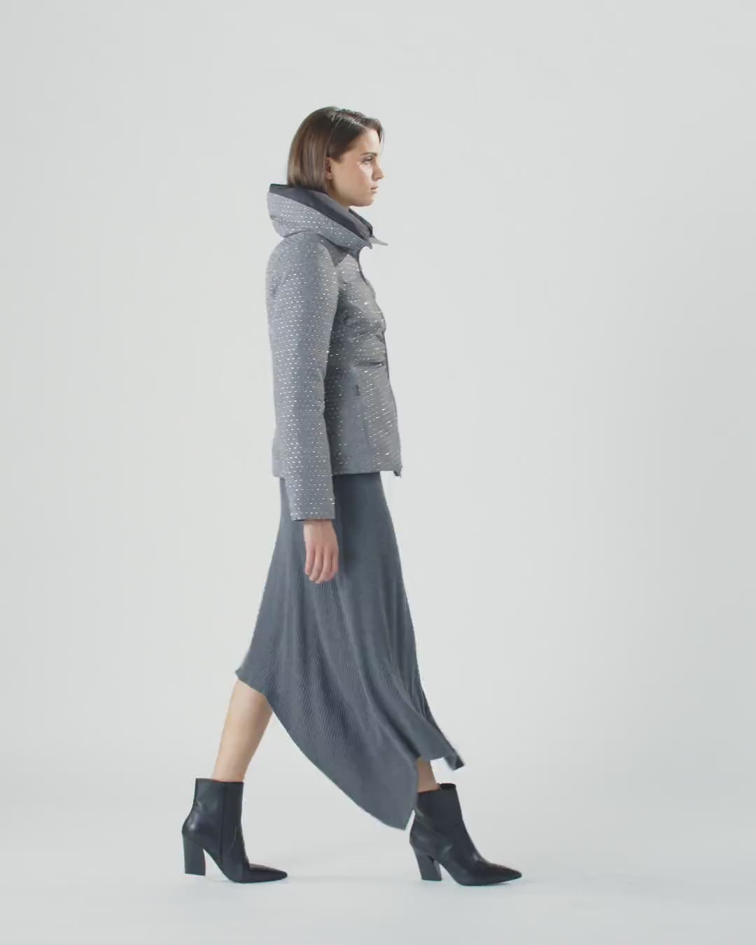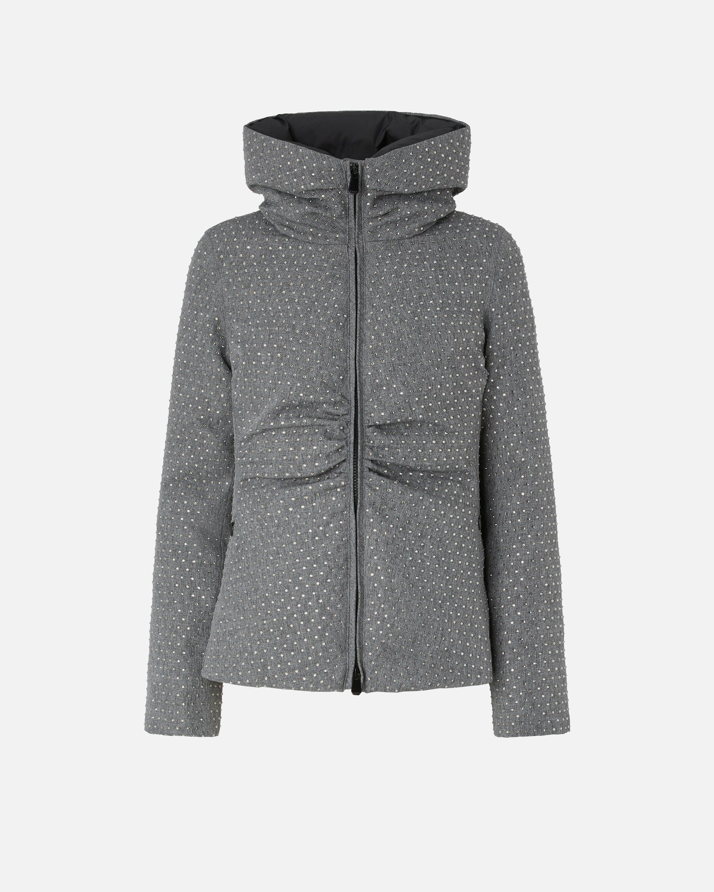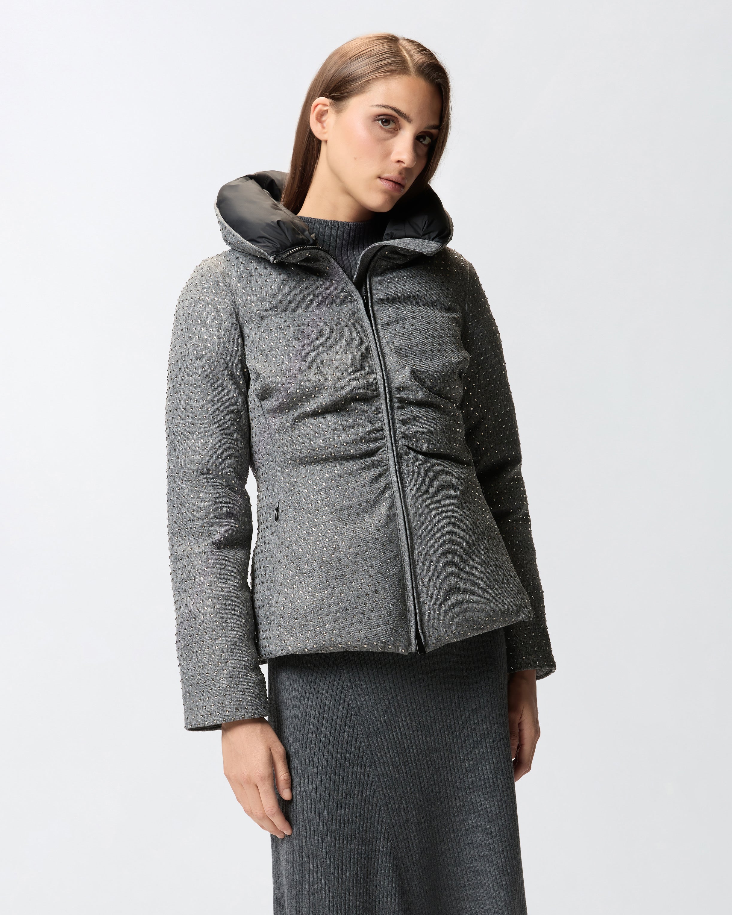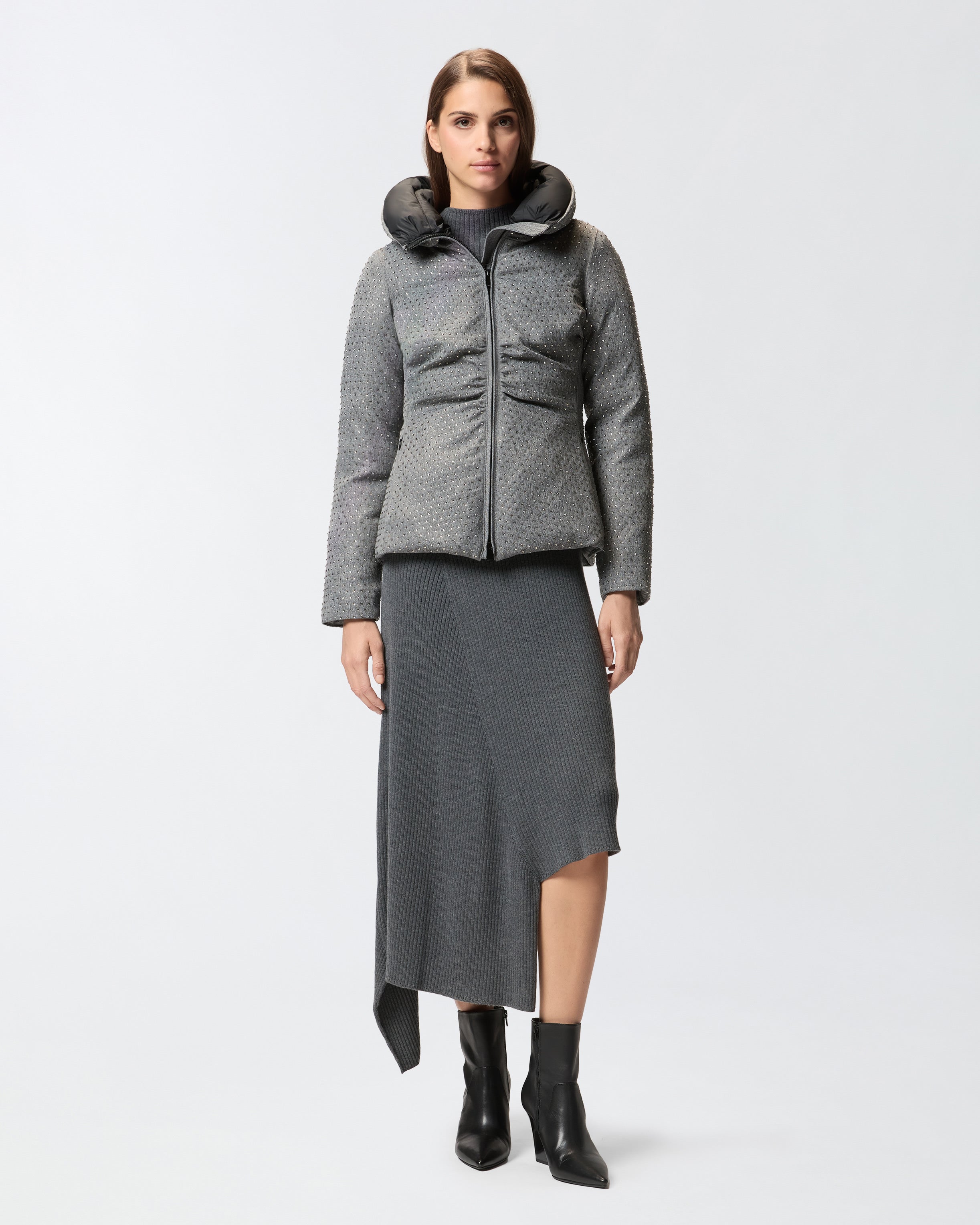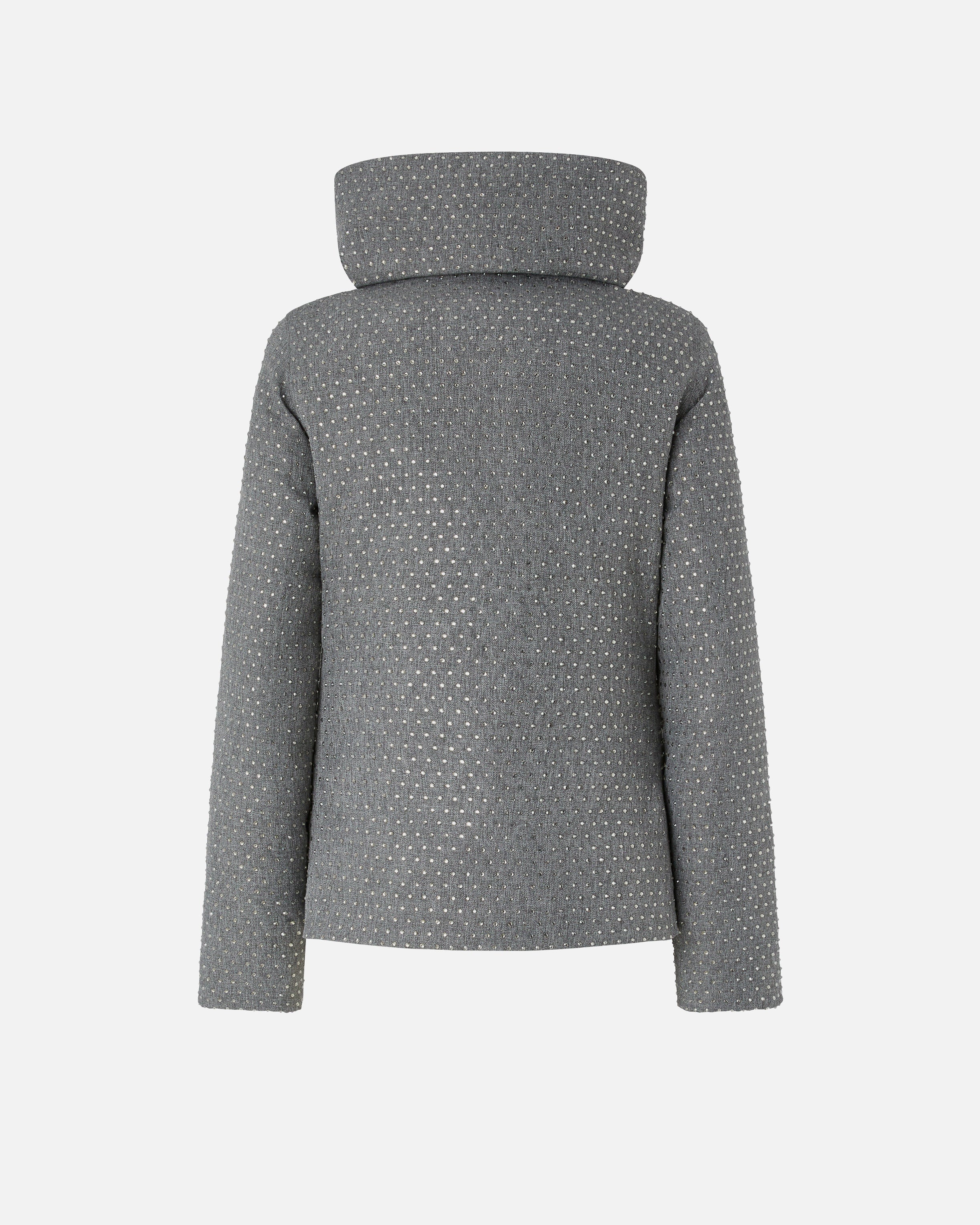 Short down jacket with enveloping high neck, side pockets and full-length two-way zip fastening. Here, a practical design meets an exquisite, feminine aesthetic provided by gathering and a distinctive, PINKO-signature mini-rhinestone motif all over. The perfect piece to face the first cold spells with a touch of style that has not sacrificed comfort.