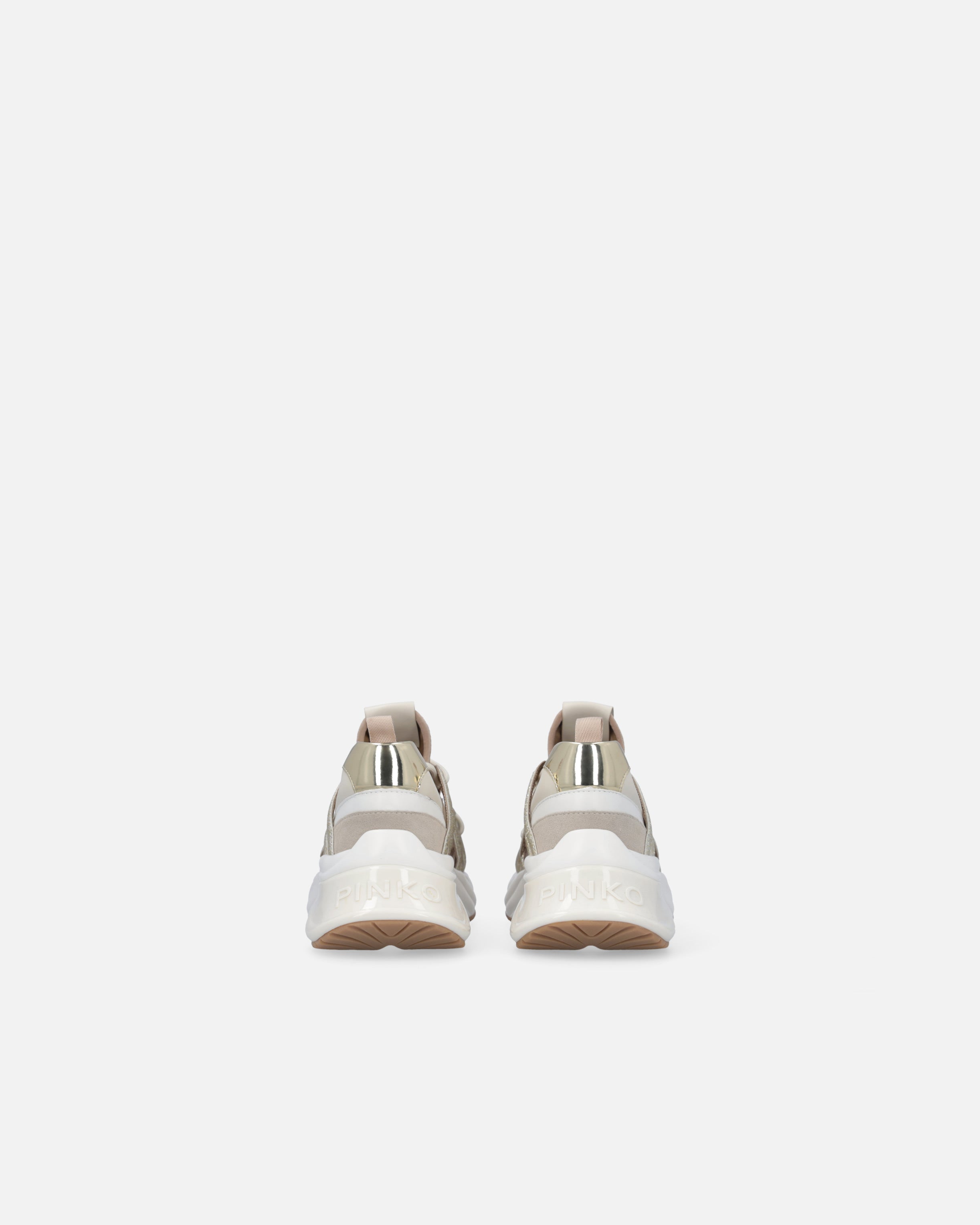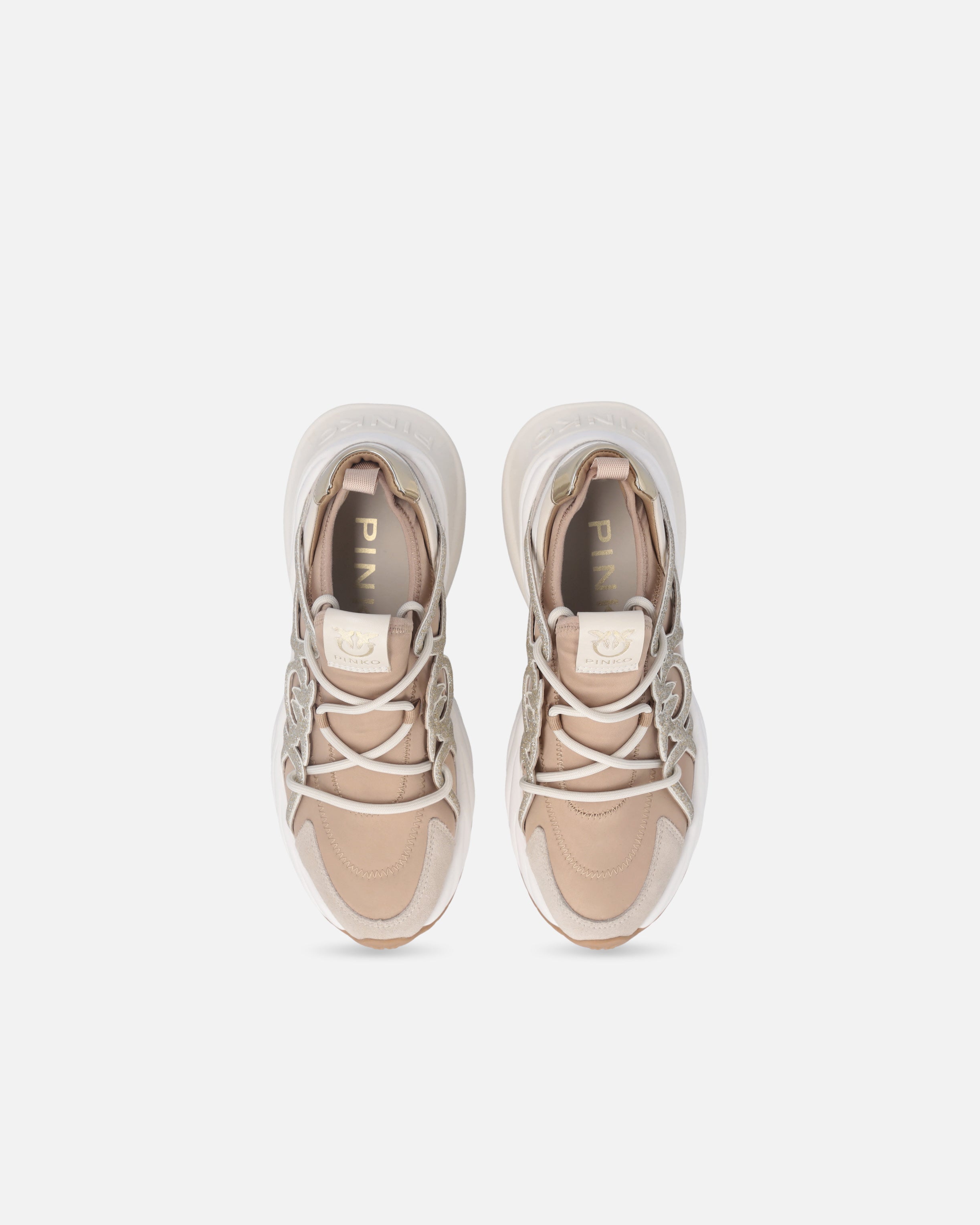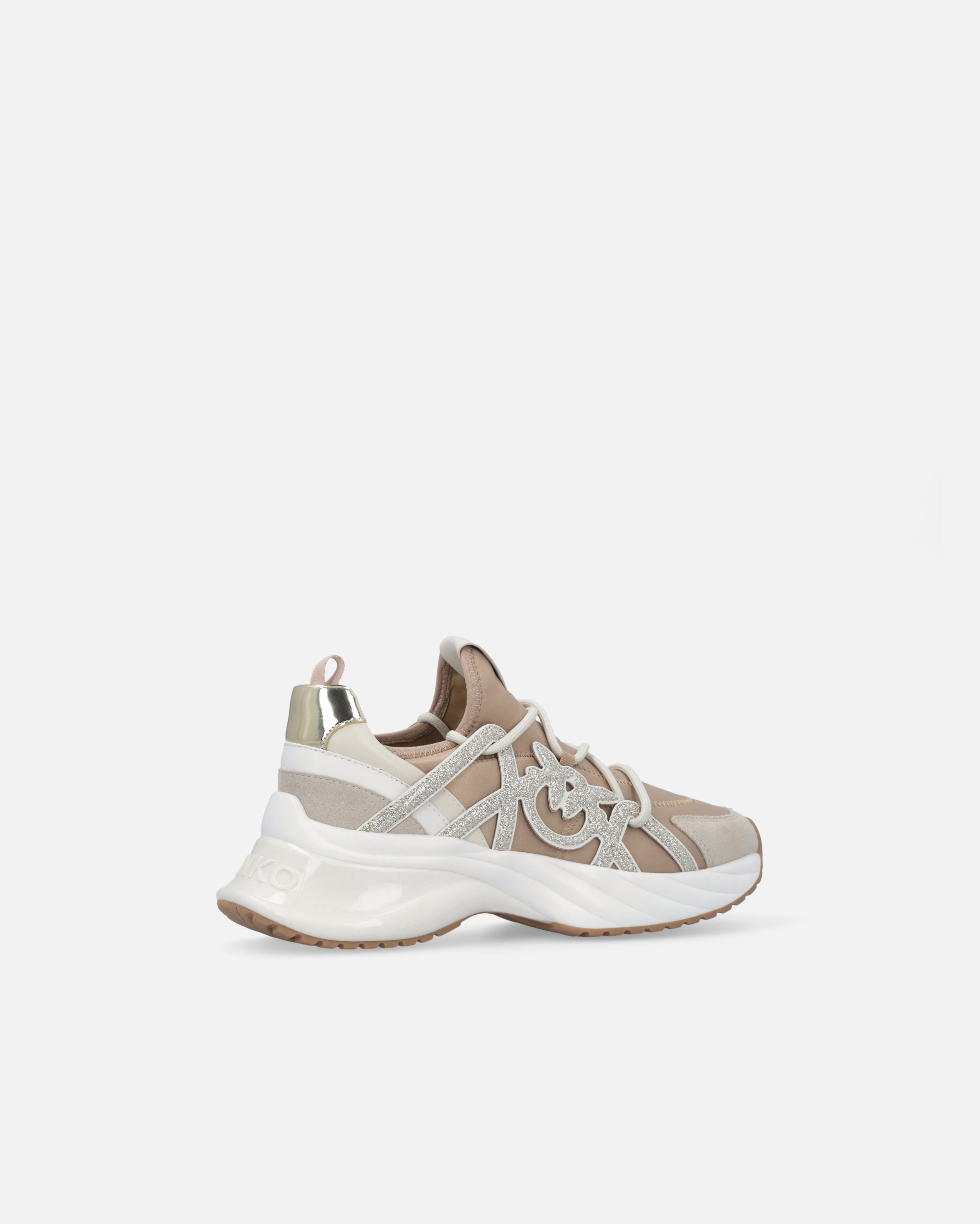 Sporty shoe with laces, pull tab, 7 cm-high sole, leather-effect upper with satin and suede details and glossy insert at the heel. The upper also features a cage-effect side insert with glittery finish, enhanced by underlying edges that emphasise the design, giving the shoe a refined, modern look. The Love Birds logo is incorporated into the glittery design feature and also appears on the tongue. These sneakers are destined to become a go-to pair for your casual looks and beyond, don't you think?
