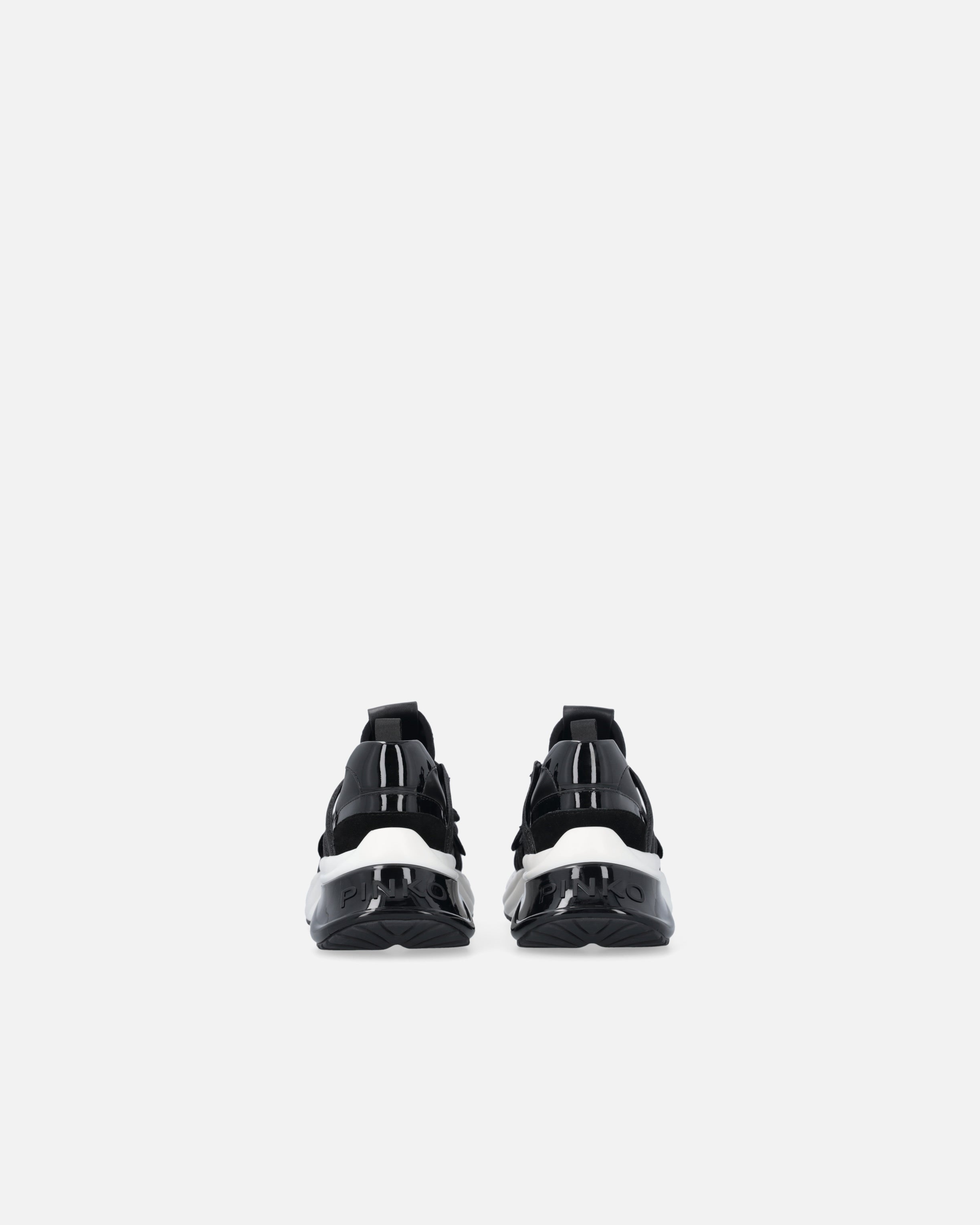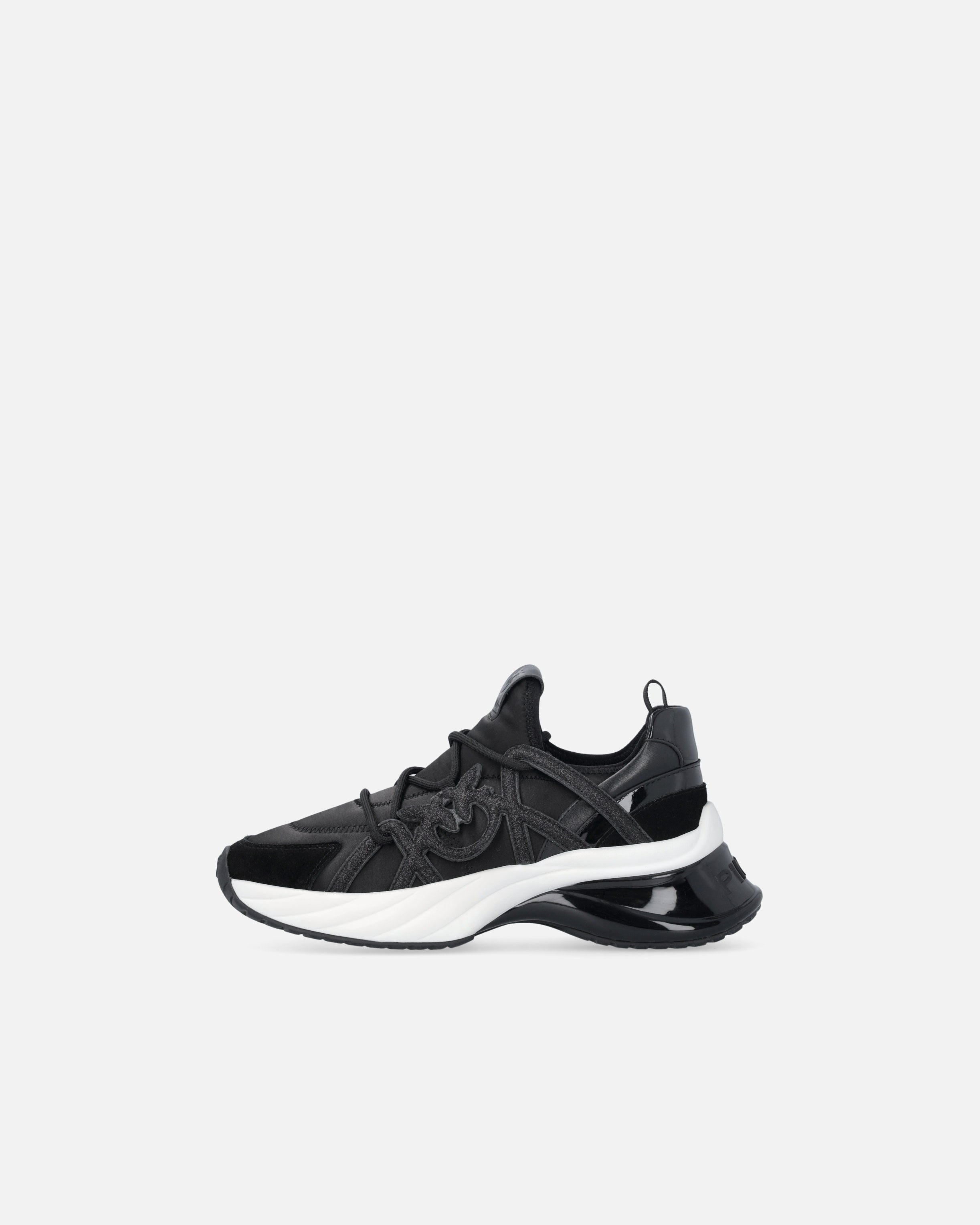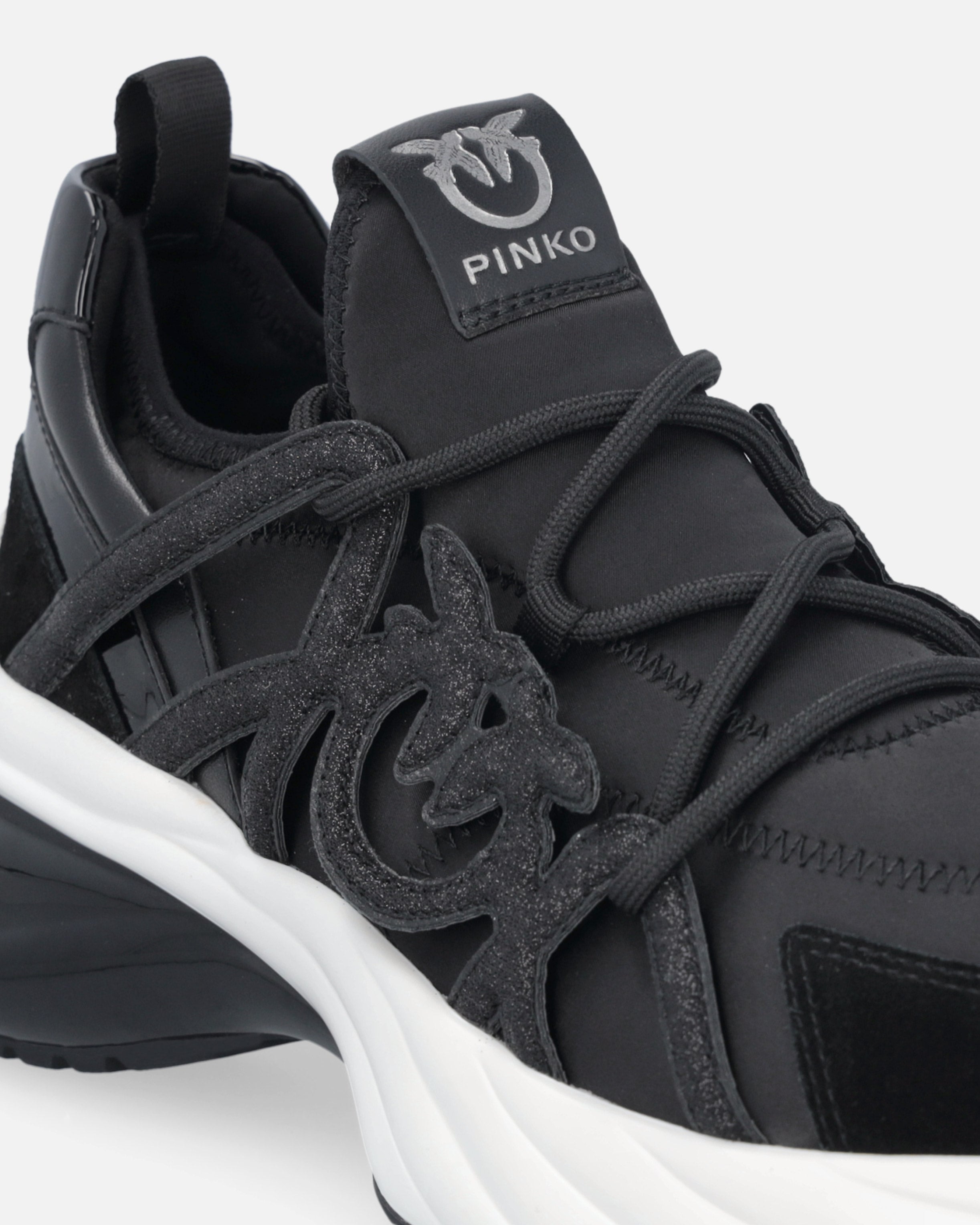 Sporty shoe with laces, pull tab, 7 cm-high sole, leather-effect upper with satin and suede details and glossy insert at the heel. The upper also features a cage-effect side insert with glittery finish, enhanced by underlying edges that emphasise the design, giving the shoe a refined, modern look. The Love Birds logo is incorporated into the glittery design feature and also appears on the tongue. These sneakers are destined to become a go-to pair for your casual looks and beyond, don't you think?
