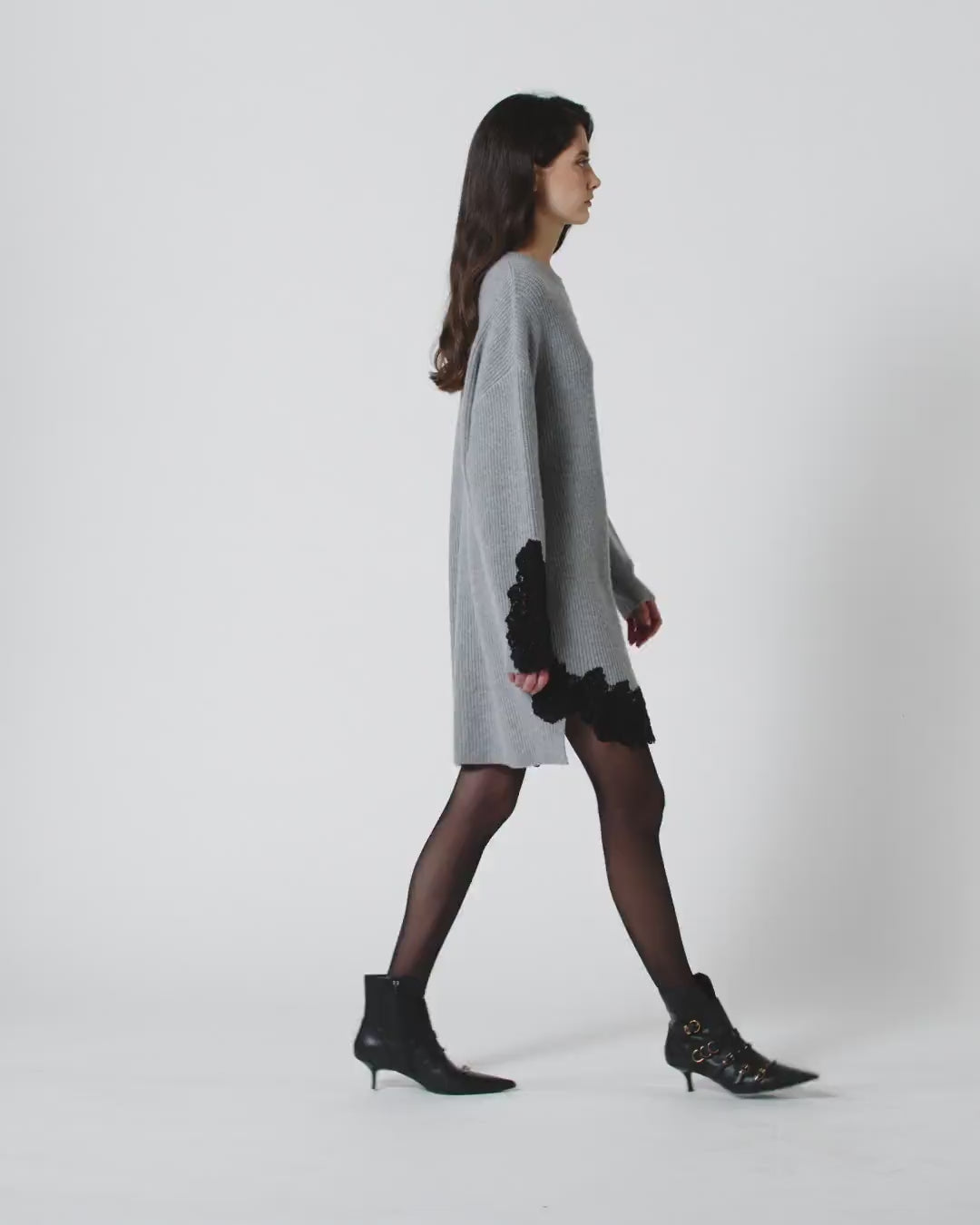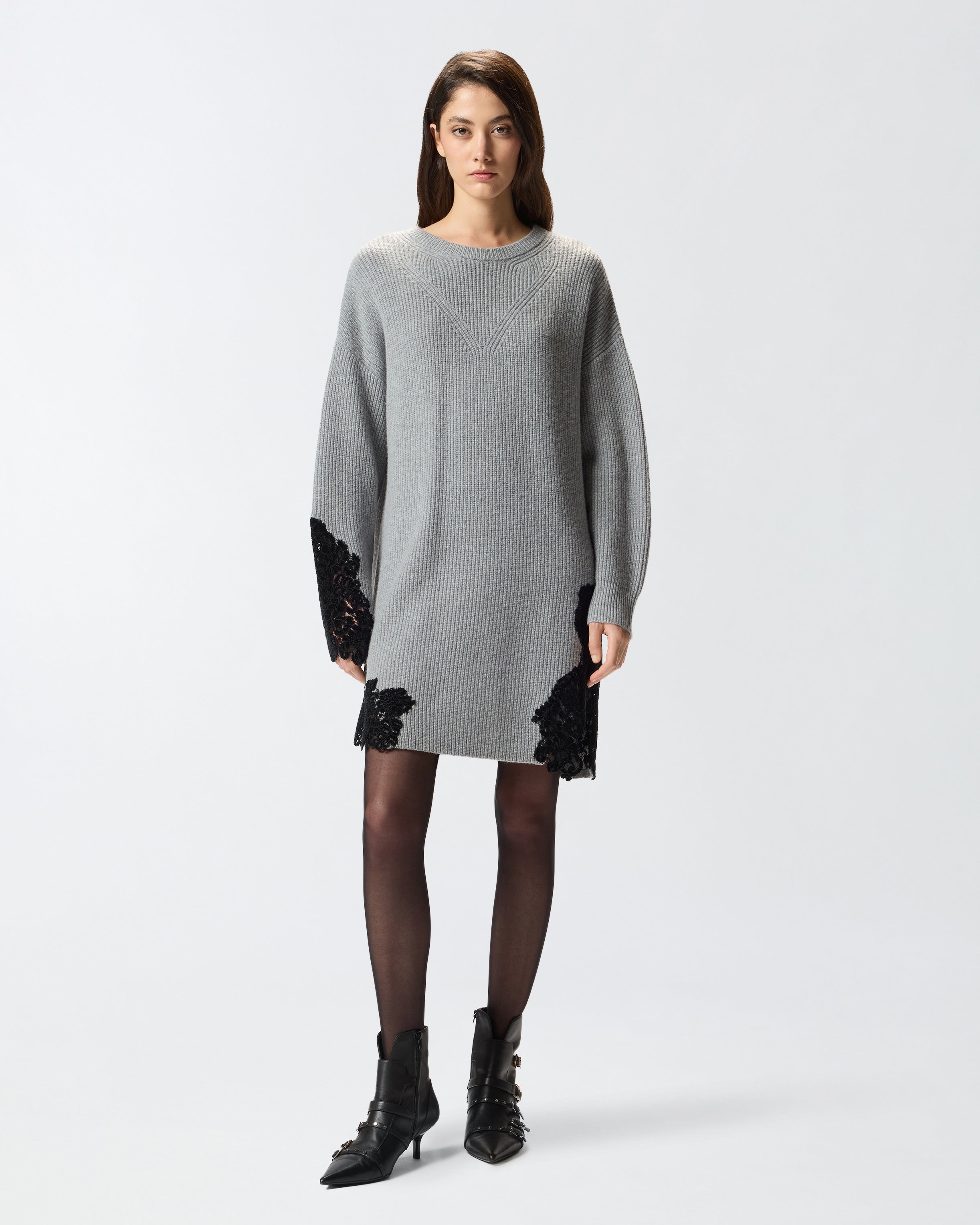 Short dress in rib-knit wool-blend fabric: a yarn that offers a perfect balance between comfort and softness. The detail that embellishes the design is the hand-worked flocked lace inlay on one sleeve and on the hem. The piece has undergone finishing tests to minimise the possible formation of pilling, ensuring greater fabric softness and durability. The final touch is given by the tone-on-tone label with PINKO lettering logo behind the neck. Add this design to your wardrobe to give your winter outfits a twist.
