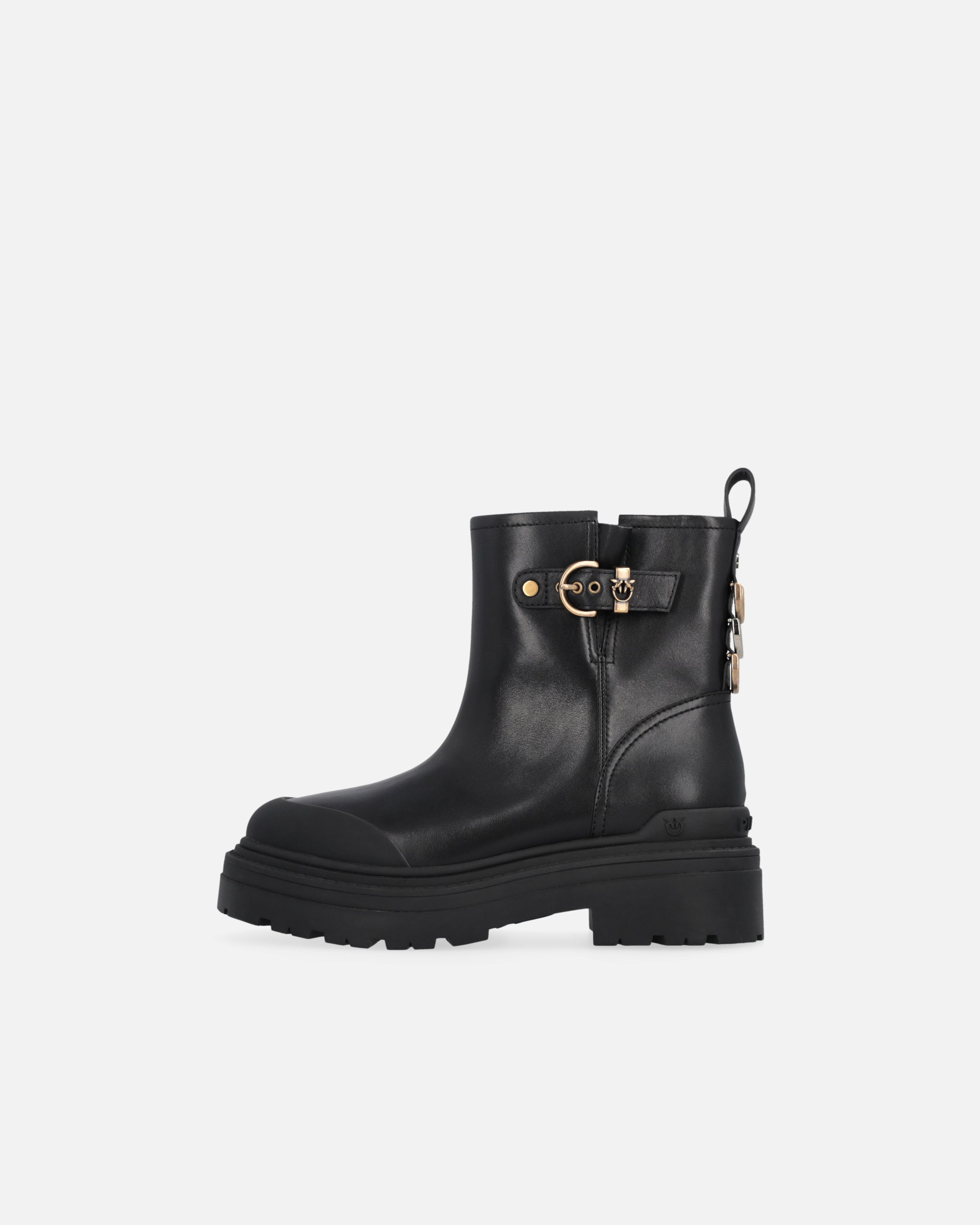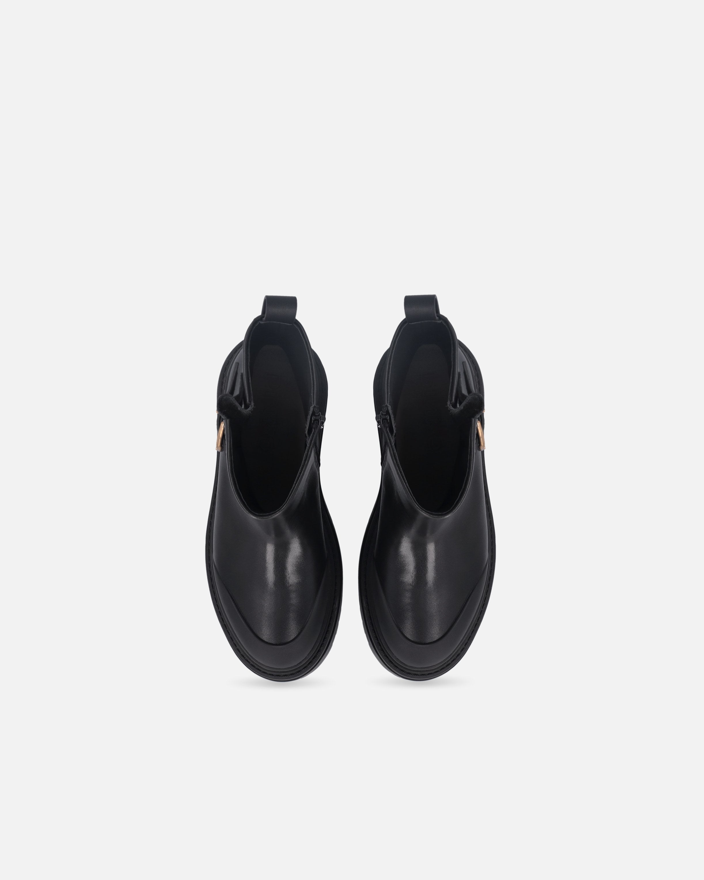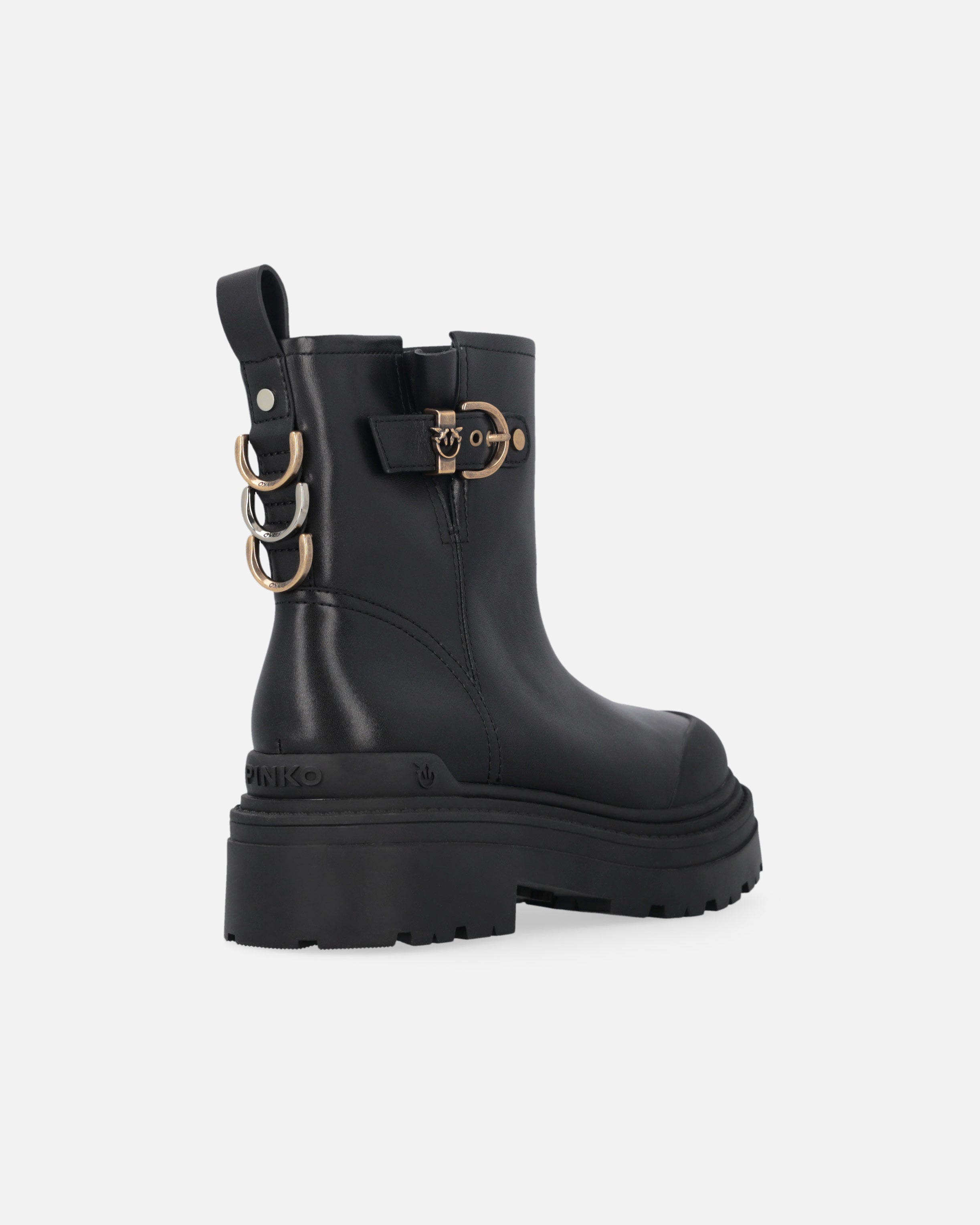 Smooth leather booties with 17 cm-high leg shaft and 5.5 cm platform sole. These shoes feature a side gusset to help put them on, which is fastened with an adjustable strap with buckle and metal loop bearing the Love Birds logo. This bold yet understated ankle boot is enhanced by gold- and silver-coloured metal elements on the back that enhance the style, making it the perfect shoe for those after the right balance between edgy and elegant. We all know that details are what make the difference: choose this pair to give your casual looks a unique touch.