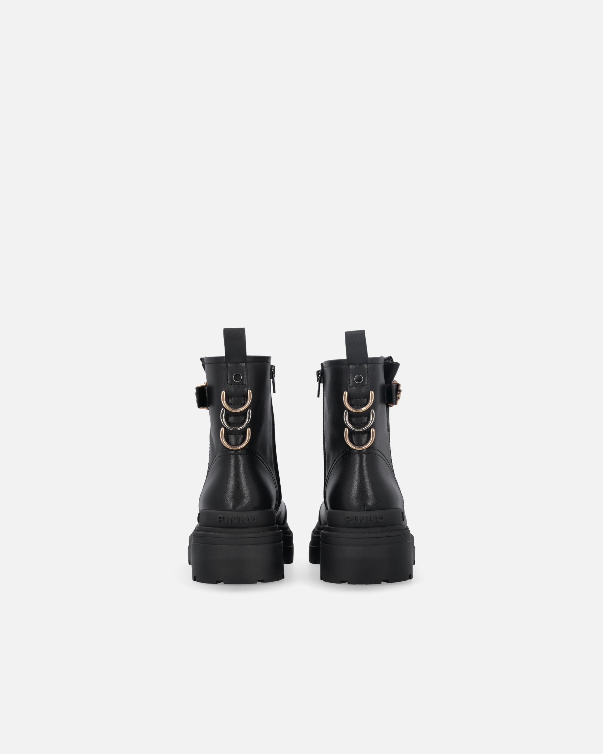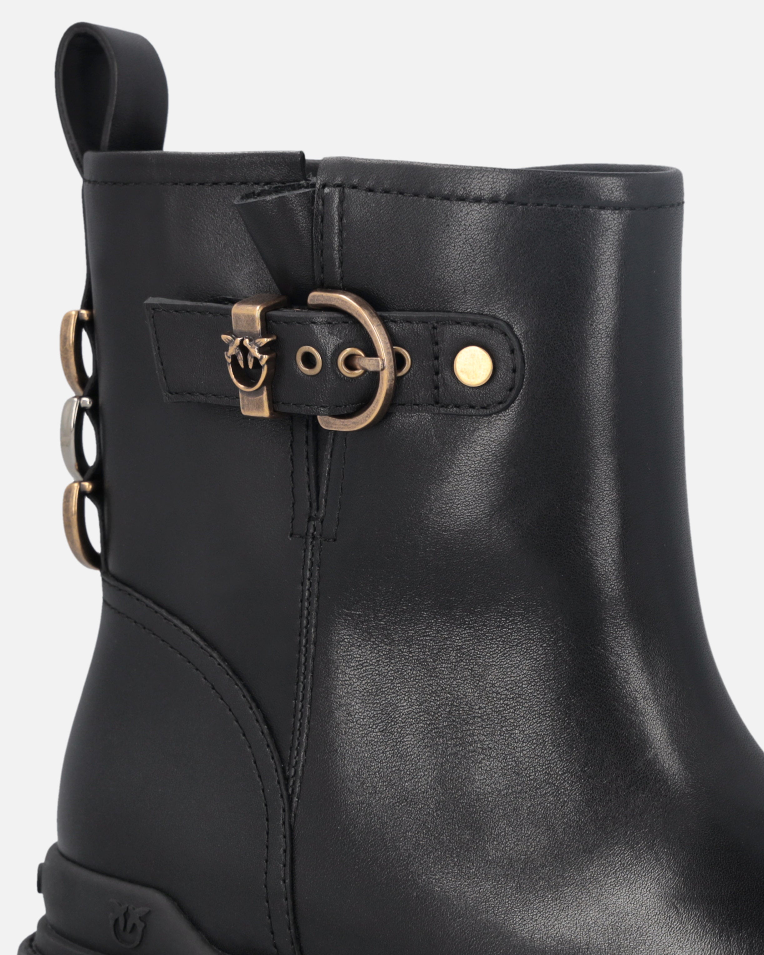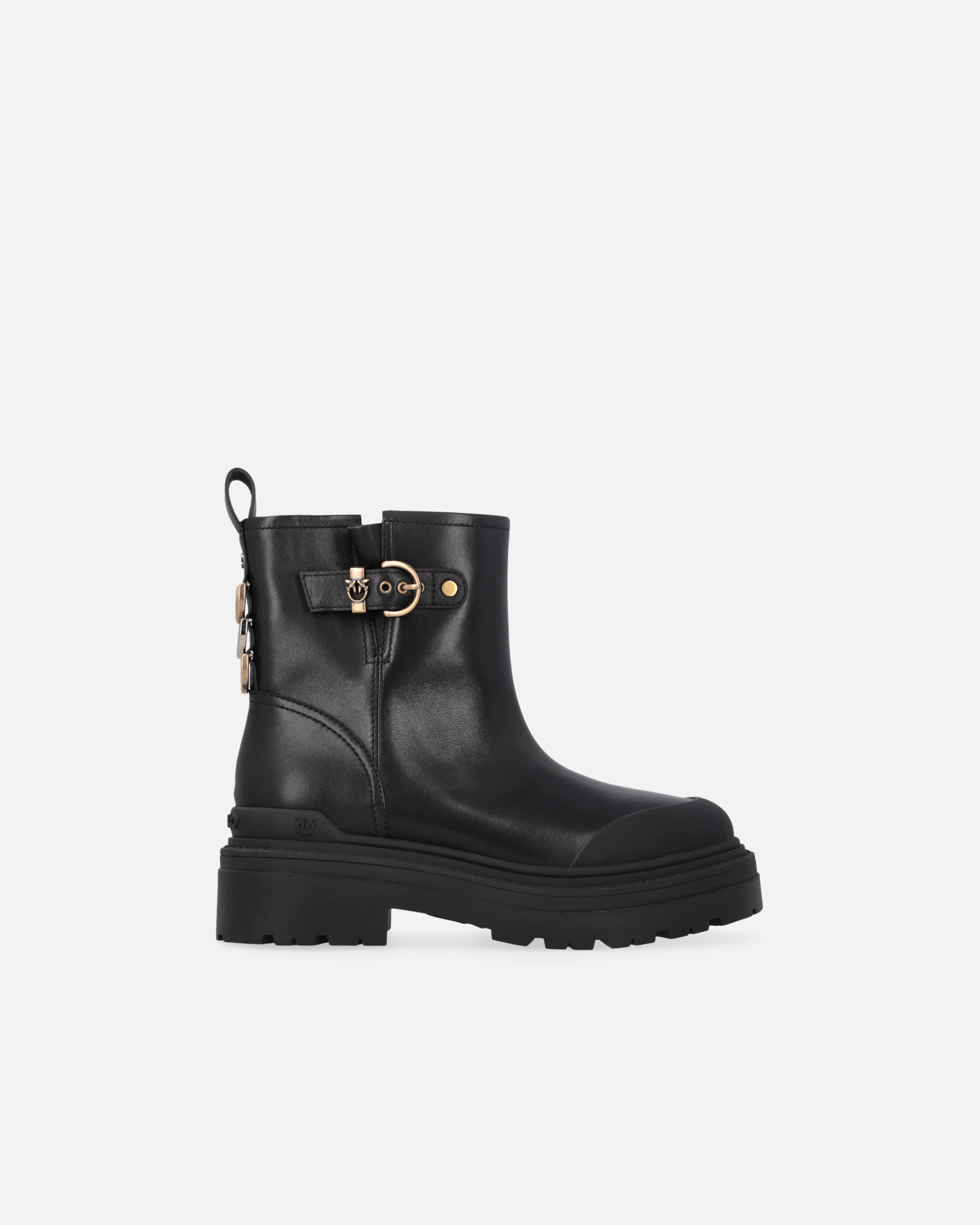 Smooth leather booties with 17 cm-high leg shaft and 5.5 cm platform sole. These shoes feature a side gusset to help put them on, which is fastened with an adjustable strap with buckle and metal loop bearing the Love Birds logo. This bold yet understated ankle boot is enhanced by gold- and silver-coloured metal elements on the back that enhance the style, making it the perfect shoe for those after the right balance between edgy and elegant. We all know that details are what make the difference: choose this pair to give your casual looks a unique touch.