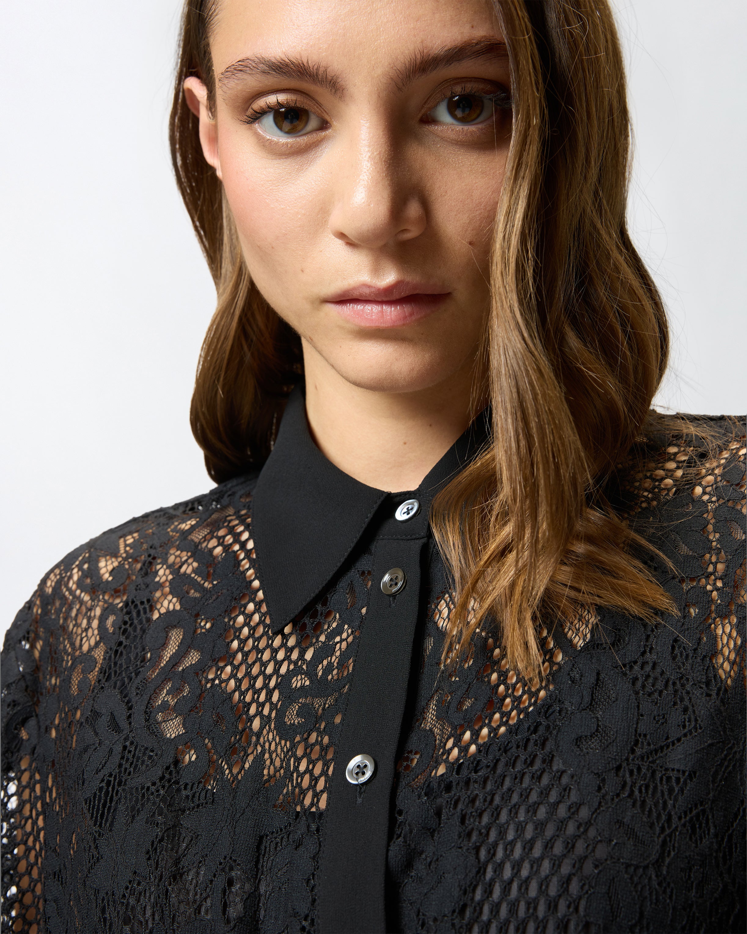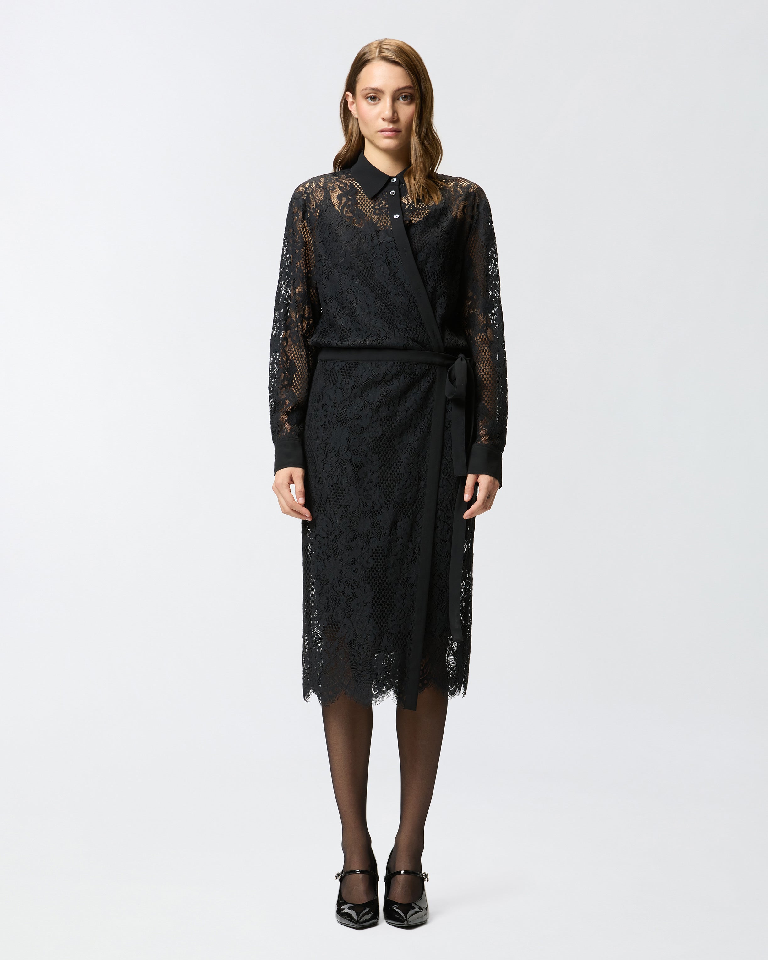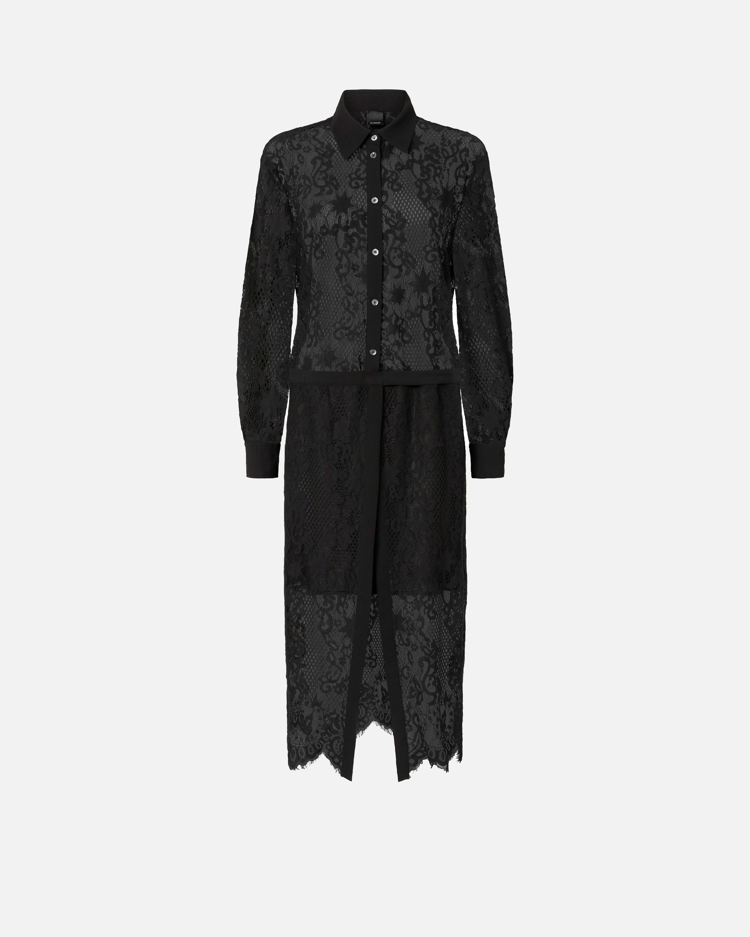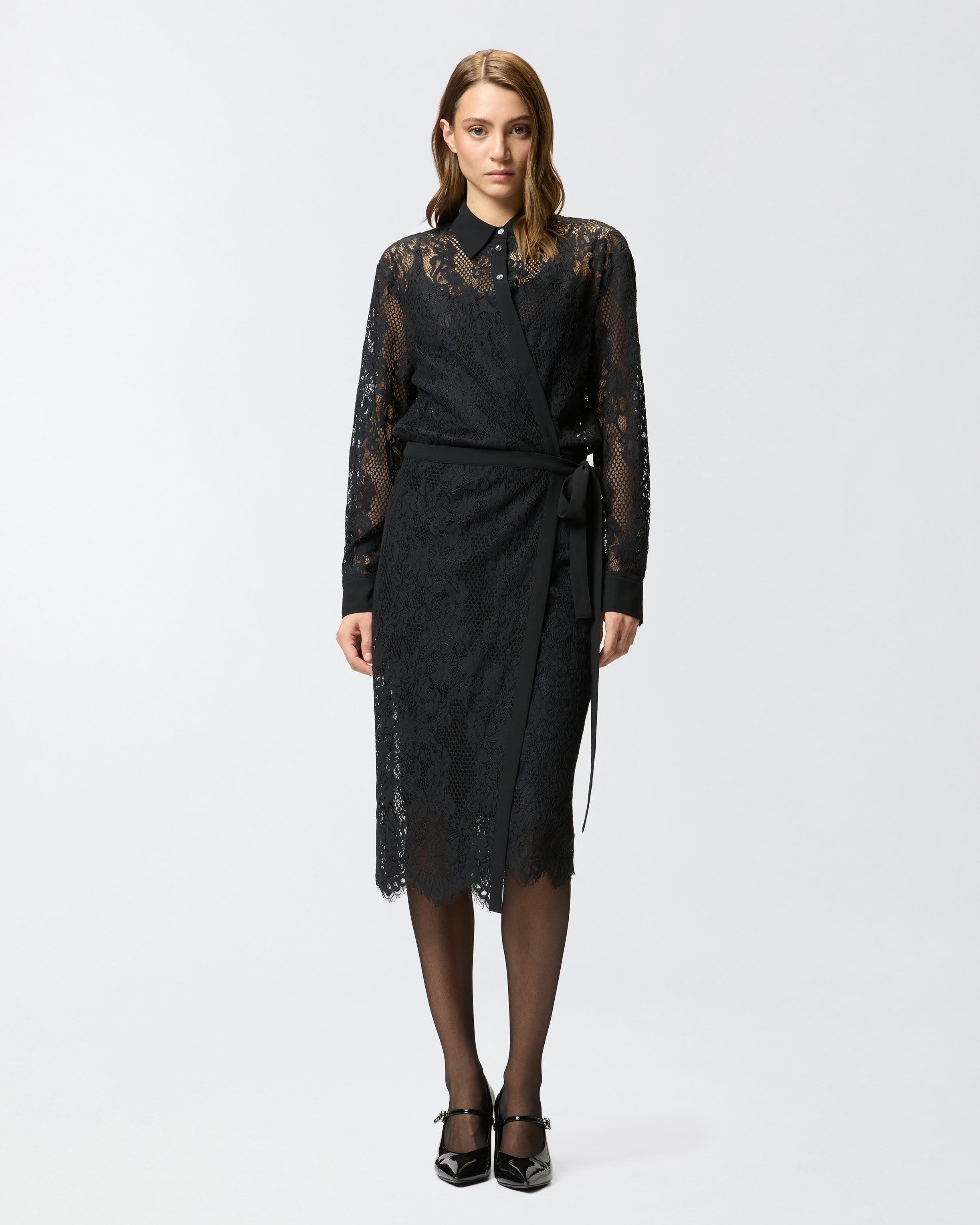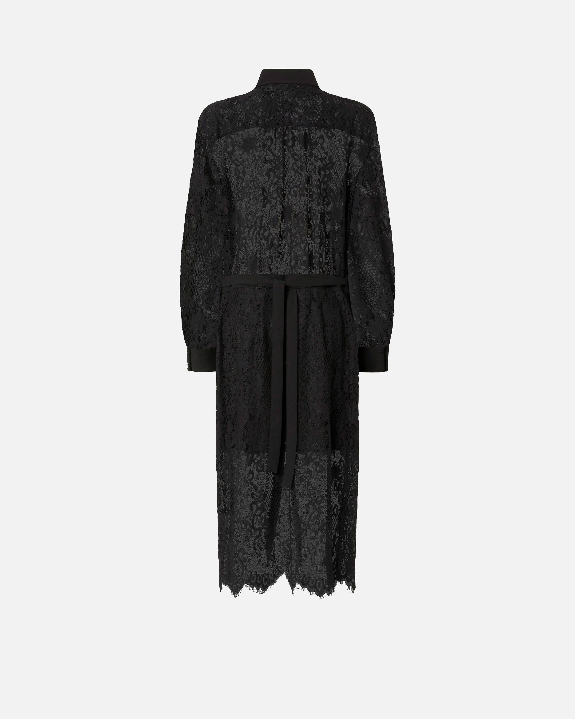 Long shirt dress with fitted waist, shirt collar and long balloon sleeves with buttons at the end. Finished with plain-coloured fabric edging, this piece is made from refined rebrodé lace that allows you to experiment with sheer effects and delicately drops with fringing at the bottom. The dress is complete with a small matching-fabric belt to tie at the waist, allowing you to personalise the fit and style.