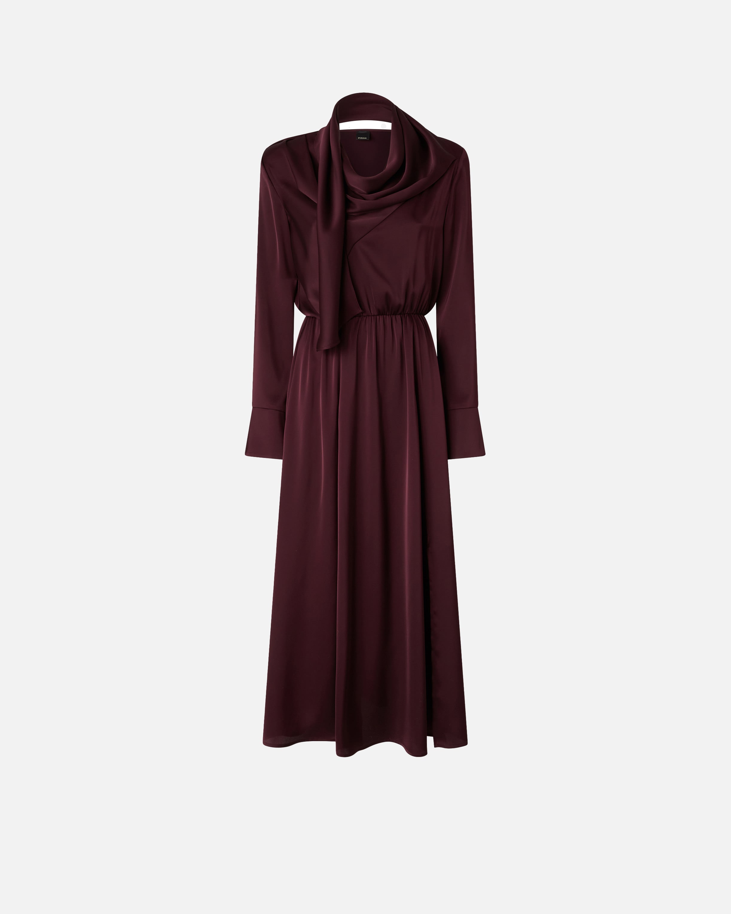 Relaxed-fit dress in satin crepe fabric with elasticated waist and side slit. This garment features long sleeves with flared cuff, a wide skirt and a neck sash that you can wear in different ways for an original, personal look with that pure PINKO style. Choose this piece for a fluid, slinky effect that brings out the female figure in an elegant, refined way.