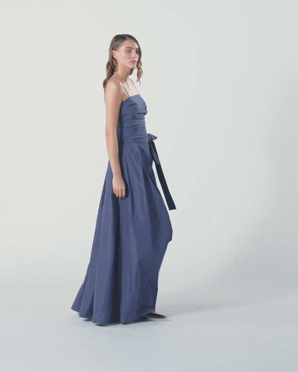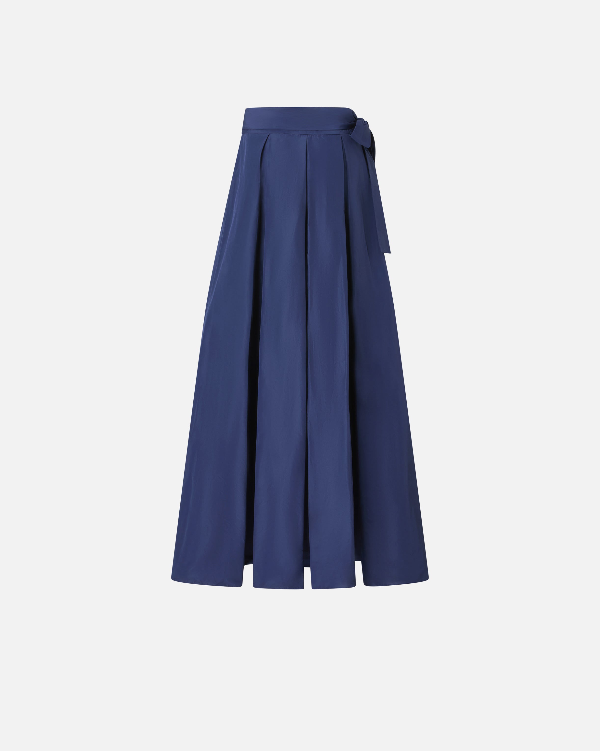 Long, full taffeta skirt with a belt that ties on the high waist. The material is light and shiny and blends perfectly with the dynamic volume that distinguishes the garment. Wear this style for a fluid, slinky effect that elegantly enhances the lines with sophistication and the feminine silhouette, making it particularly elegant for ceremonies and special occasions.