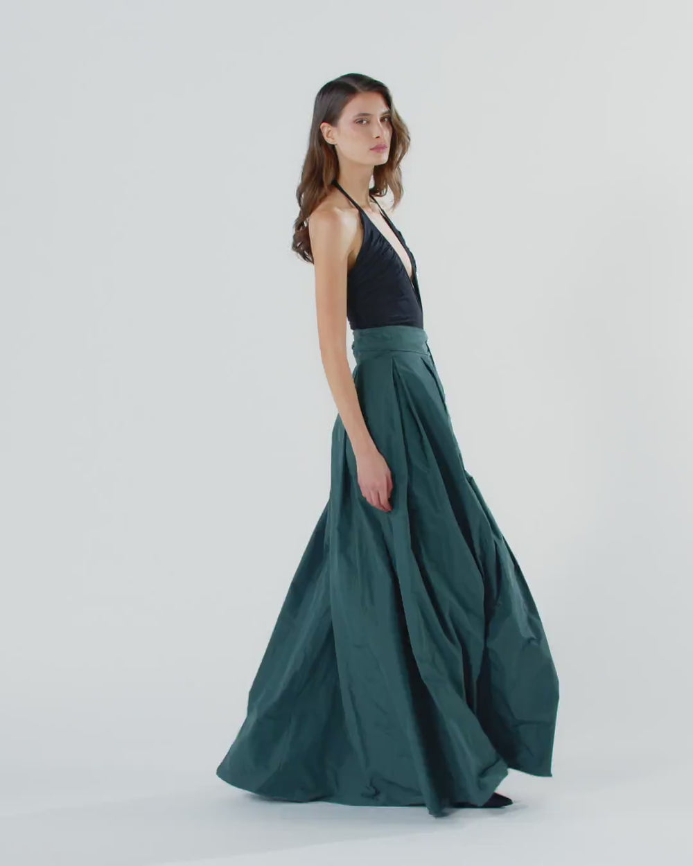 Long, full taffeta skirt with a belt that ties on the high waist. The material is light and shiny and blends perfectly with the dynamic volume that distinguishes the garment. Wear this style for a fluid, slinky effect that elegantly enhances the lines with sophistication and the feminine silhouette, making it particularly elegant for ceremonies and special occasions.