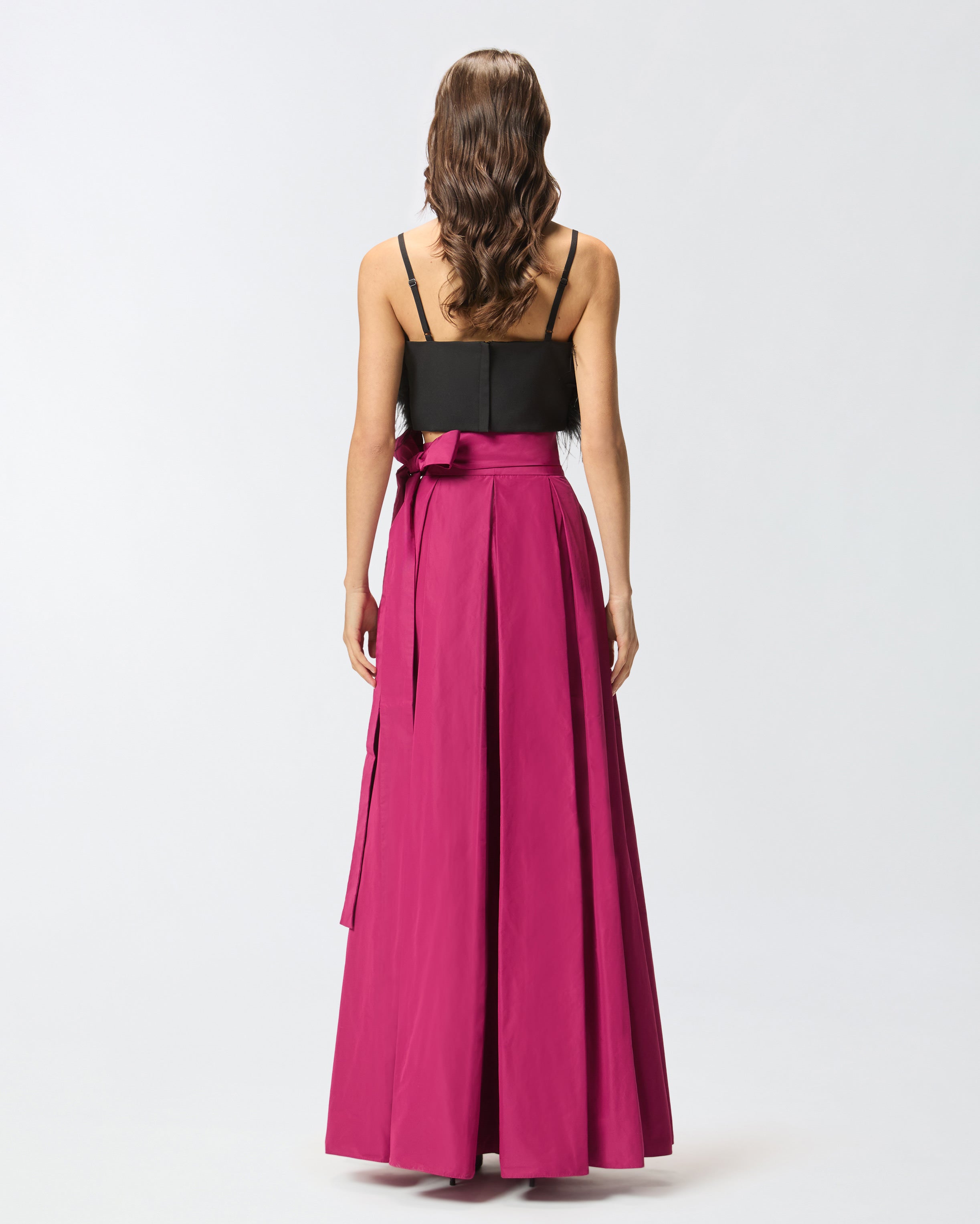 Long, full taffeta skirt with a belt that ties on the high waist. The material is light and shiny and blends perfectly with the dynamic volume that distinguishes the garment. Wear this style for a fluid, slinky effect that elegantly enhances the lines with sophistication and the feminine silhouette, making it particularly elegant for ceremonies and special occasions.