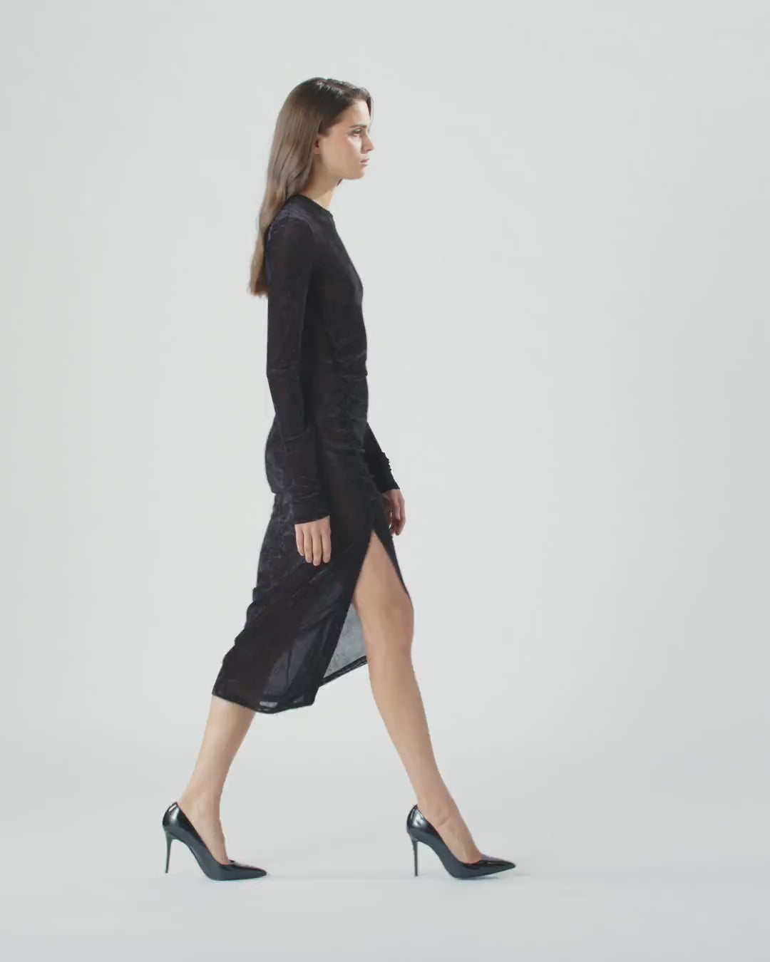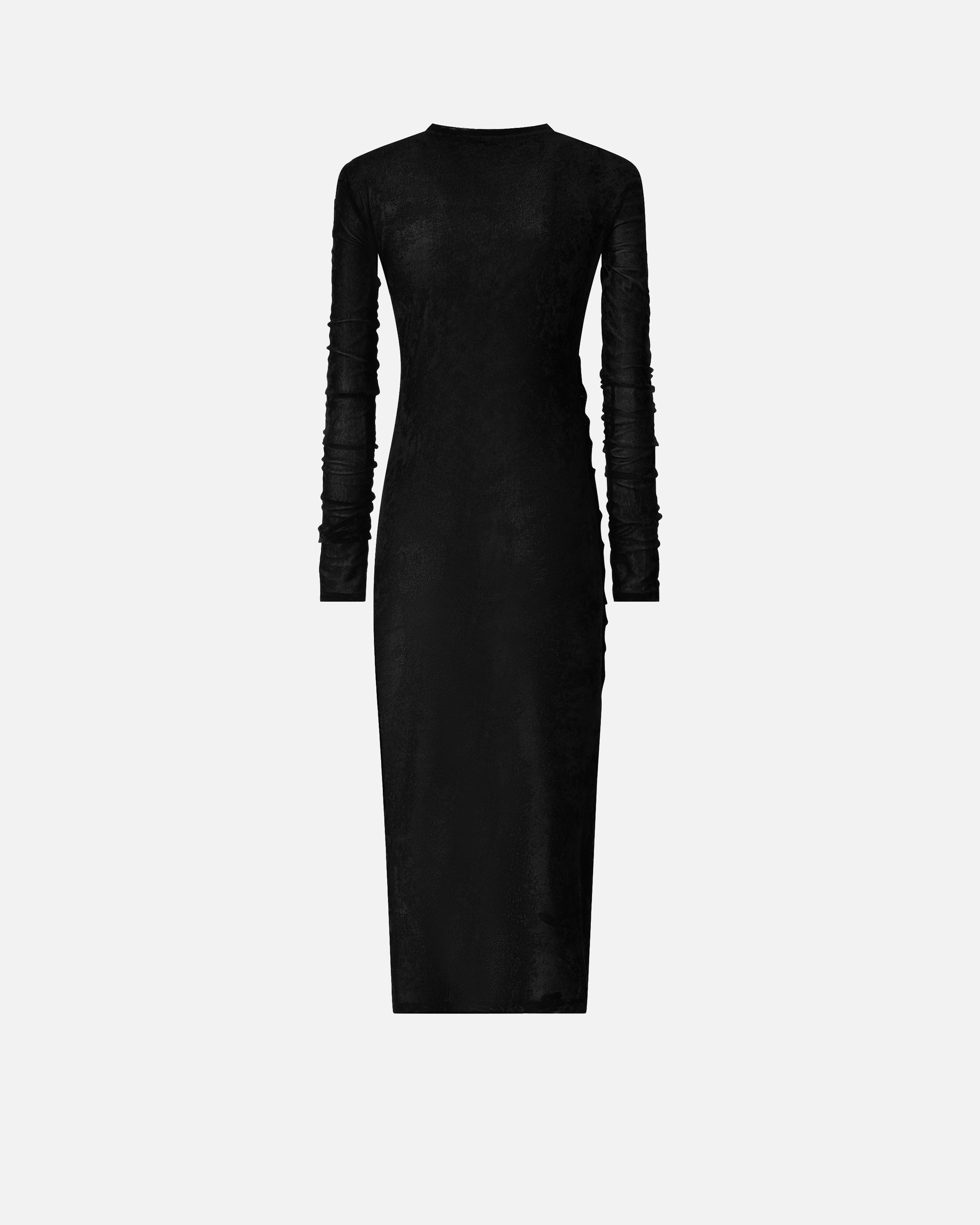 Long-sleeved, slim-fitting, crew-neck dress in super stretchy mesh tulle fabric. The processing the garment undergoes gives it the appearance of a hammered velvet while maintaining the comfort and elasticity of tulle. The buttons that create a pleated effect at the side and generous slit on the legs elevate the otherwise understated design and make it stand out. Be the star of the evening with this red carpet-ready look.