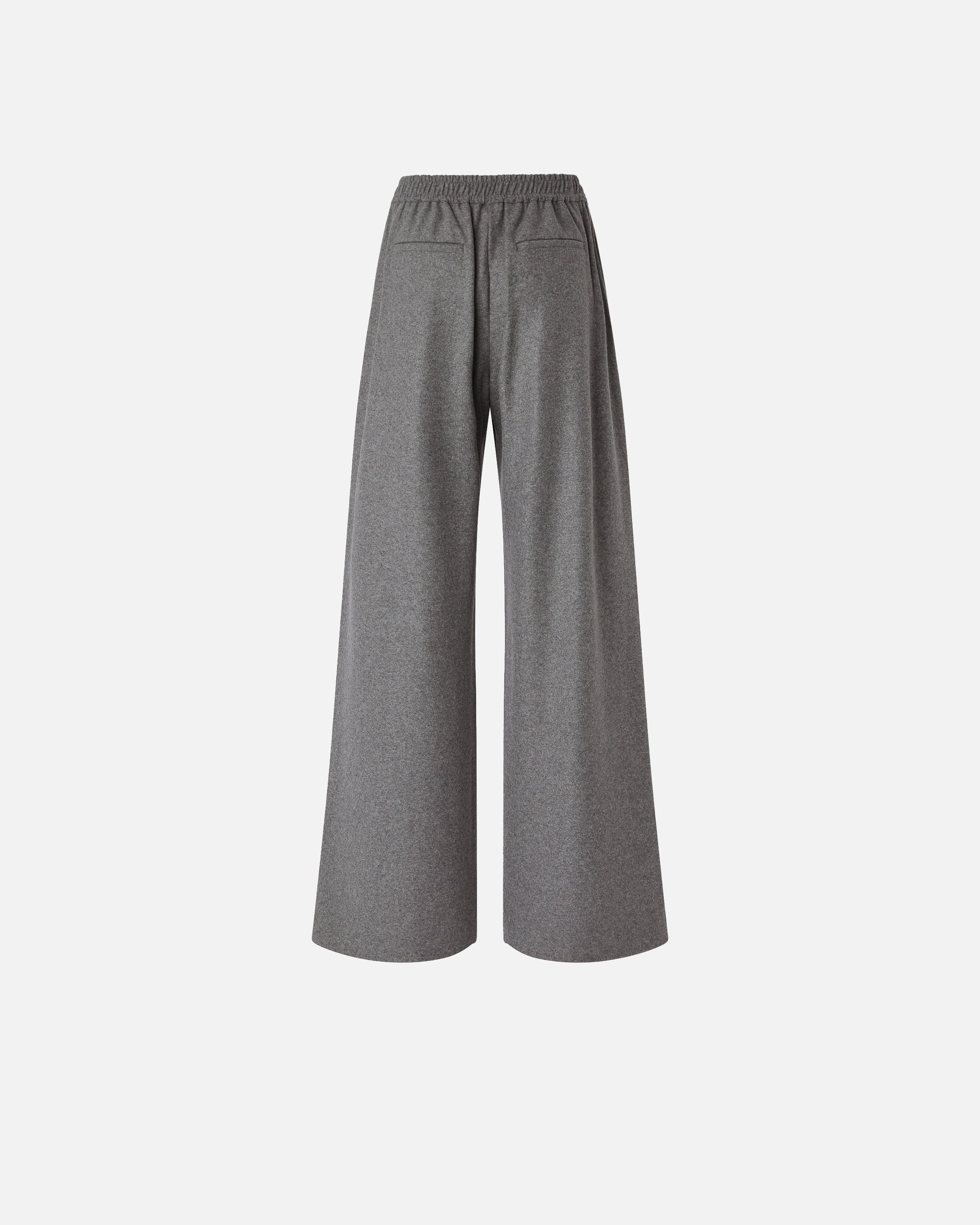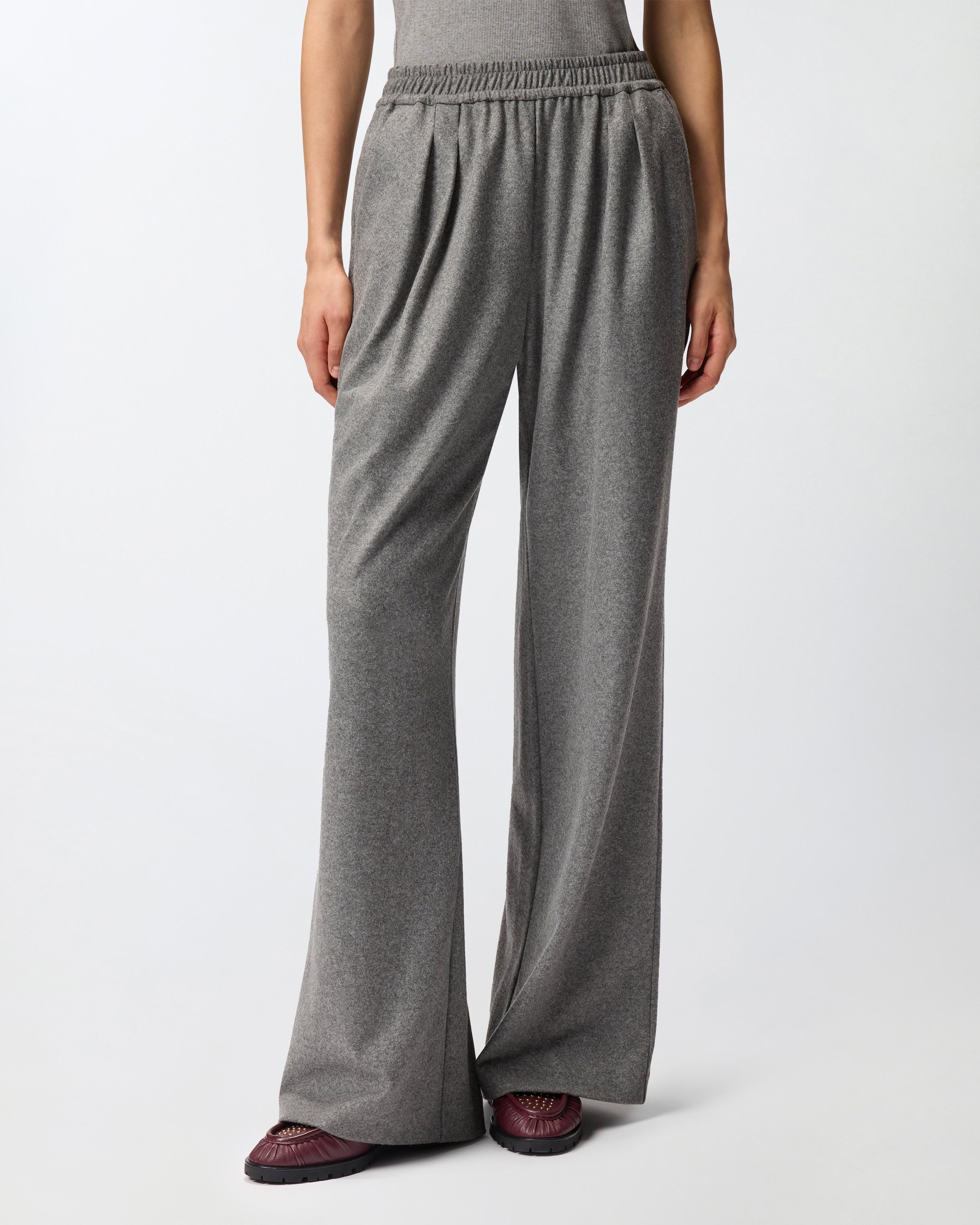 Long trousers made of yarn-dyed wool-blend jersey flannel, a fabric perfect for combining tailoring and comfort, and featuring a wide-leg silhouette with flared leg at the hem. The style combines sartorial style in the details of the rear welt pockets and the typical French pocket, with the sporty comfort of the gathered waist with elastic. Wide-leg trousers are the new must-haves of formal and elegant looks, whether for broken looks or for a new suit concept.