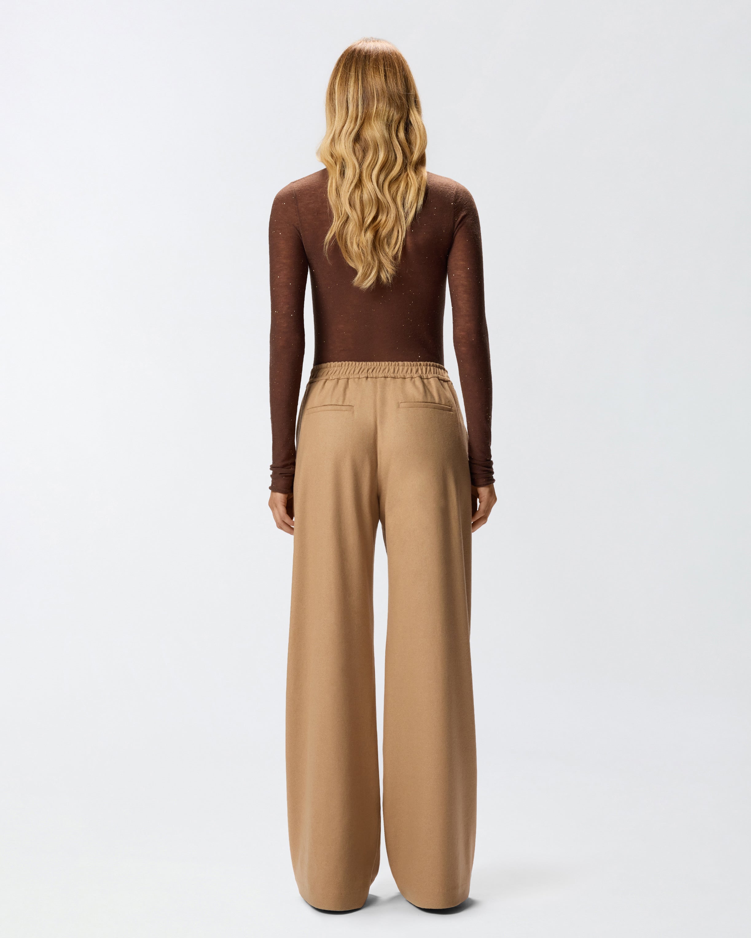 Long trousers made of yarn-dyed wool-blend jersey flannel, a fabric perfect for combining tailoring and comfort, and featuring a wide-leg silhouette with flared leg at the hem. The style combines sartorial style in the details of the rear welt pockets and the typical French pocket, with the sporty comfort of the gathered waist with elastic. Wide-leg trousers are the new must-haves of formal and elegant looks, whether for broken looks or for a new suit concept.