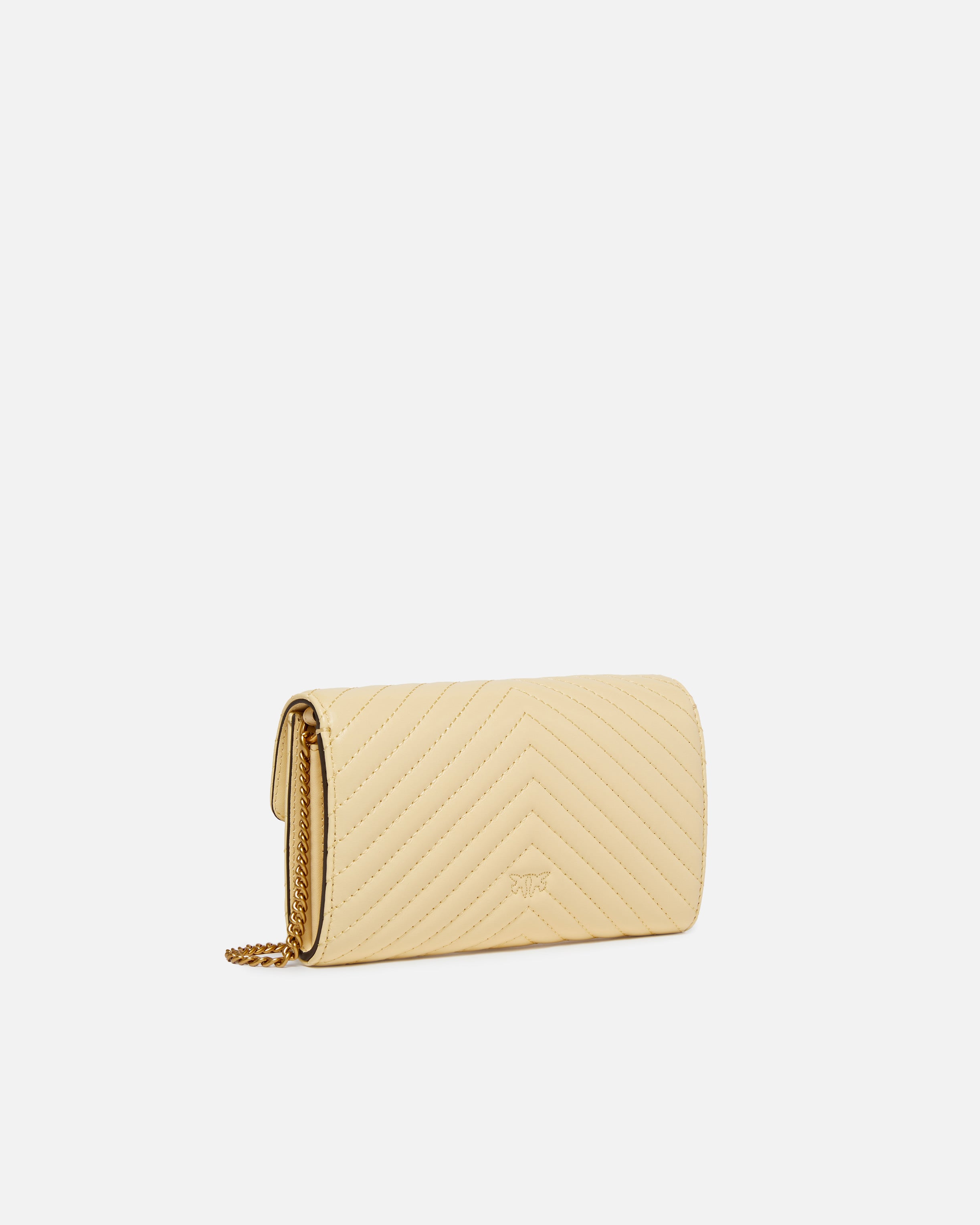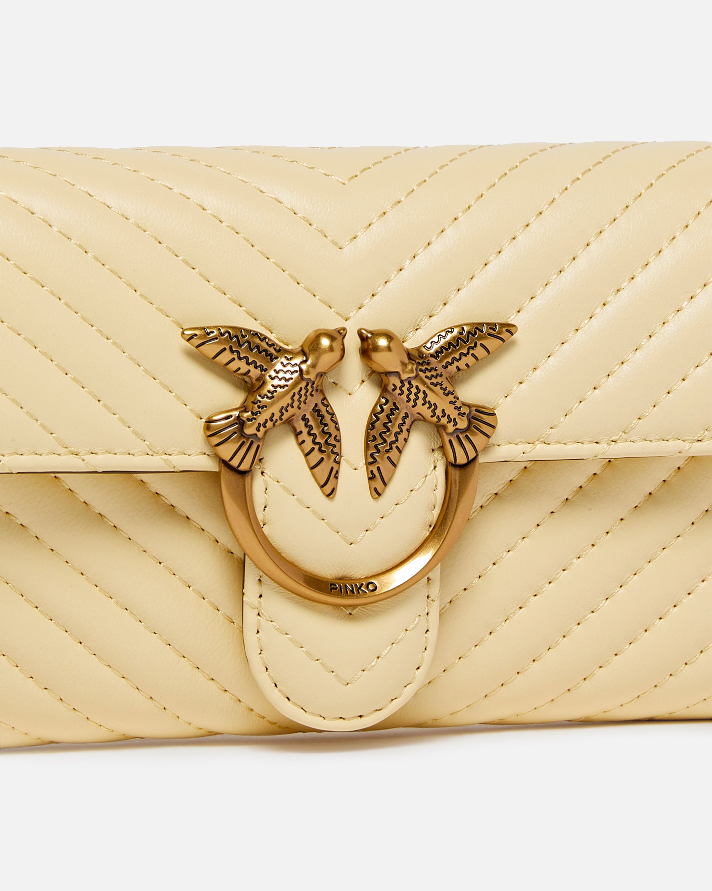 Quilted nappa leather Love Bag purse with chevron design and shoulder strap. The concealed-button fastening is embellished by the iconic Love Birds Diamond Cut buckle. The polycotton-lined interior is divided into four compartments, one of which is zipped and two of which have card slots. The removable, round-link metal-chain shoulder strap allows you to wear the purse like a crossbody bag.