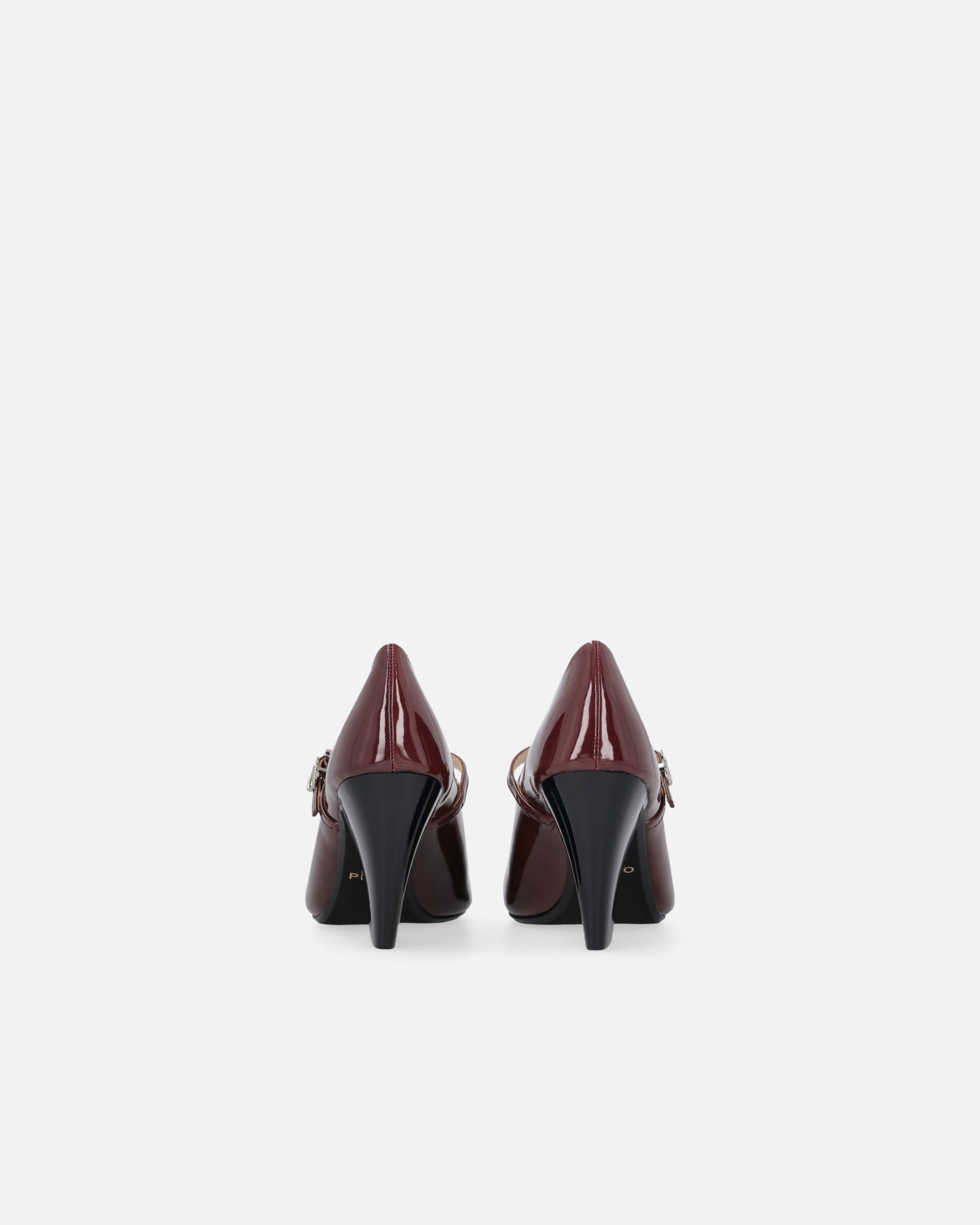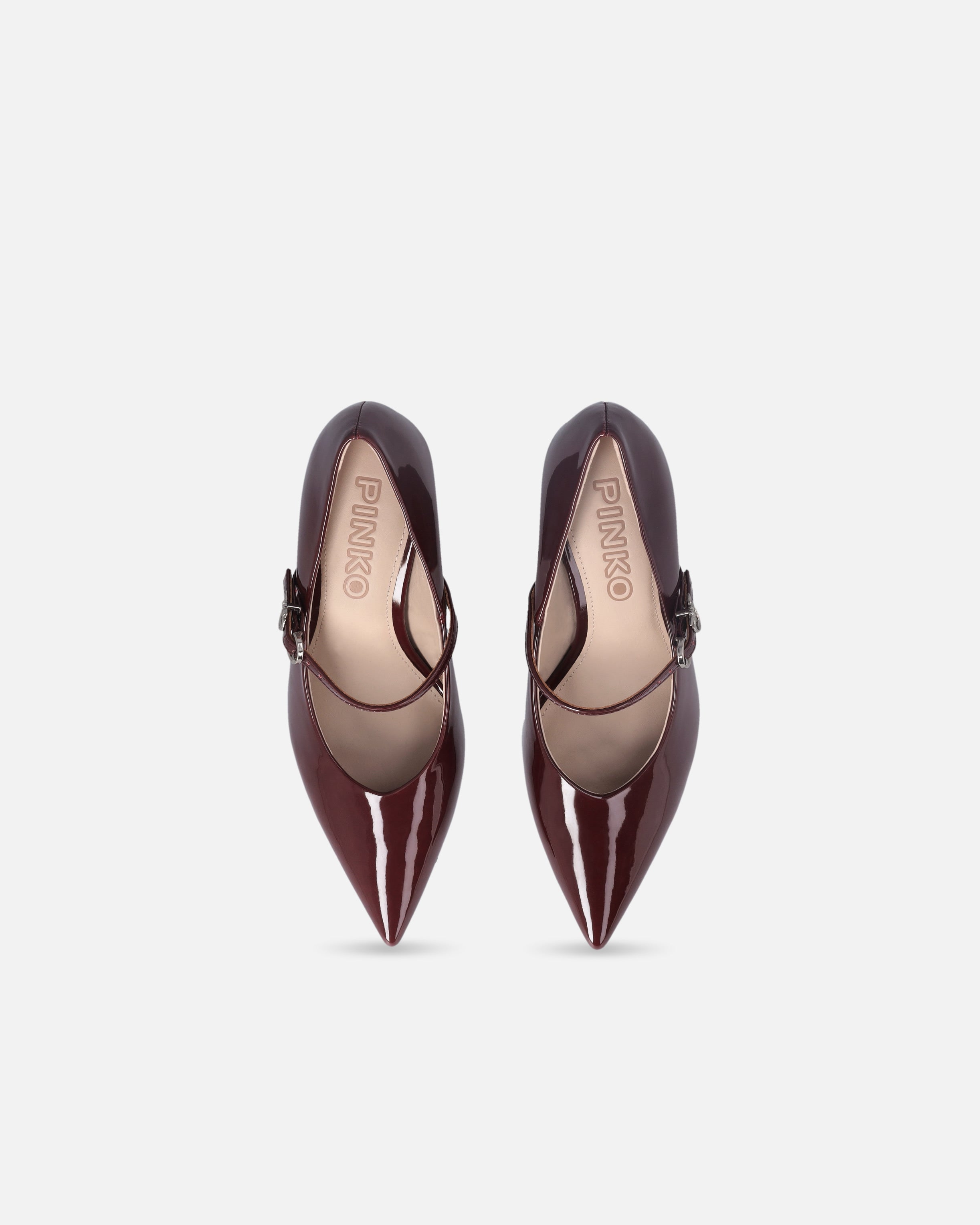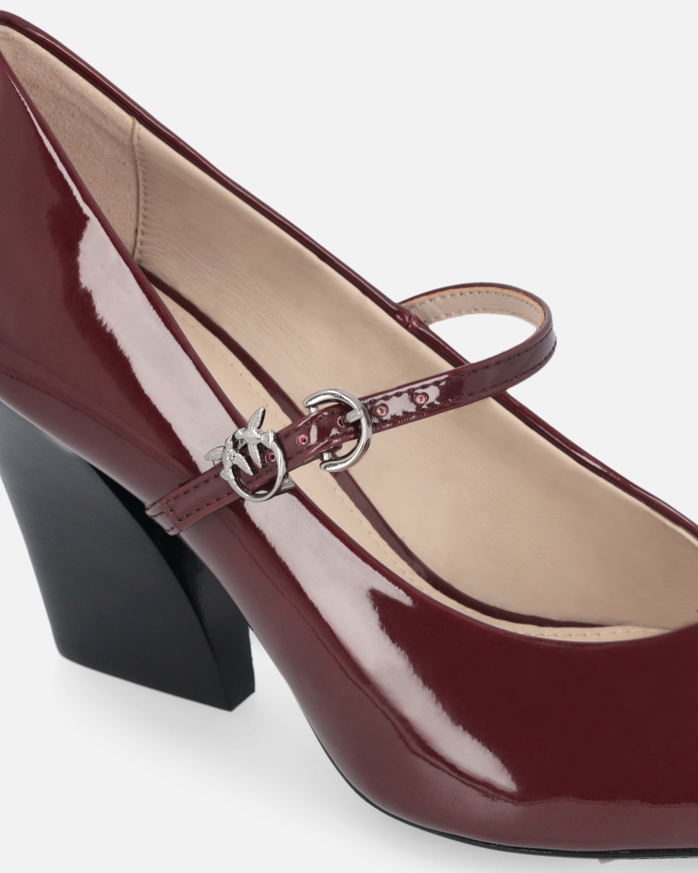 Patent-effect pointed-toe Mary Janes with 8 cm-high block heel. These shoes are fastened with a very elegant thin strap with buckle, accompanied by the iconic Love Birds logo. The asymmetric design gives the shoe an elegant and contemporary appearance, ideal for those after the perfect balance between unique style and comfort. Pair these shoes with a sophisticated skirt for an unforgettable day-to-night look.